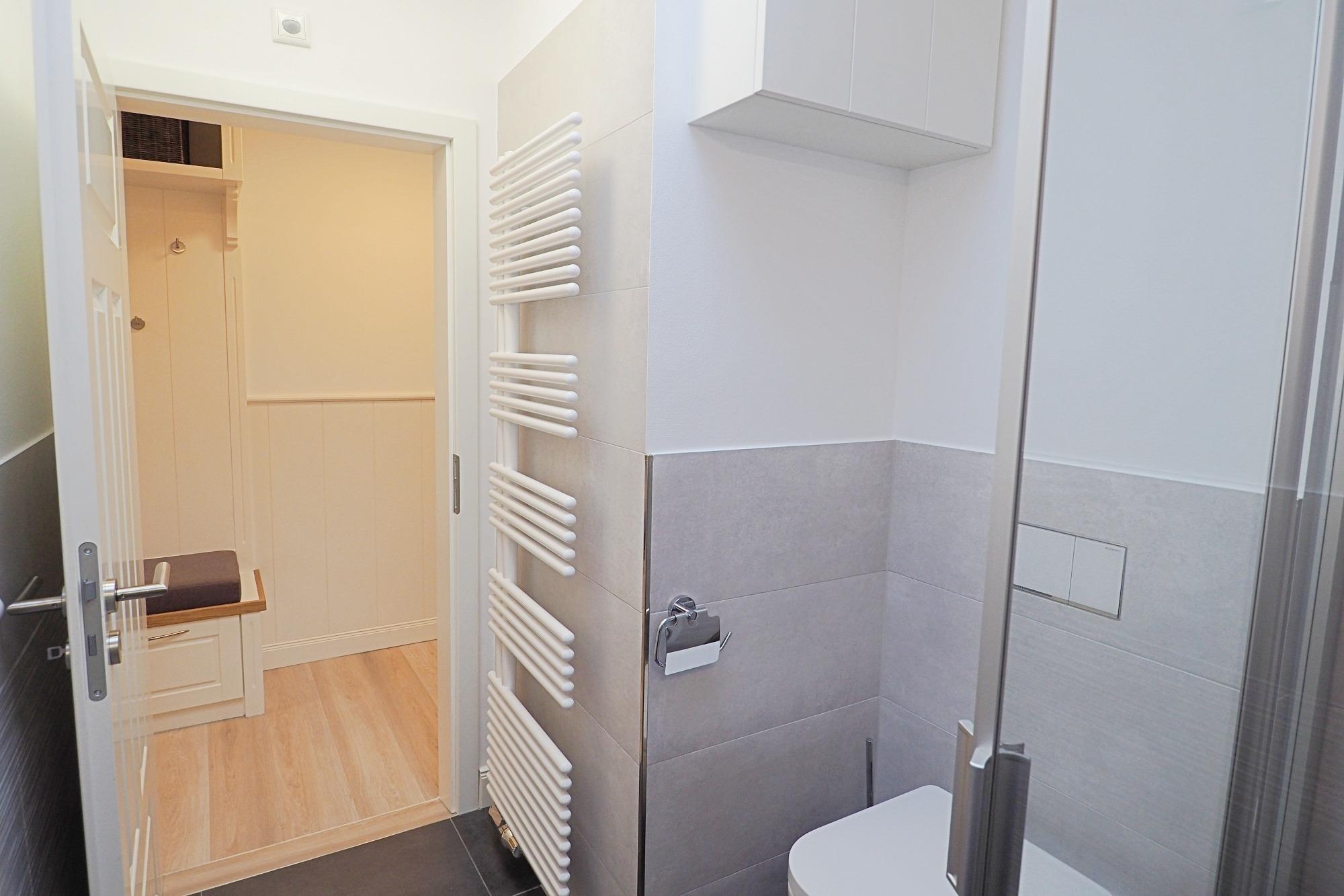 Das helle Badezimmer besticht mit einer Regendusche und elektrischem Kuppelfenster.