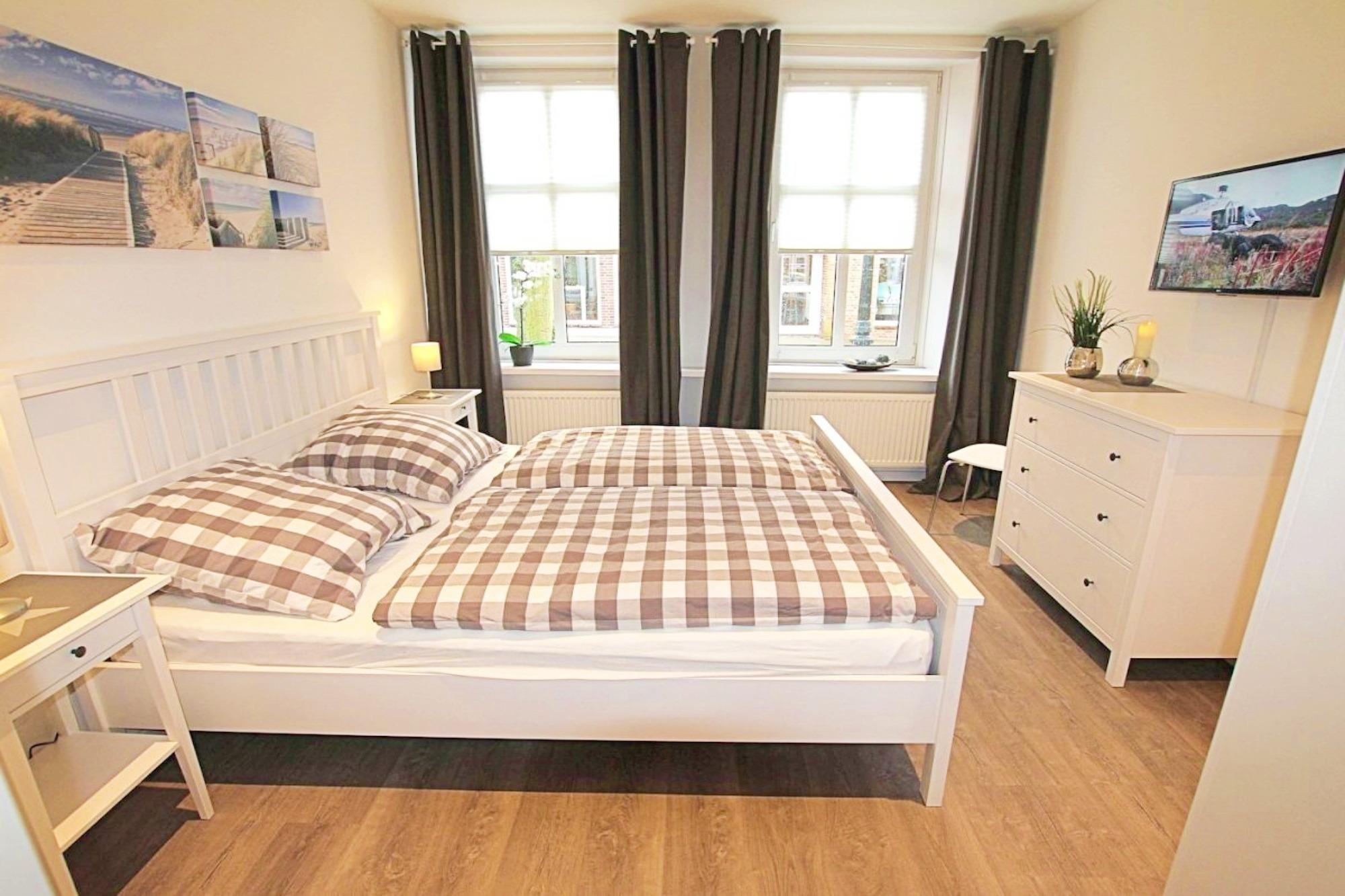 Die zwei separaten Schlafzimmer mit jeweils einem Doppelbett (1,80m x 2,00m) und 2 Einzelbetten (1,00m x 2,00m), Kleiderschrank und Kommode, liegen in Richtung Fußgängerzone. In einem der beiden Schlafzimmer befindet sich ein extra TV.