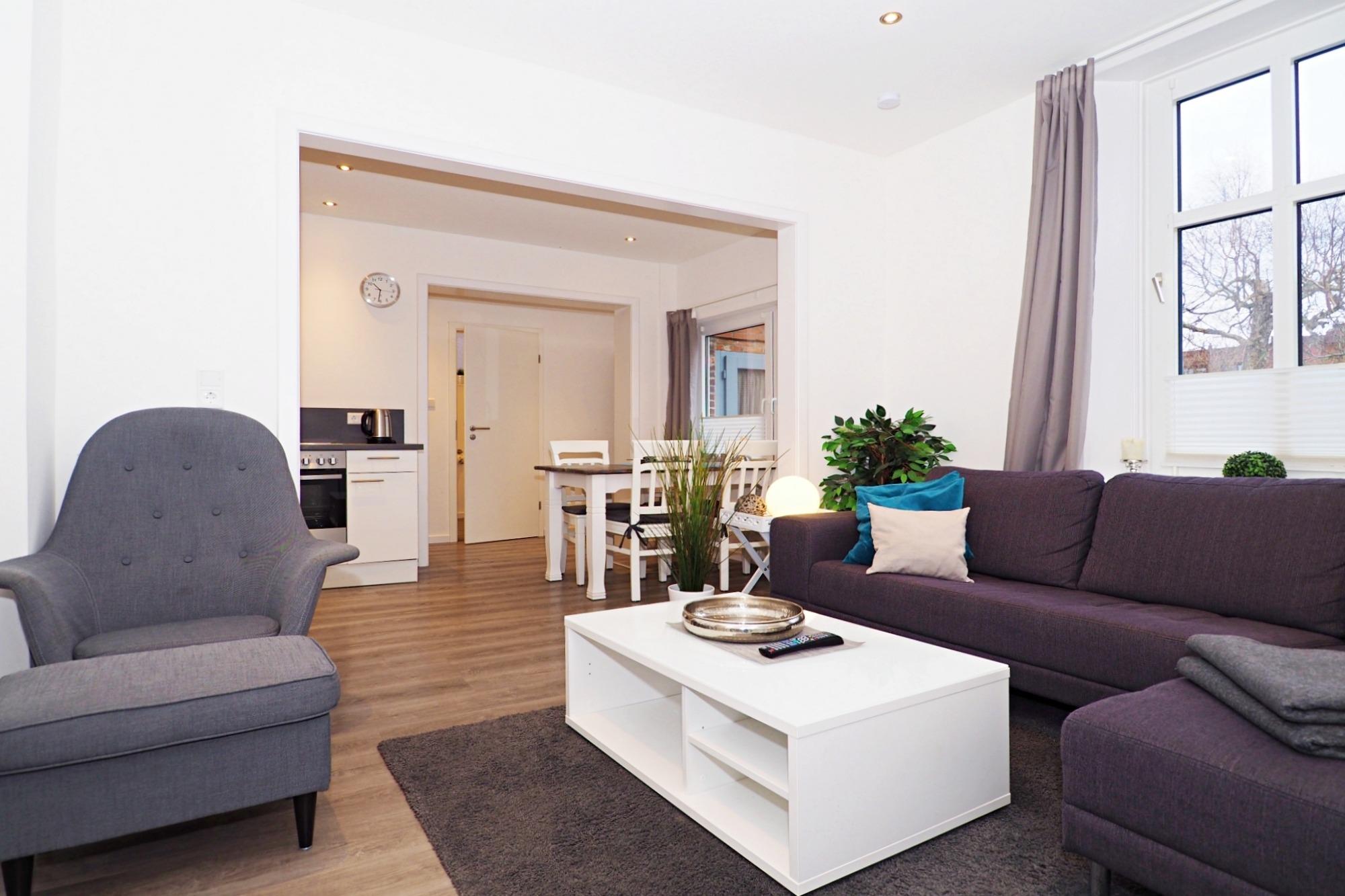 Diese stilvoll und gemütlich eingerichtete Ferienwohnung für bis zu 4 Personen (ca. 65 qm) verfügt über einen offenen, großzügigen Wohn- und Essbereich.