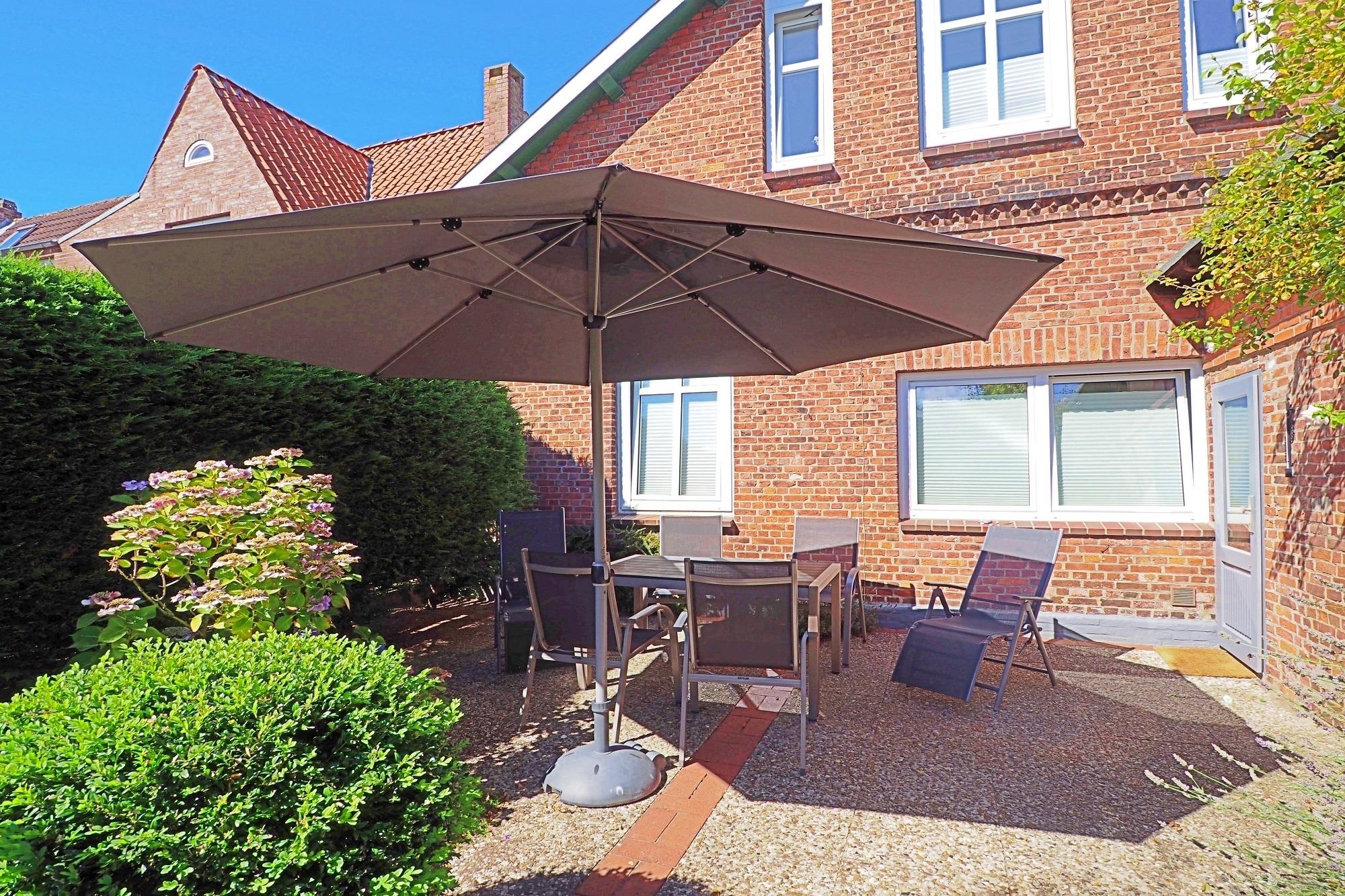 Im Garten des Hauses haben Sie Ihre eigene Terrasse mit Terrassenmöbeln und Sonnenschirm.