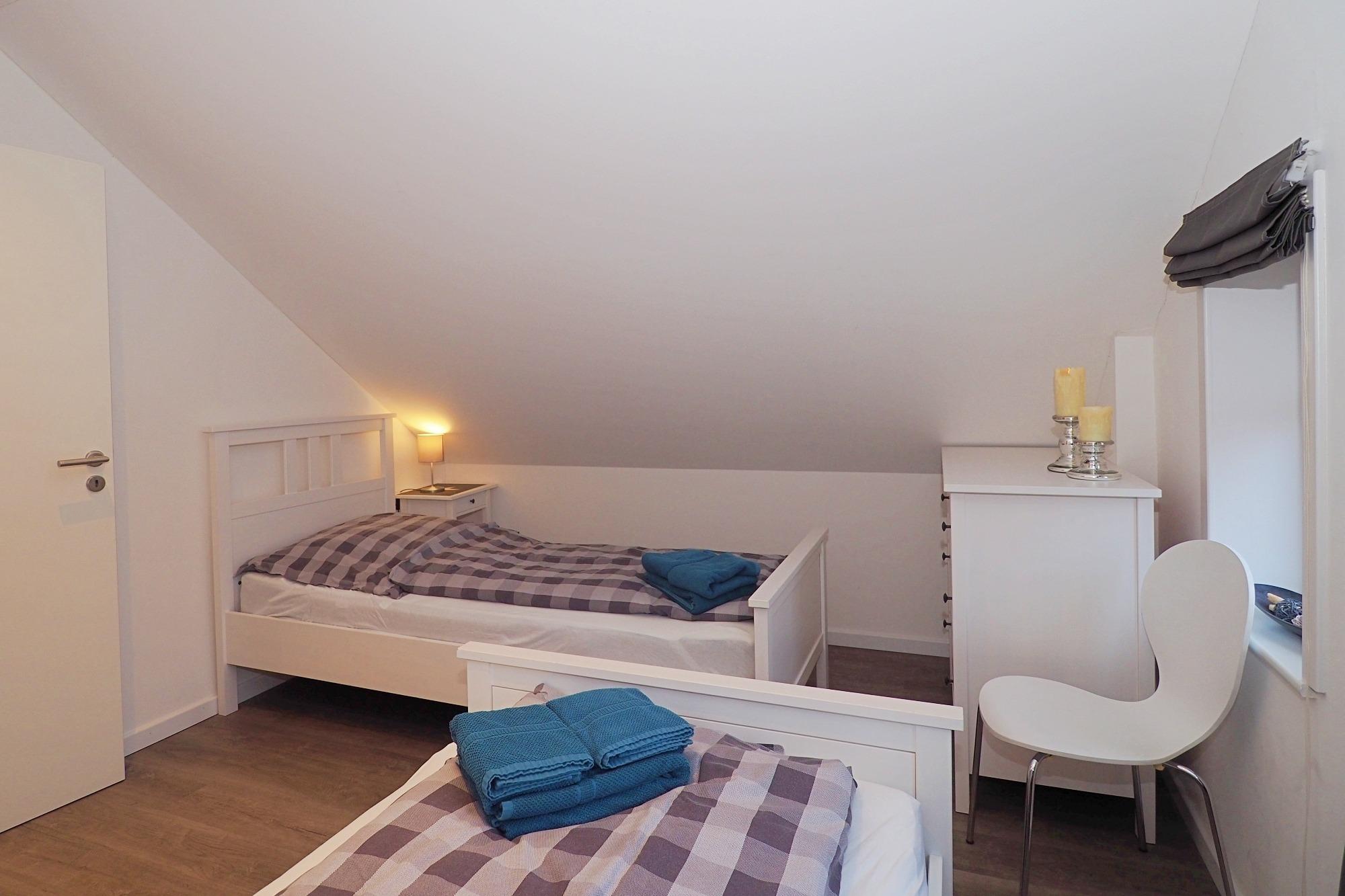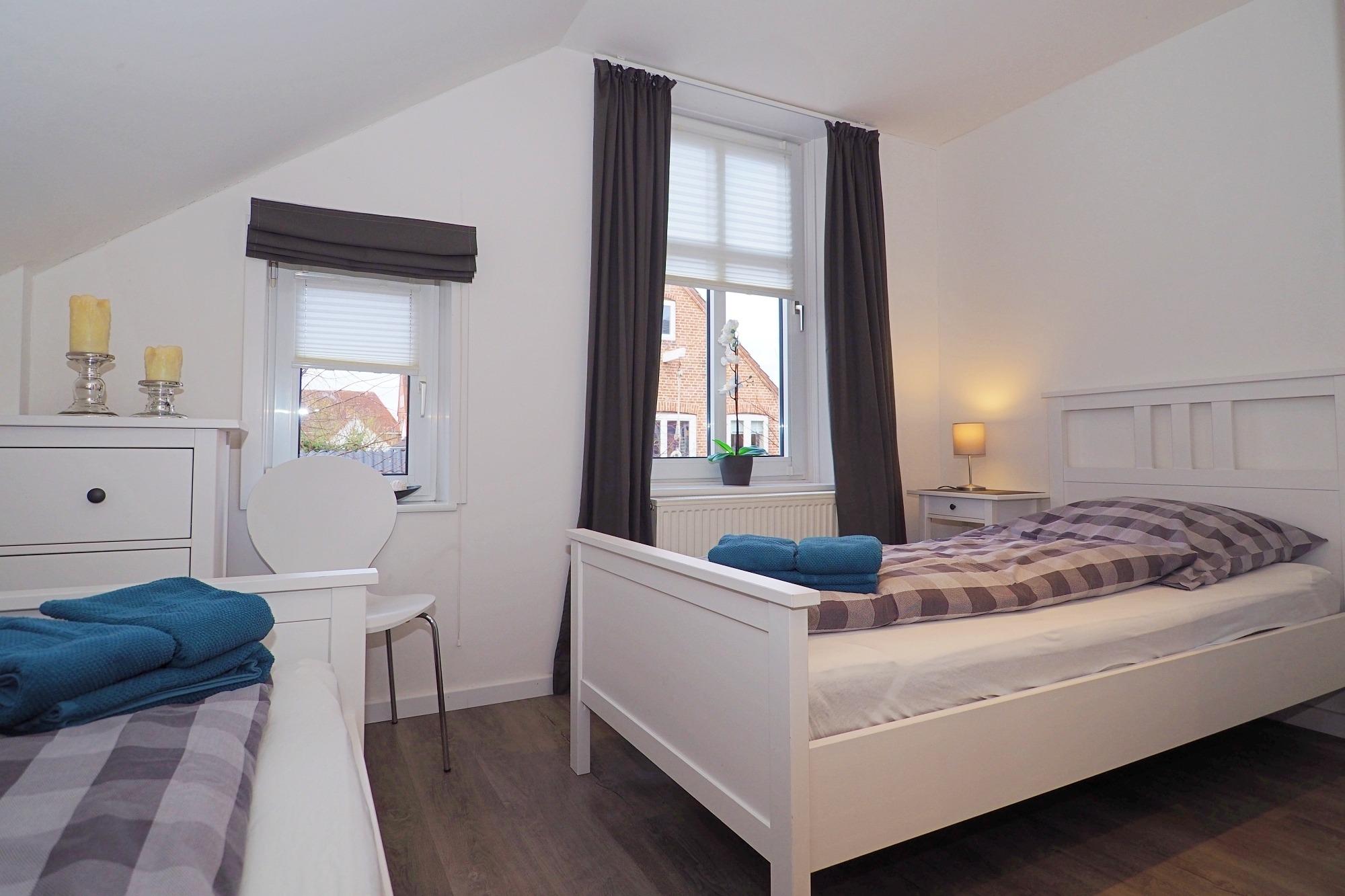 Die zwei separaten Schlafzimmer mit jeweils einem Doppelbett (1,80m x 2,00m) und 2 Einzelbetten (1,00m x 2,00m), Kleiderschrank und Kommode, liegen in Richtung Fußgängerzone. In einem der beiden Schlafzimmer befindet sich ein extra TV.