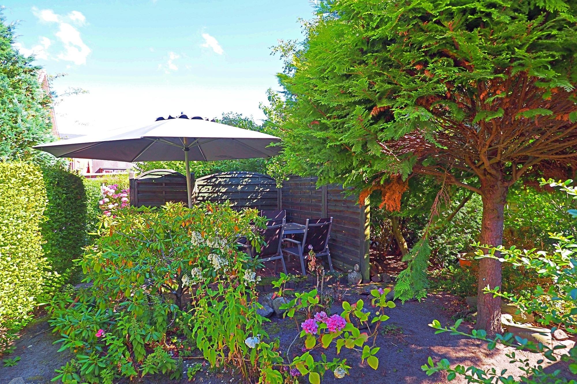 Im Garten des Hauses haben Sie Ihre eigene Terrasse mit Terrassenmöbeln und Sonnenschirm.