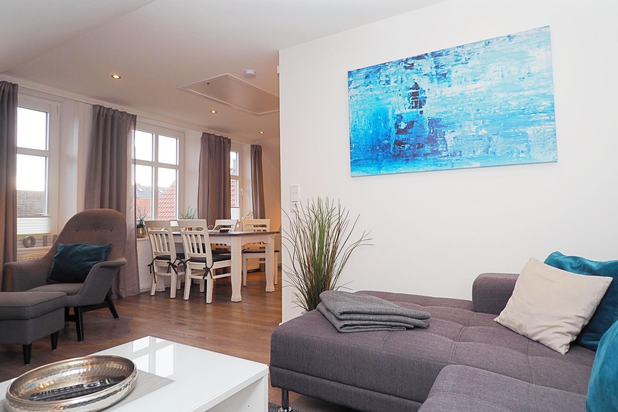 Diese stilvoll und gemütlich eingerichtete Ferienwohnung für bis zu 4 Personen (ca. 50 qm) verfügt über einen offenen und großzügigen Wohn- und Essbereich.