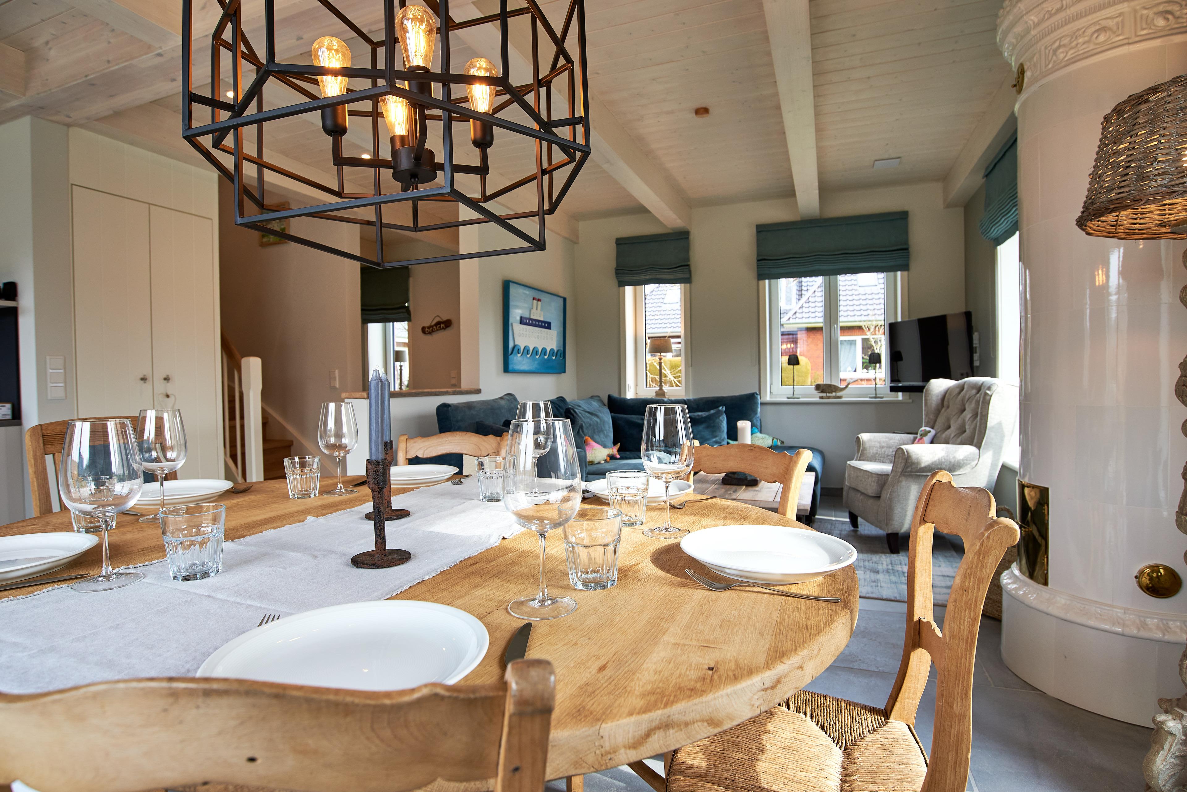 Die DHH ist ca. 100 qm groß und bietet 3 Schlafzimmer für insgesamt 5 Personen. Zwei helle freundliche Badezimmer mit Duschbereich sorgen dafür, dass es am Morgen nicht zu Wartezeiten kommt. Im gemütlich eingerichteten Wohn- Esszimmer befindet sich die modern eingerichtete Küche in der Sie alles finden, was für einen gelungenen Urlaub nötig ist. Ein Mylinkachelofen, der mit Bioethanol befeuert wird, gehört ebenfalls zur Ausstattung des Wohnzimmers. Von der Küche aus haben Sie Zugang zur Terrasse. Zur Küche gehört ein Hauswirtschaftsraum mit Waschmaschine und Trockner. Im 1. Obergeschoss befinden sich alle drei Schlafzimmer (1 x Doppelbett, 2 x Einzelbett und 1 x Einzelbett) sowie das große Badezimmer. Das zweite Badezimmer befindet sich im Erdgeschoss. Im Dachgeschoss befindet sich eine Sauna für die kalten Tage. Dieses Haus ist somit gerade für große Familien gut geeignet. Ein PKW-Stellplatz befindet sich direkt am Haus.