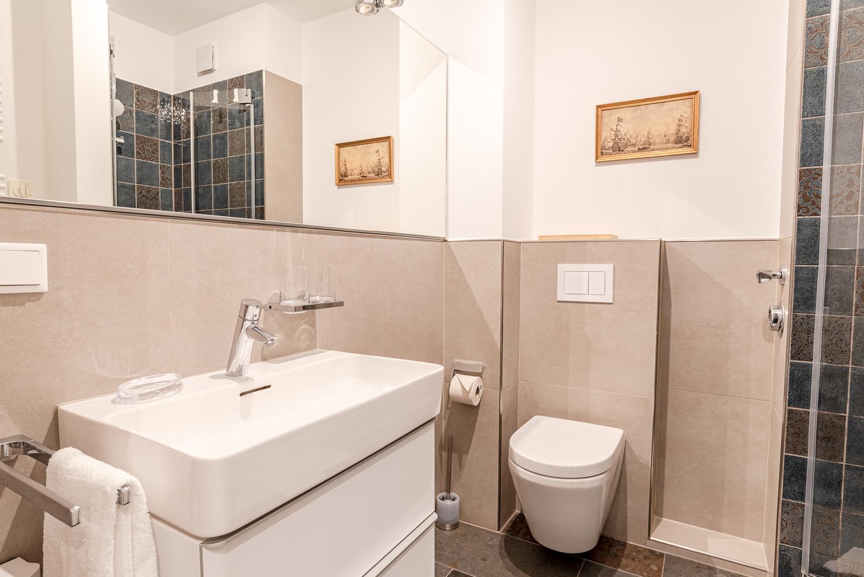 Das luxuriöse Badezimmer erwartet Sie mit geschmackvollen Fliesen aus Naturstein und einem formschönen Waschtisch mit viel Stauraum. Die Fußboden-Heizung und ein Handtuchheizkörper sorgen für wohlige Wärme.