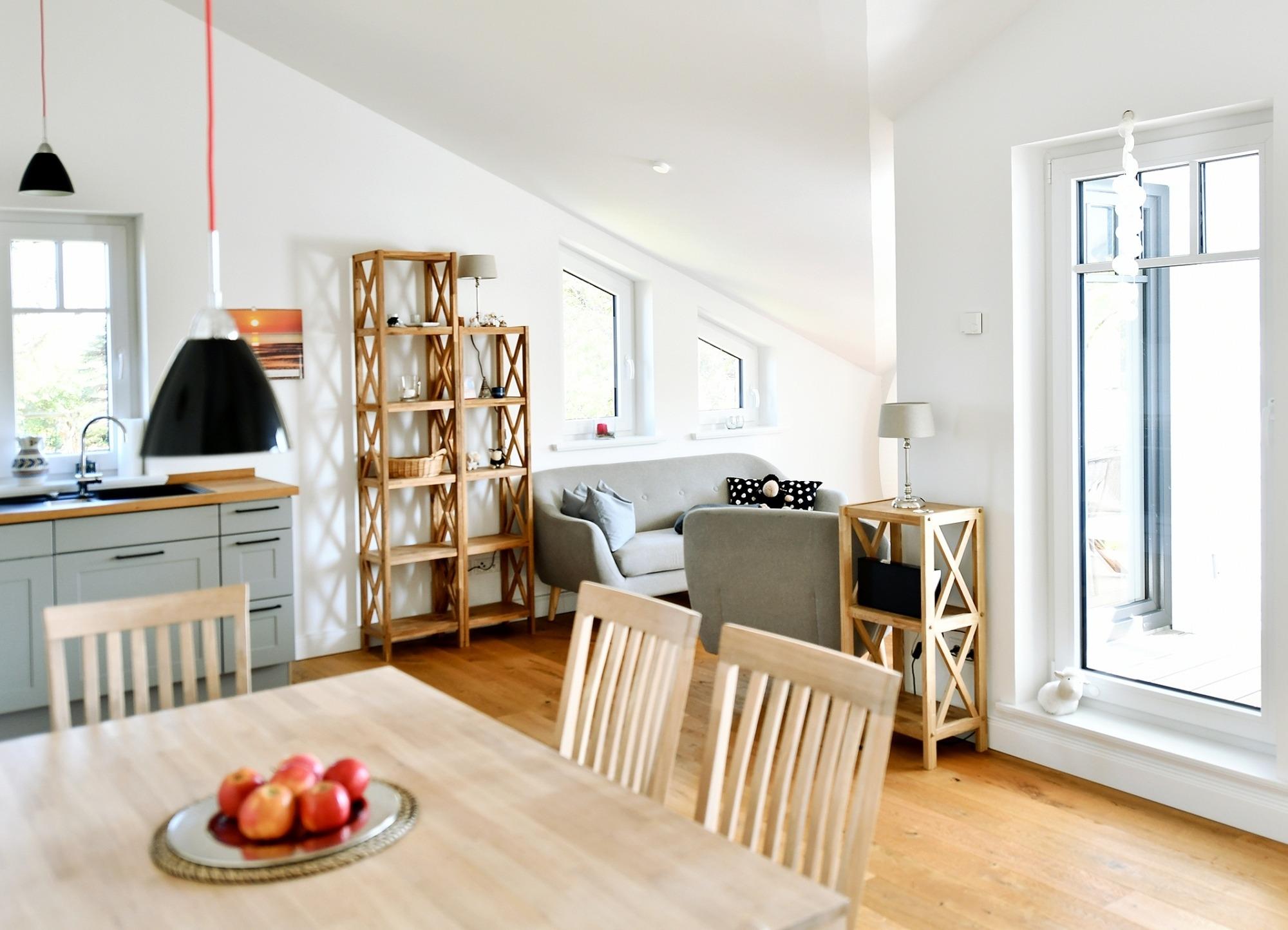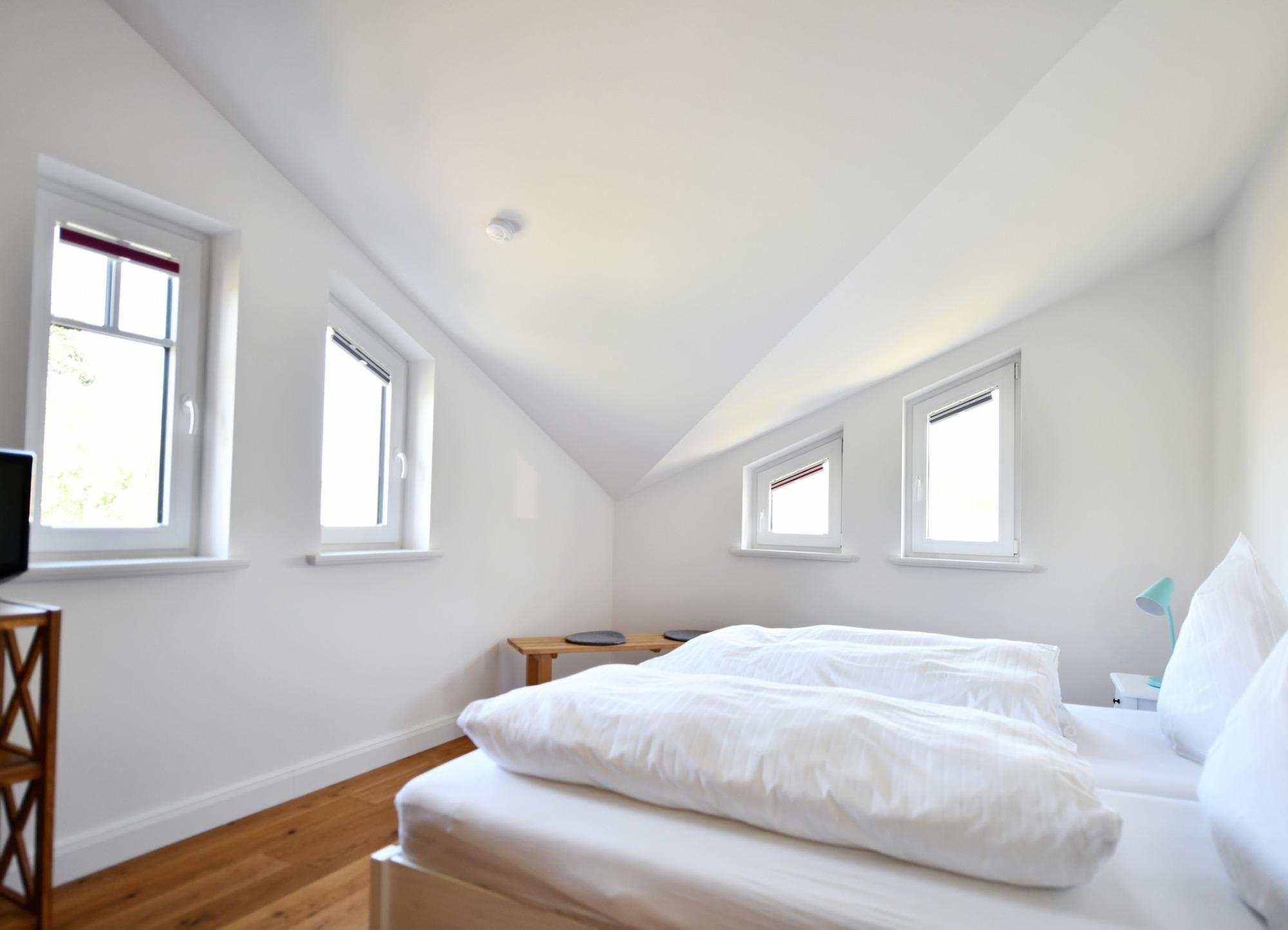 Die Ferienwohnung liegt im Dachgeschoss des Neubaus mit zwei Wohneinheiten, wobei jede ihren separaten Eingang hat.