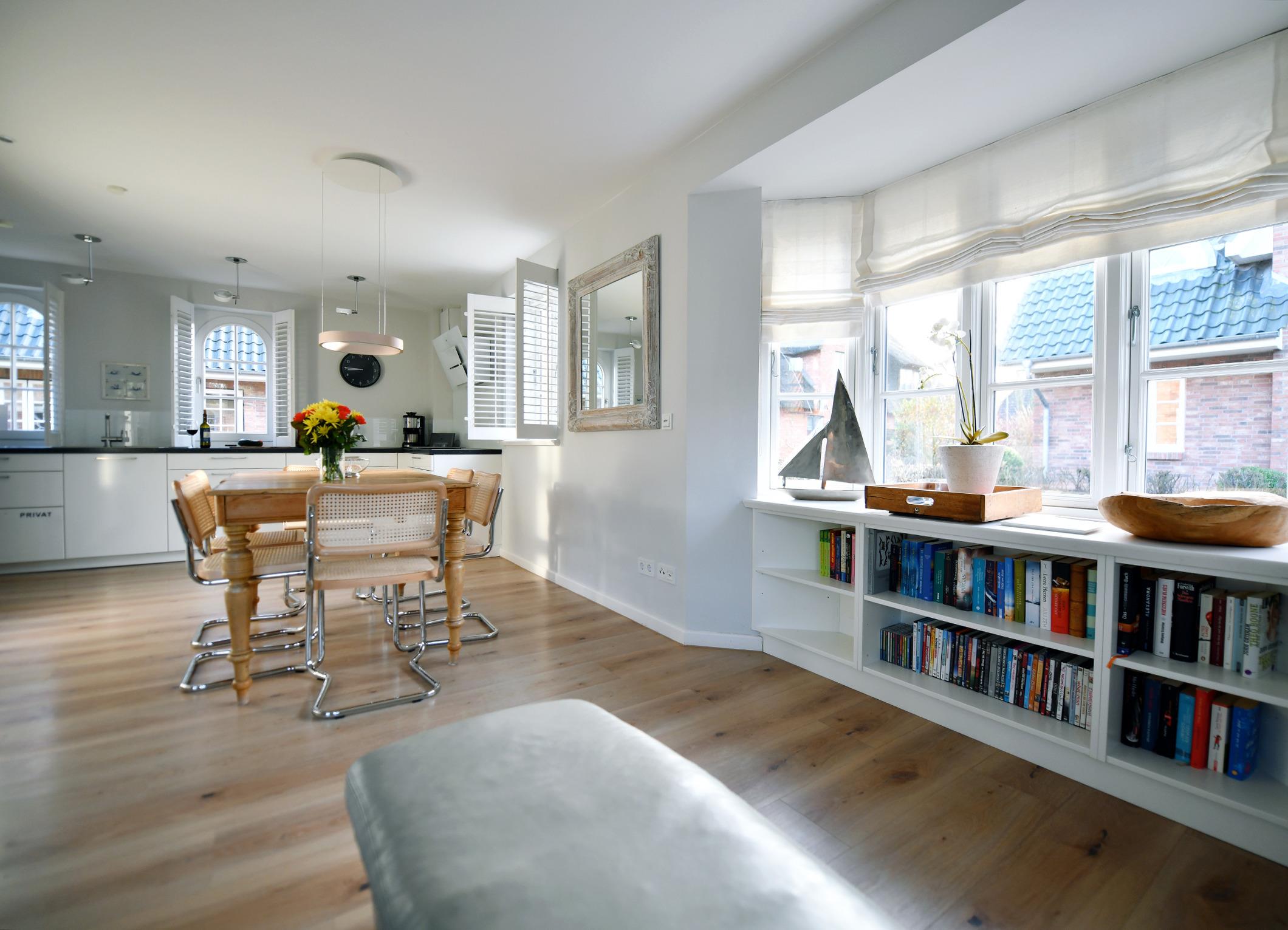Die Strandhütte ist modern und zeitlos eingerichtet. Sie können sich z. B. auf einen schönen, offenen, kommunikativen Koch- und Essbereich mit einer modernen Einbauküche - mit Induktionsherd - freuen. Dazu auf einen großzügigen, komfortablen Wohnbereich mit einem antiken Kaminofen. Und auf bequeme Boxsprint-Betten in den beiden Schlafzimmern im OG. Außerdem erwarten Sie in der Strandhütte: Insgesamt 3 elegante Duschbäder, eine Wellness-Oase im UG sowie zwei sonnige Terrassen mit einem Luxus-Strandkorb und Garten. Wallbox am Parkplatz.