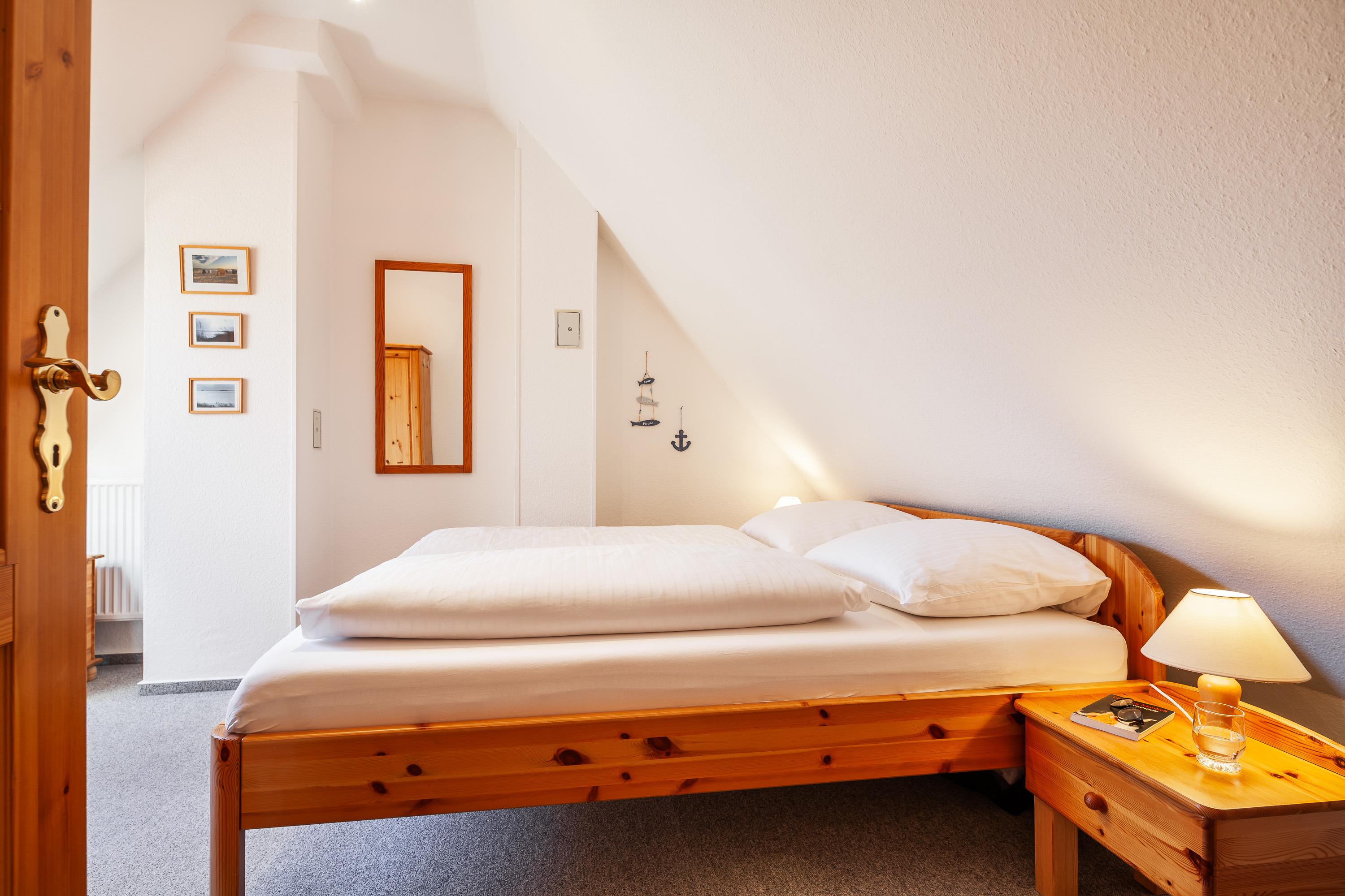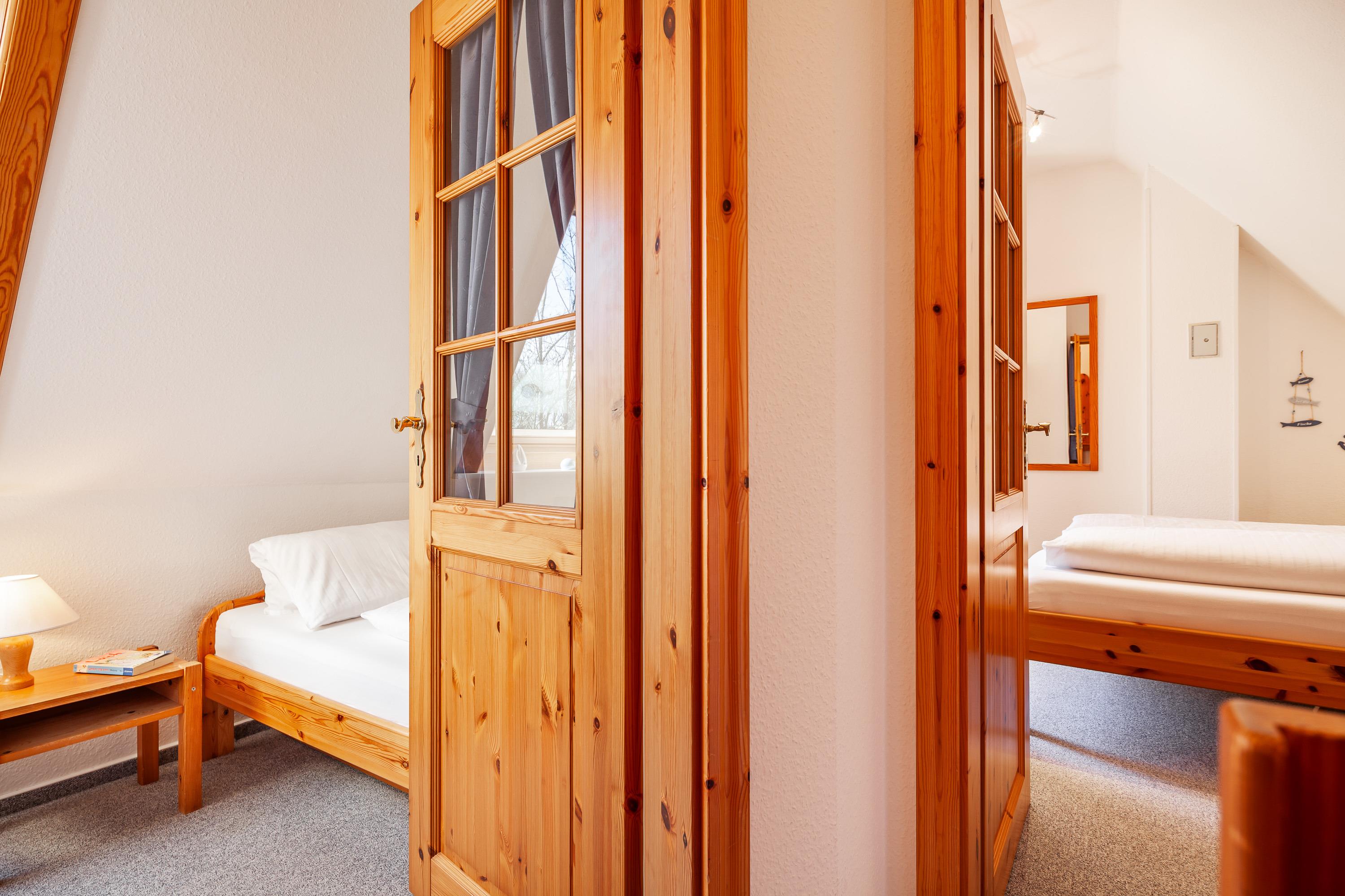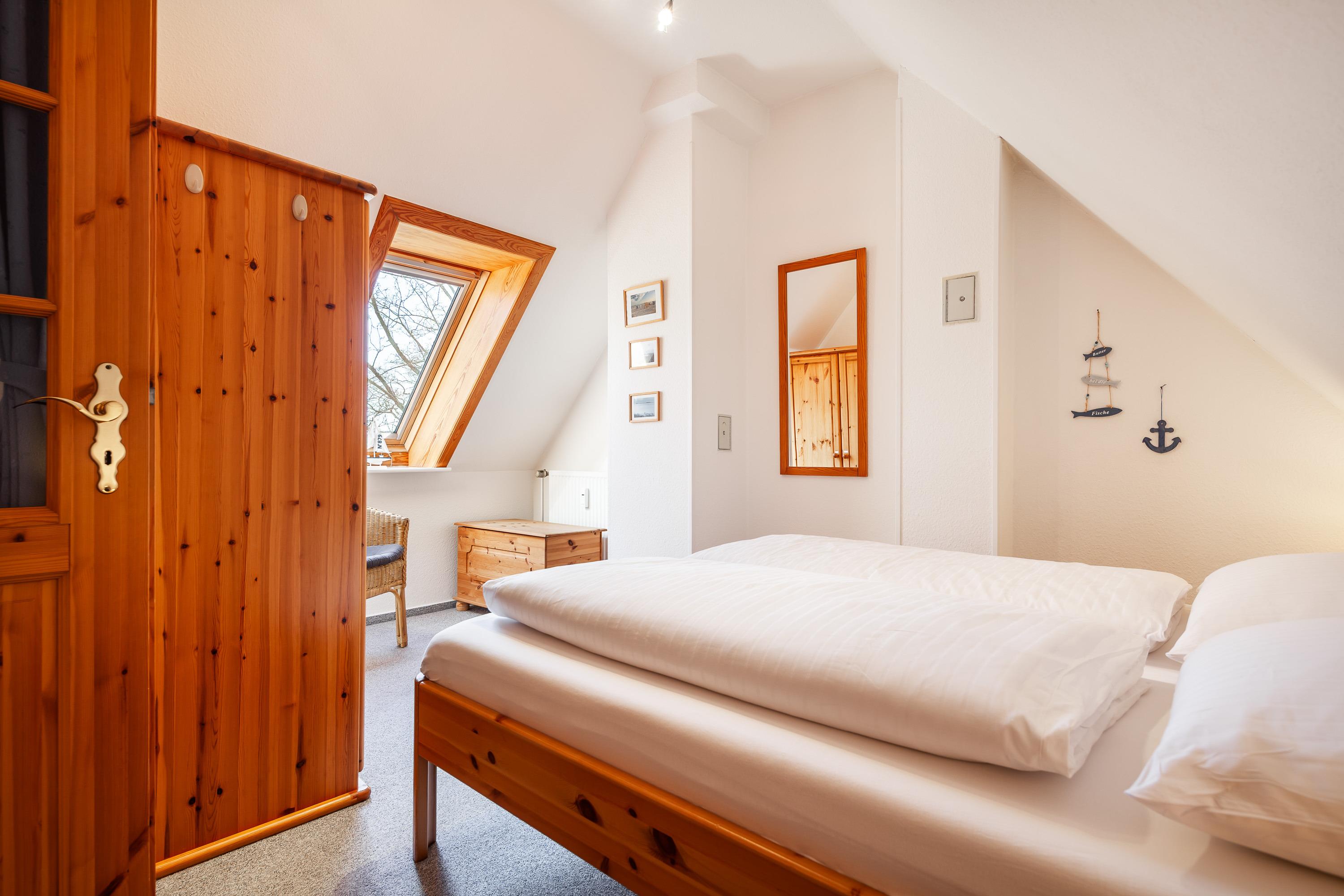 Die Ferienwohnung verfügt über zwei Schlafzimmer, eines mit Einzelbett, das andere Schlafzimmer mit Doppelbett. Beide [nbsp]befinden sich im Dachgeschoss der Wohnung.