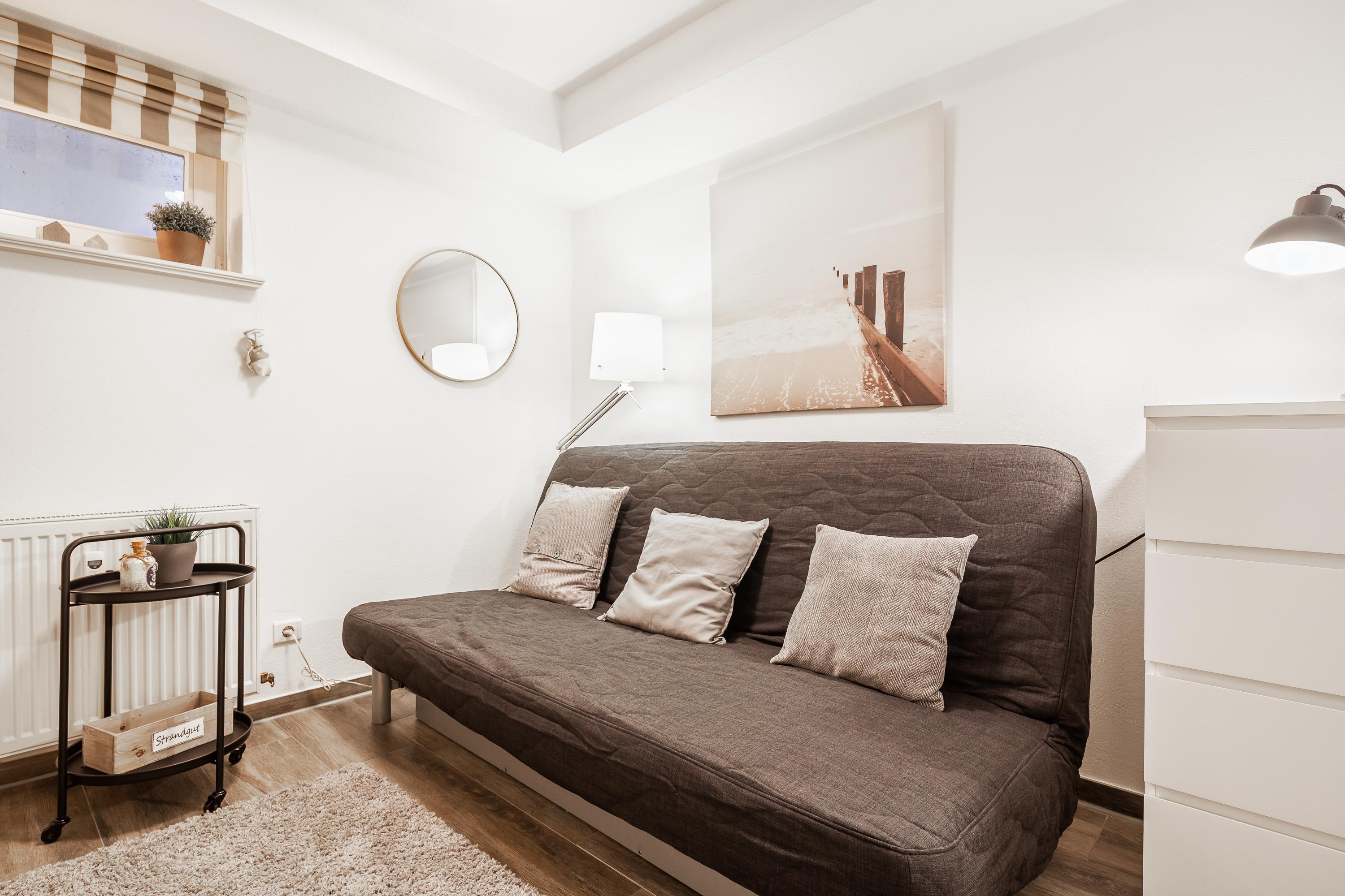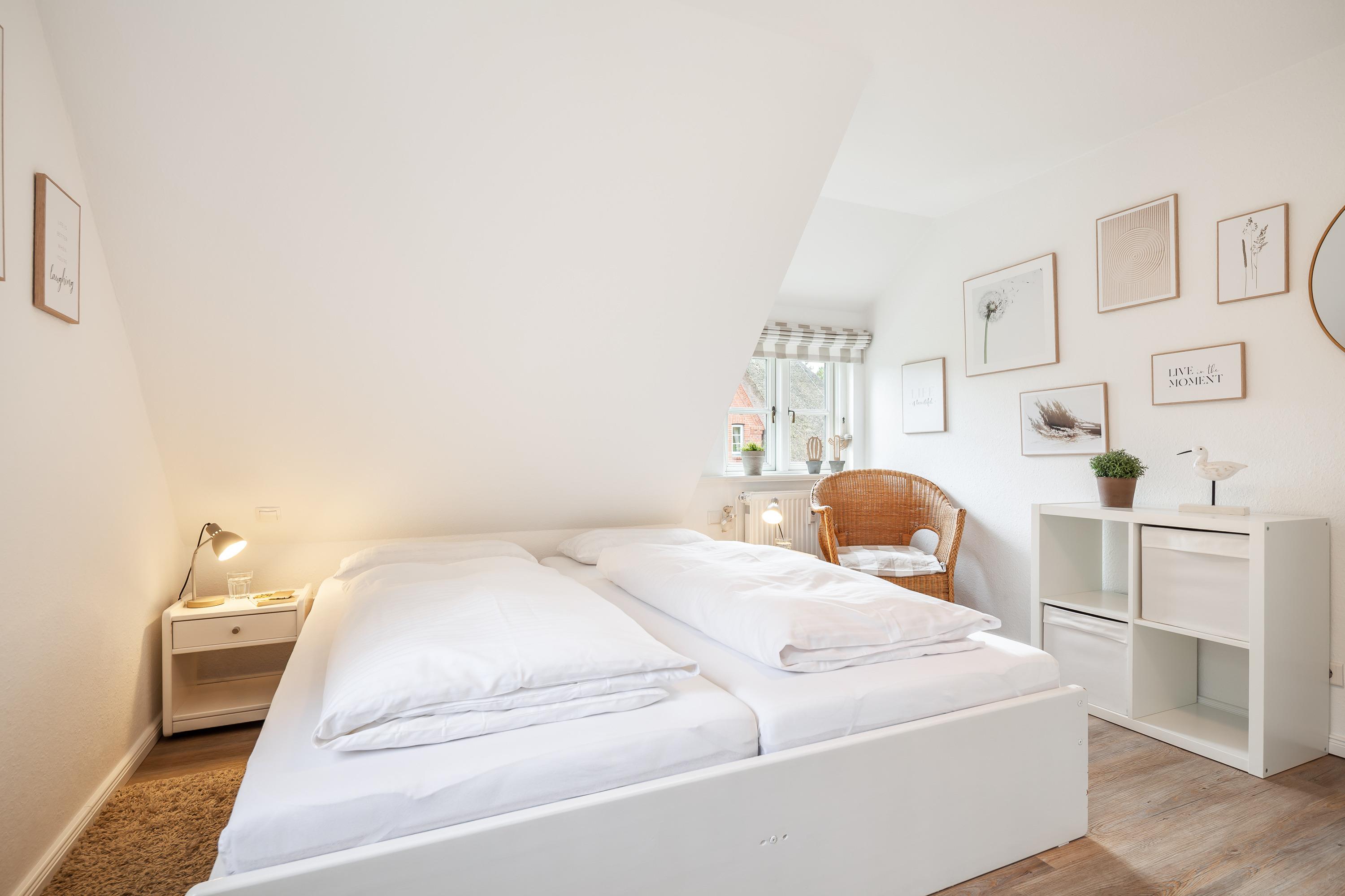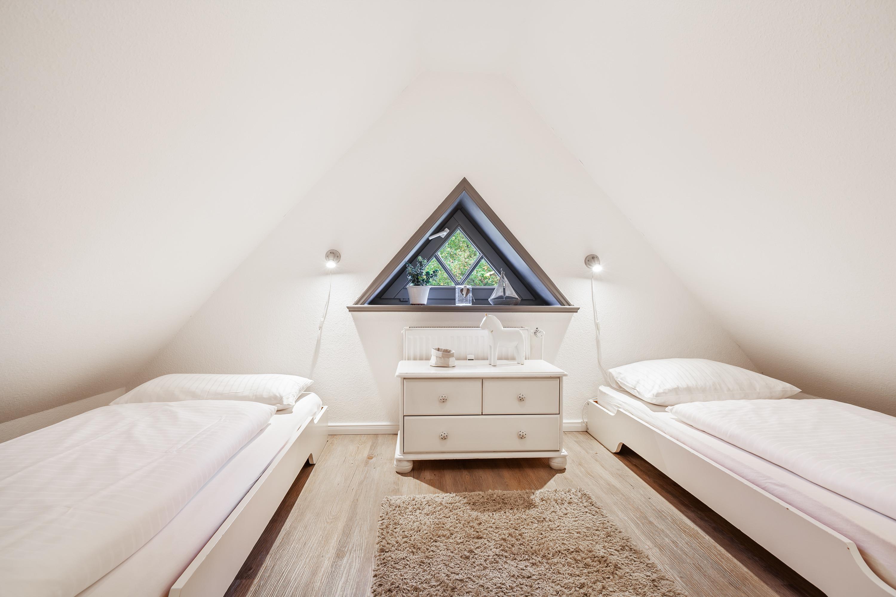 Das behagliche Doppelschlafzimmer, das Duschbad mit WC und ein separates [nbsp]WC erwarten Sie auf der oberen Etage. Zwei weitere Betten befinden sich im heimeligen Spitzboden. Zu der Ferienwohnung gehört eine eigene Sonnenterrasse mit Gartenmöbeln und Strandkorb sowie ein PKW-Stellplatz auf dem Grundstück. Die Gemeinschaftsanlagen wie Sauna, Solarium, Waschmaschine und Trockner, können Sie gegen eine kleine Gebühr (Münzeinwurf) nutzen.