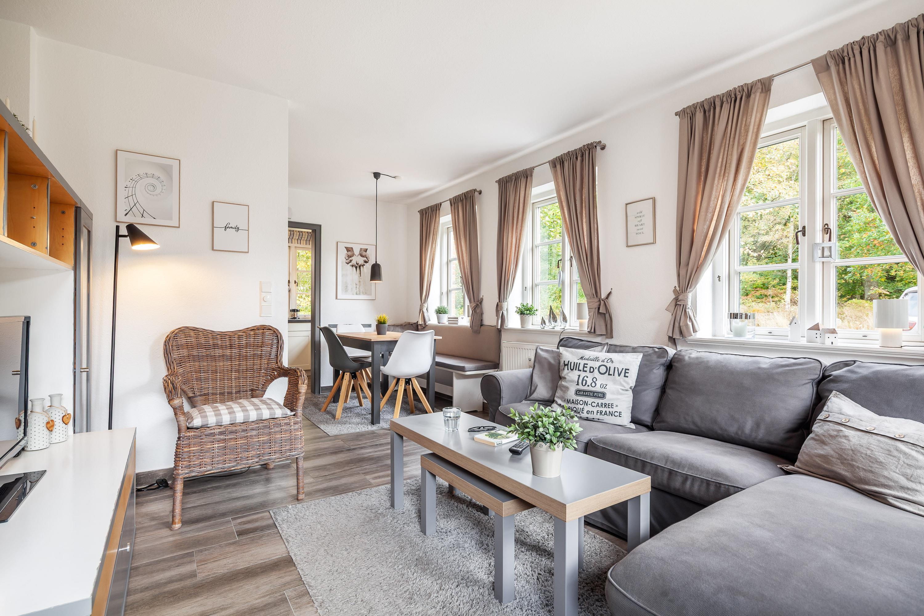 Der lichtdurchflutete Wohnraum mit einer gemütlichen Sitzgruppe und einem Esstisch lädt zum Verweilen ein.