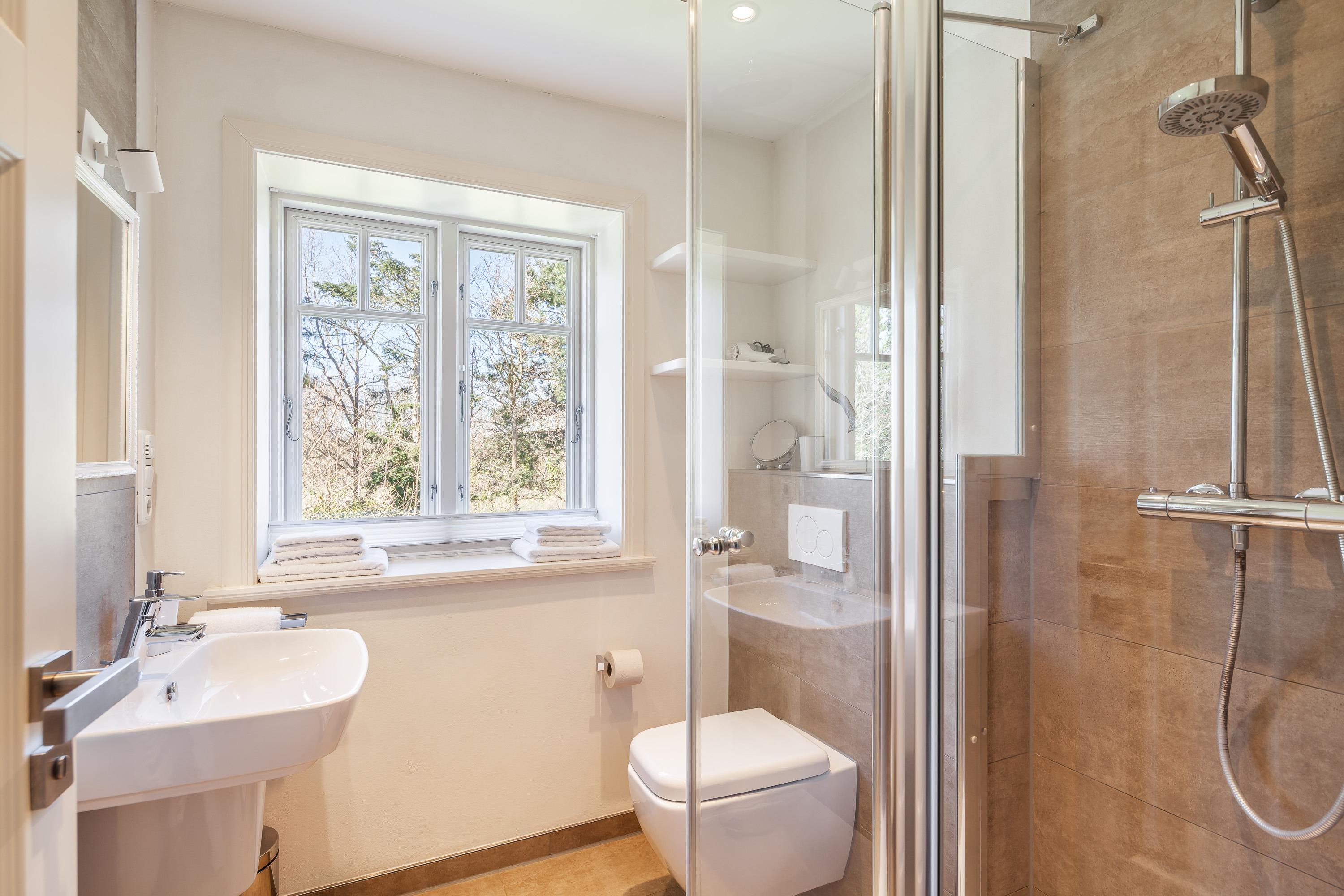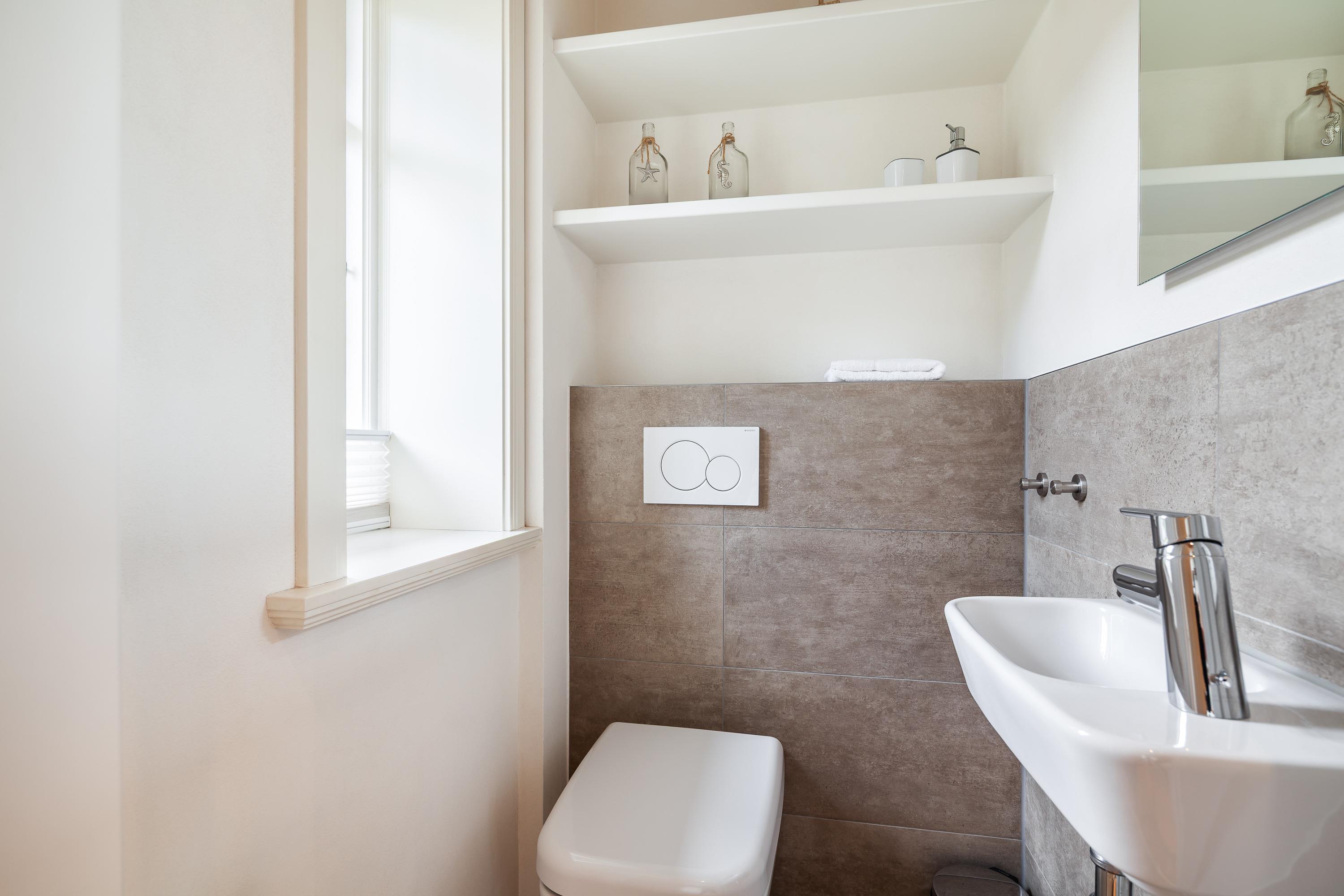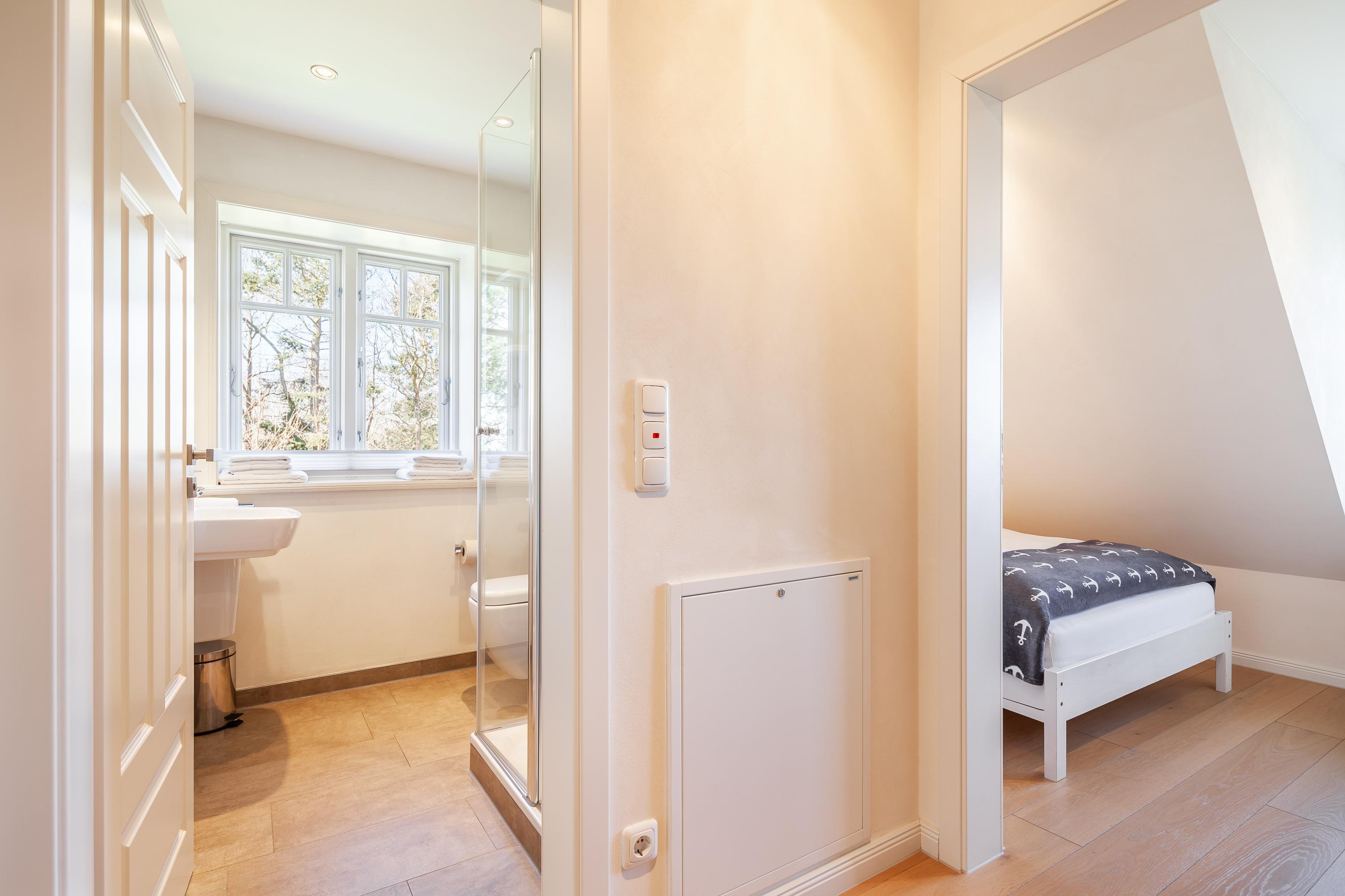 Im Obergeschoss befinden sich zwei Schlafzimmer und ein Duschbad mit Toilette, im Kellergeschoss ist neben der Sauna und dem geräumigen Schlafzimmer mit Doppelbett und großem Flachbildfernseher eine weitere Dusche. Im Erdeschoss ist eine Gästetoilette.
