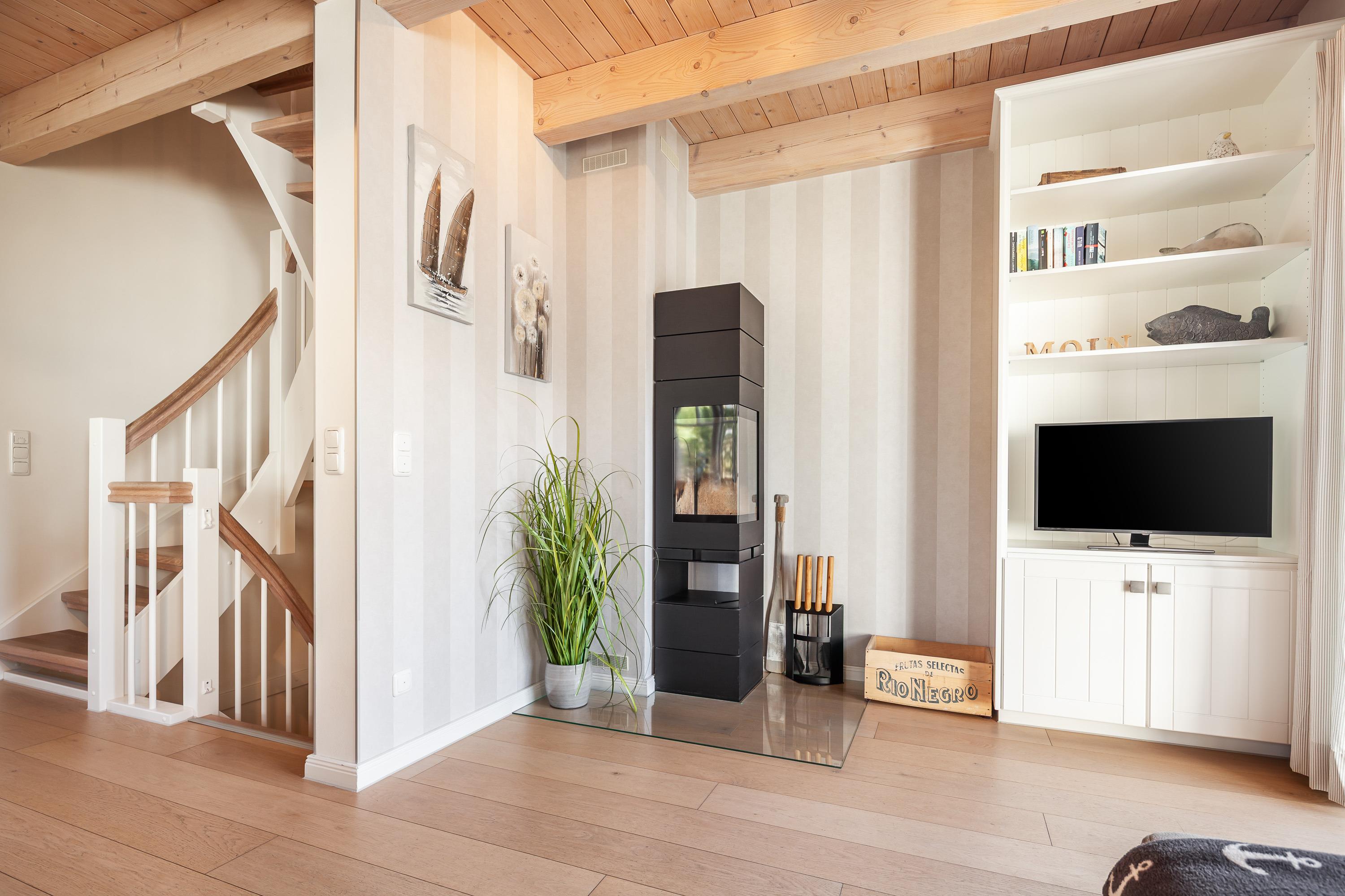 Die moderne Unterkunft wurde im Sommer 2015 fertiggestellt. Eiche-Dielenböden sowie Fliesen in Betonoptik im Erdgeschoss und Design-Böden im Obergeschoss, die moderne Küche und die eigene Sauna zeugen von bester Qualitätsausstattung. Der Tischler leistete hier Glanzarbeiten bis ins Detail: sichtbare Holzdecken im Erdgeschoss, Holzfenster, Einbauschränke.
