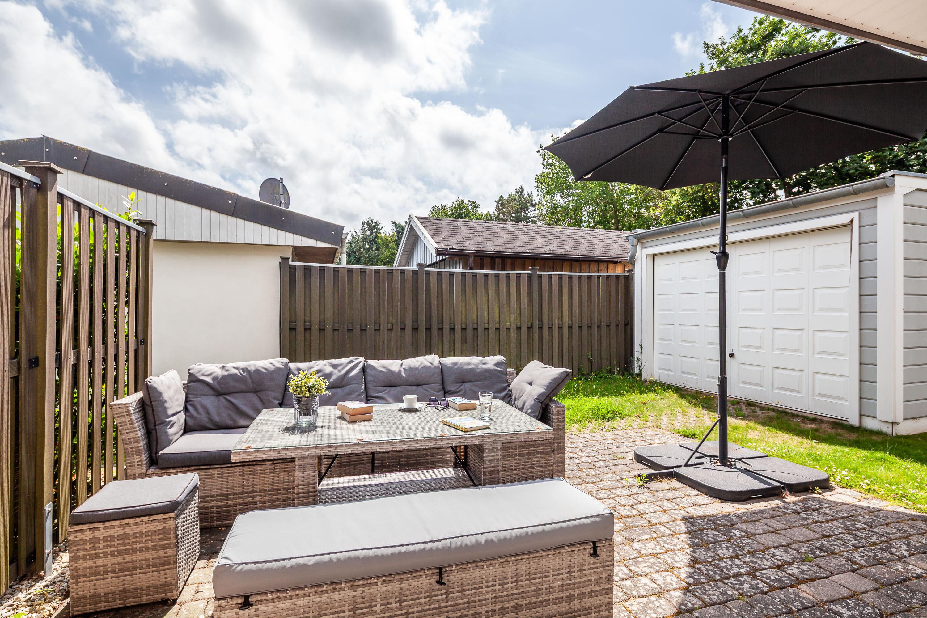 Zu der DHH gehört eine eigene Sonnenterrasse mit Launchmöbeln sowie ein Carport.