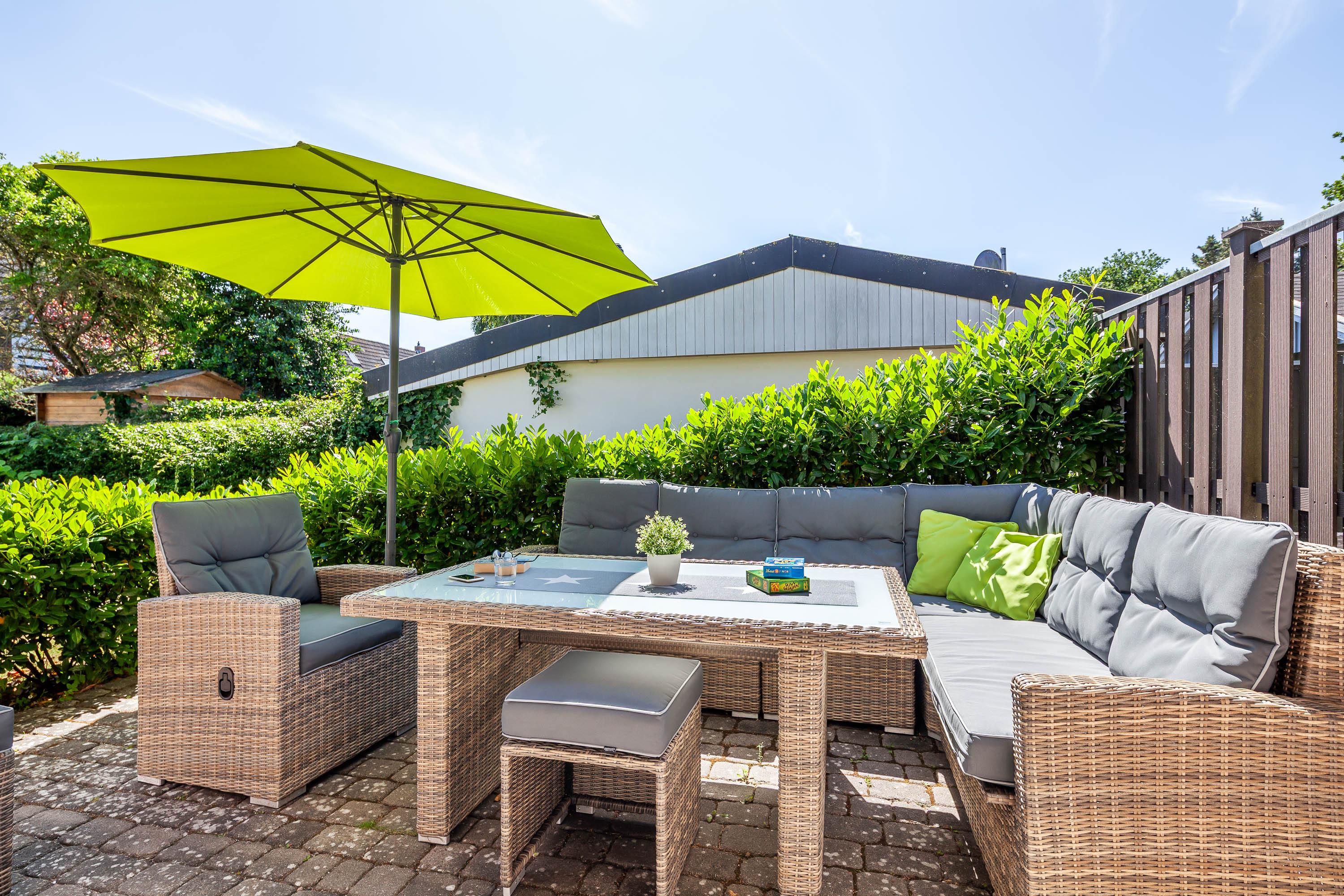 Zu der DHH gehört eine eigene Sonnenterrasse mit Launchmöbeln sowie ein Carport.