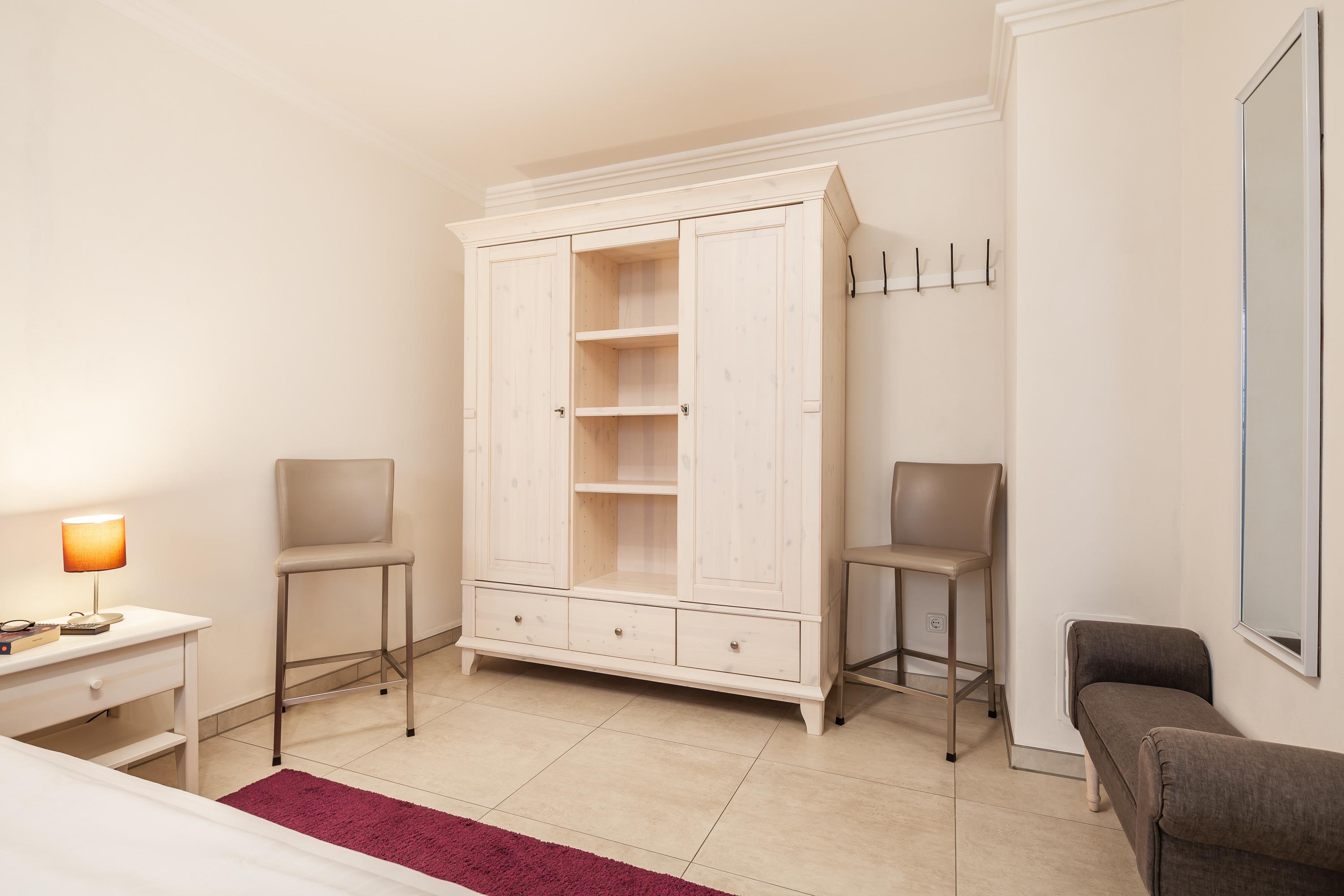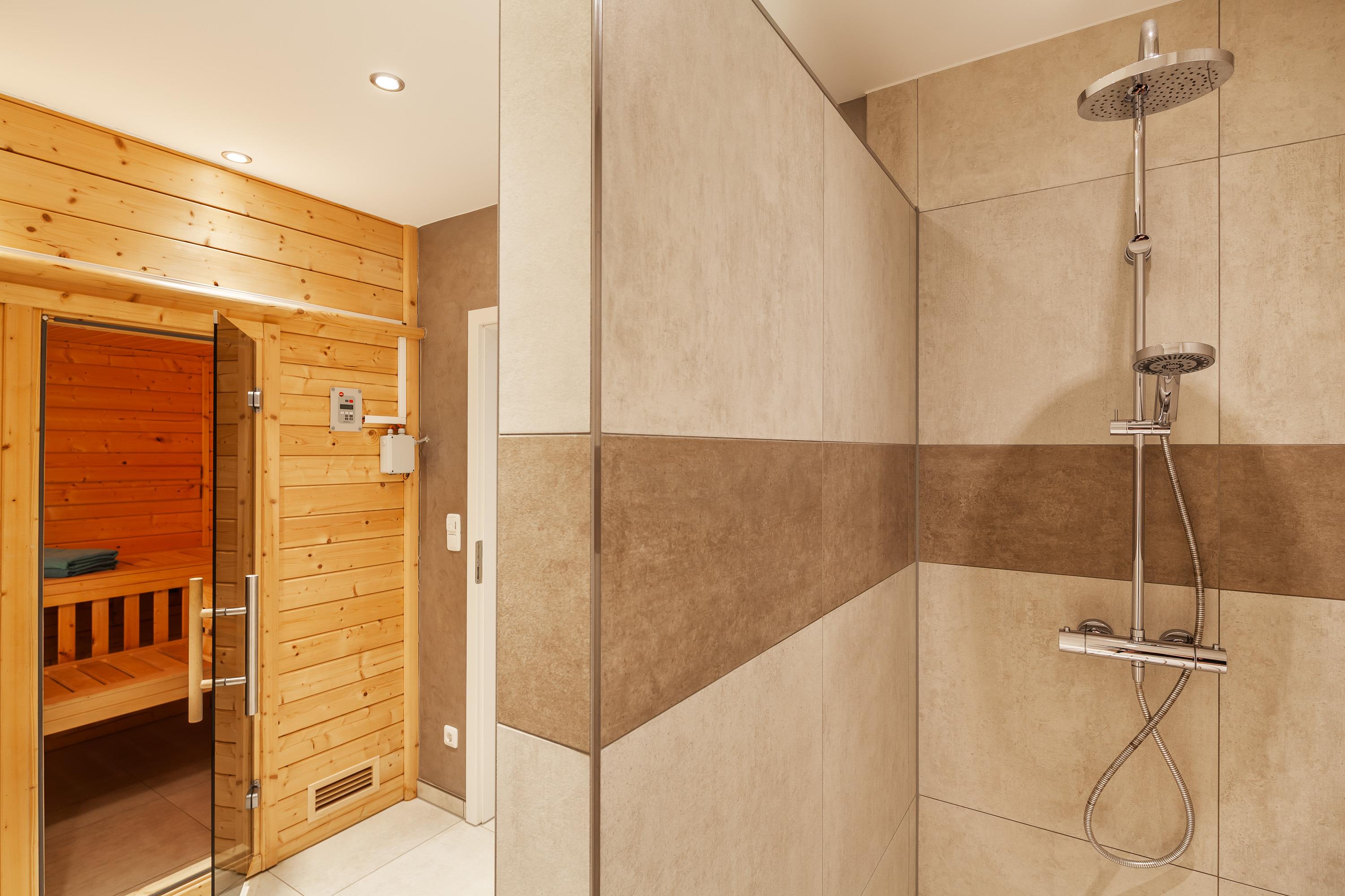 Im Obergeschoss befinden sich zwei Schlafzimmer und ein Duschbad mit Toilette, im Kellergeschoss ist neben der Sauna und dem geräumigen Schlafzimmer mit Doppelbett und großem Flachbildfernseher eine weitere Dusche. Im Erdeschoss ist eine Gästetoilette.