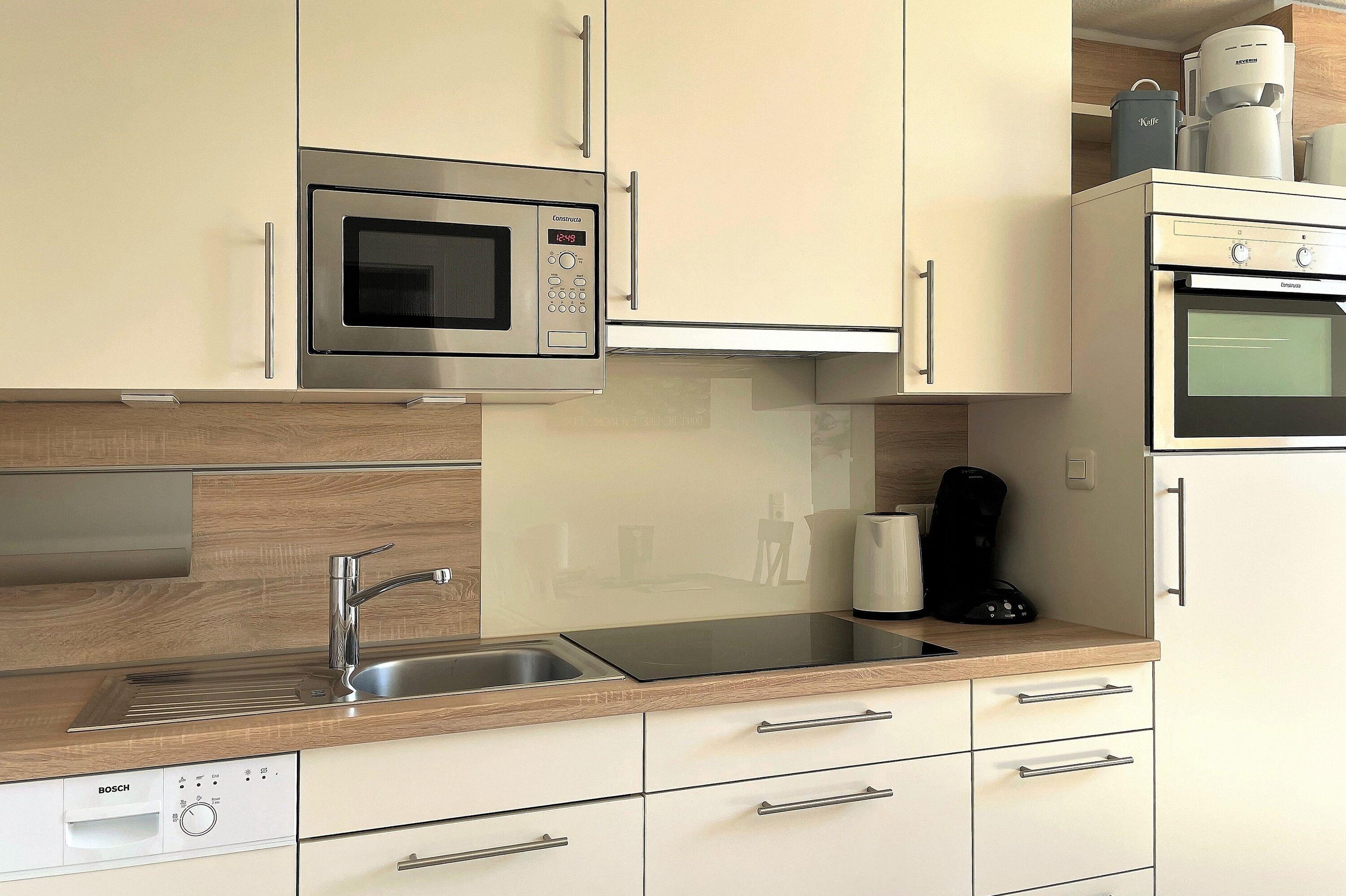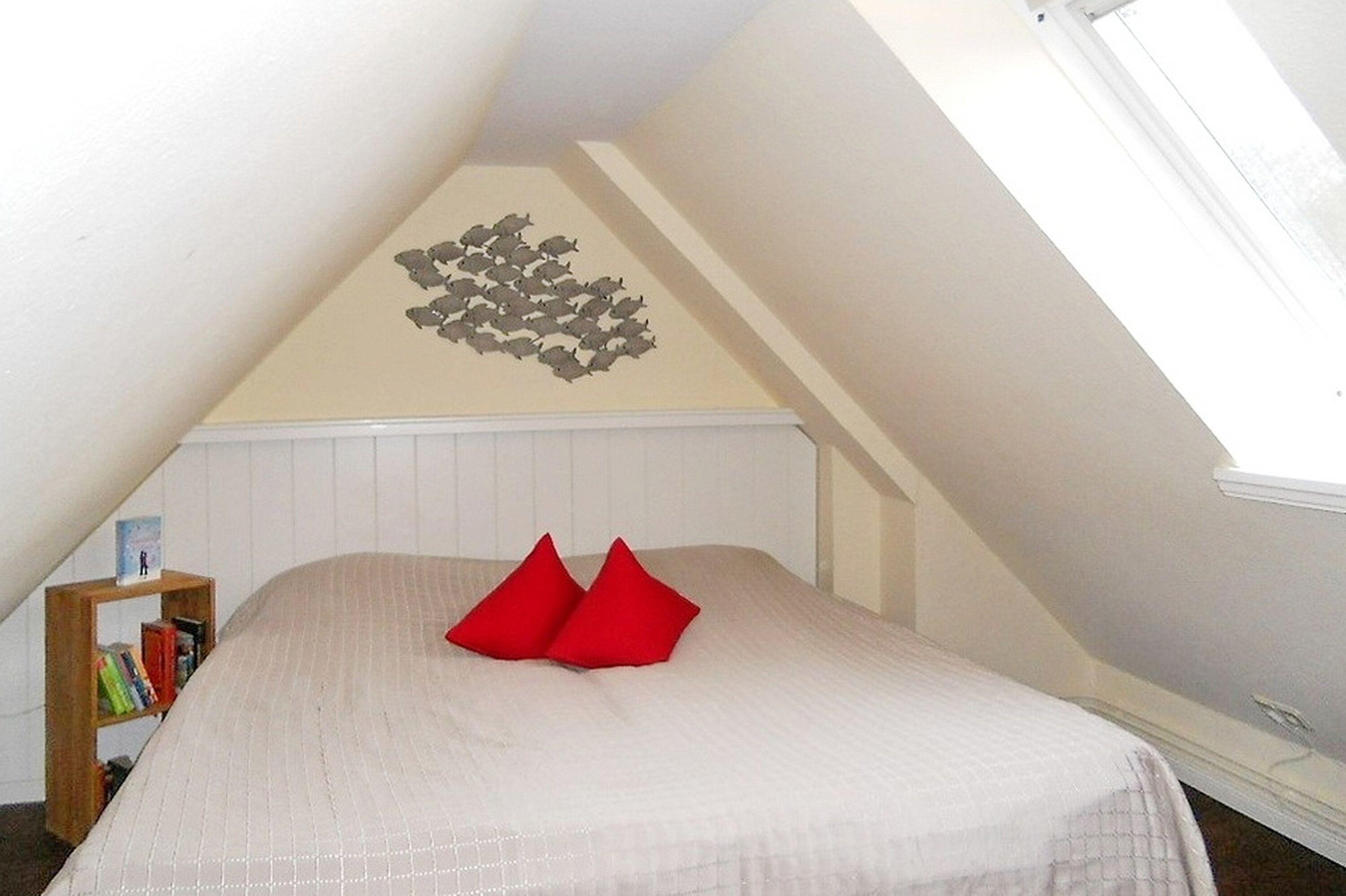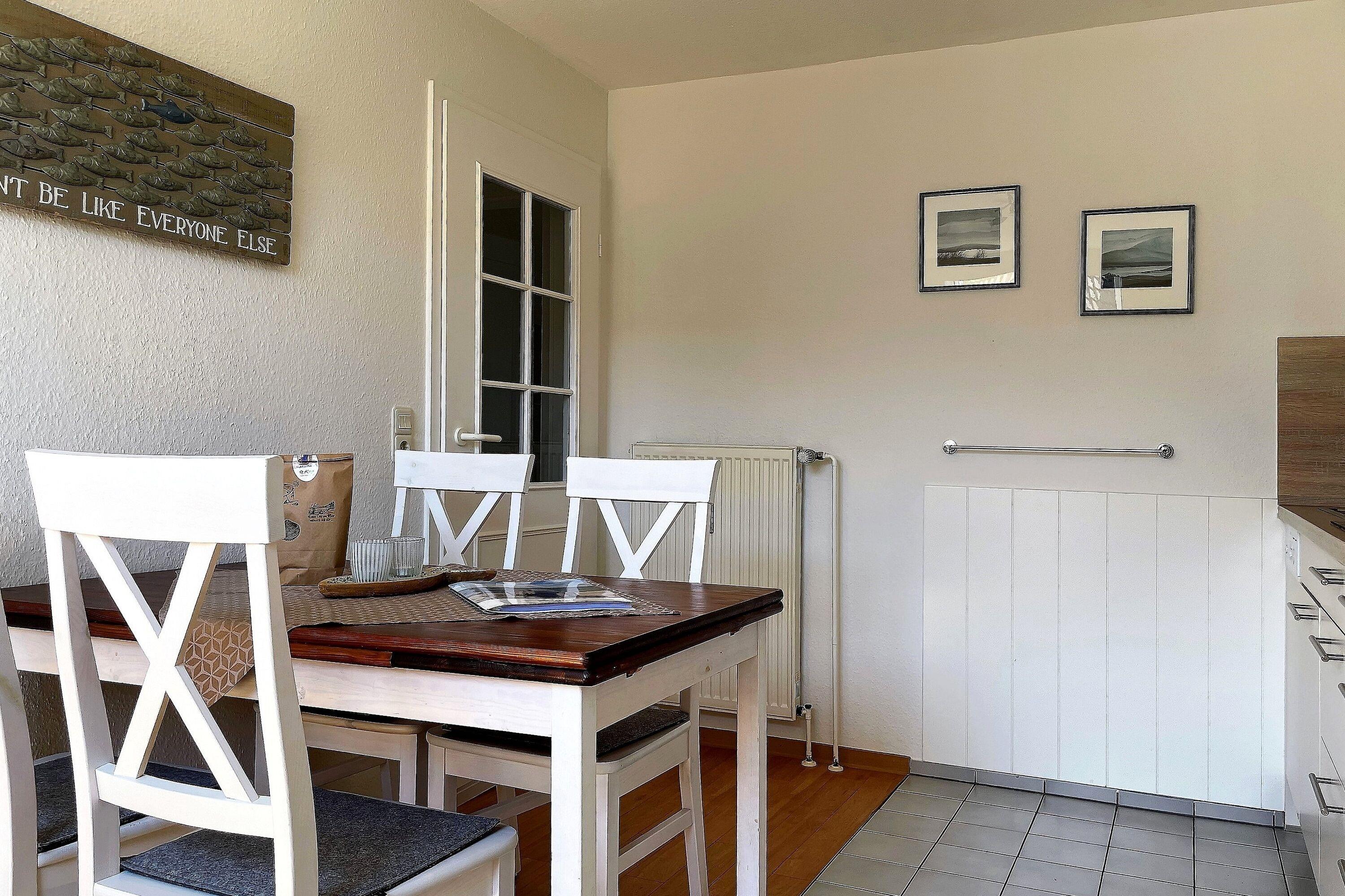 Unsere Ferienwohnung Apfelblüte (ca. 56 qm) befindet sich im ersten Obergeschoss und bietet vier Personen ein schönes Domizil für einen entspannten Föhrurlaub. Der L- förmige Wohn- Küchenbereich ist großzügig und lichtdurchflutet. Die offene, vollausgestattete Küchenzeile mit Ceranfeldherd, Backofen, Geschirrspüler, Mikrowelle und Essplatz ist modern und ansprechend. Der Wohnbereich mit hochwertiger Couchgarnitur, großem Flachbild-TV, DVD-Player, Musikanlage, WLAN und einer kleinen, aber feinen Auswahl an Lesestoff und Gesellschaftsspielen lädt zum Verweilen ein. Vom Flur aus gelangen Sie in die übrigen Räume. Ein Schlafzimmer mit zwei Einzelbetten ( eines davon steht unter direkter Dachschräge)mit Kleiderschrank verfügt über einen zweiten Flachbild-TV. Ein Doppelbett befindet sich im gemütlichen Dachgeschoss. Das Badezimmer mit Dusche und Fenster ist hell gefliest und modern. Die Wohnung Apfelblüte wurde von den Eigentümern liebevoll eingerichtet und dekoriert. Die Wohnung Apfelblüte verfügt über einen Terrassensitzplatz. Alle Einkaufsmöglichkeiten sowie die Promenade und der Strand sind in wenigen Gehminuten erreichbar. Unsere Ferienwohnung Apfelblüte ist ein ideales Domizil für Familien!
