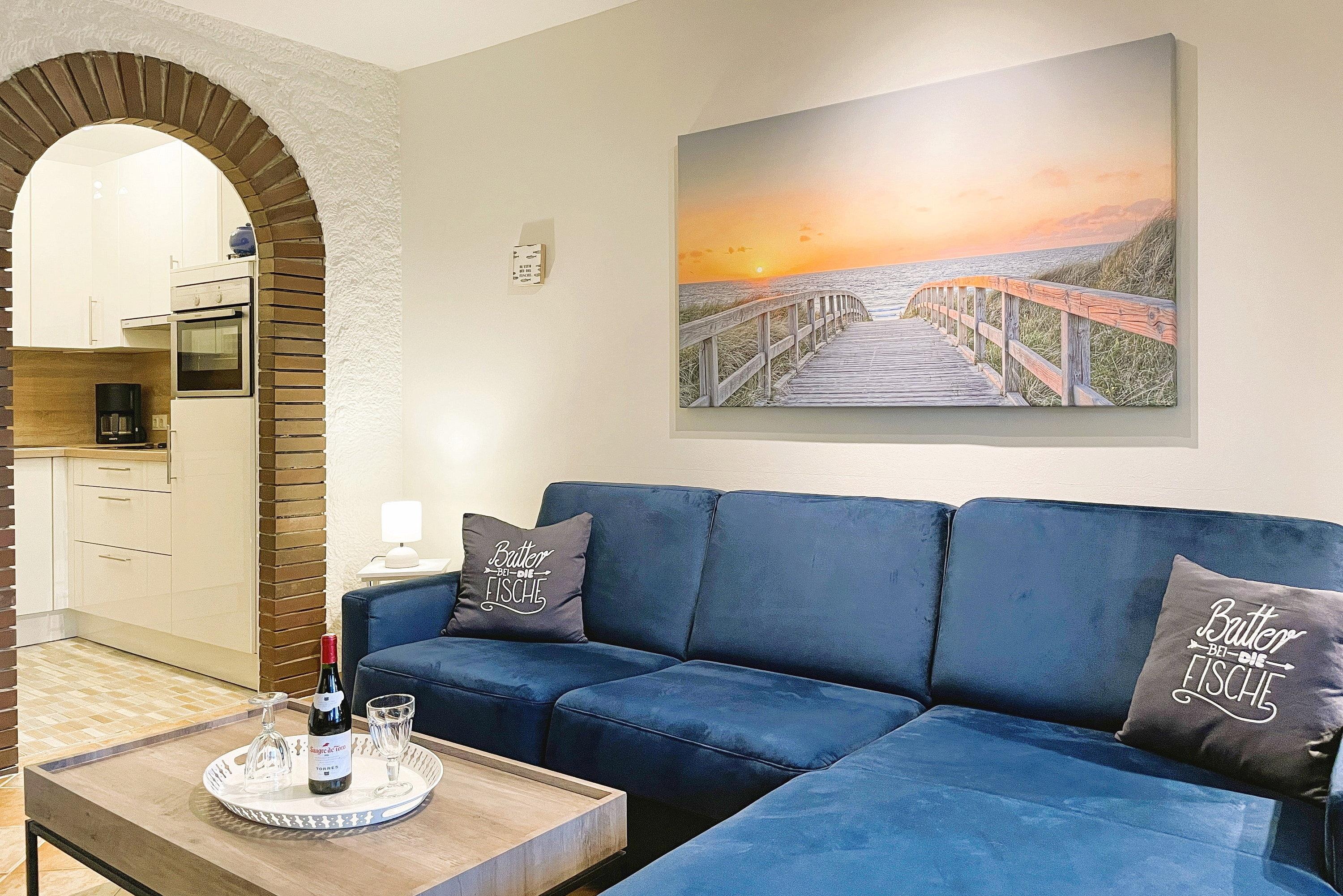 Das helle Wohnzimmer mit WLAN, Radio und TV mit angrenzender, gut ausgestatteter Küche lädt zum Verweilen ein. Von hier aus gelangen Sie auf den sonnigen Südbalkon - ideal für entspannte Momente im Freien. Das separate Schlafzimmer mit Doppelbett hat einen maritimen Flair und eine Lampe mit Ventilator. Das Fenster ist zum Flur ausgerichtet. Das Badezimmer ist funktional mit Wanne, WC und Lüftung ausgestattet. Familien mit Kindern und Haustierbesitzer sind in dieser rauchfreien Ferienwohnung herzlich willkommen. Die zentrale Lage auf Föhr ermöglicht Ihnen, die Schönheit der Insel mühelos zu erkunden.
