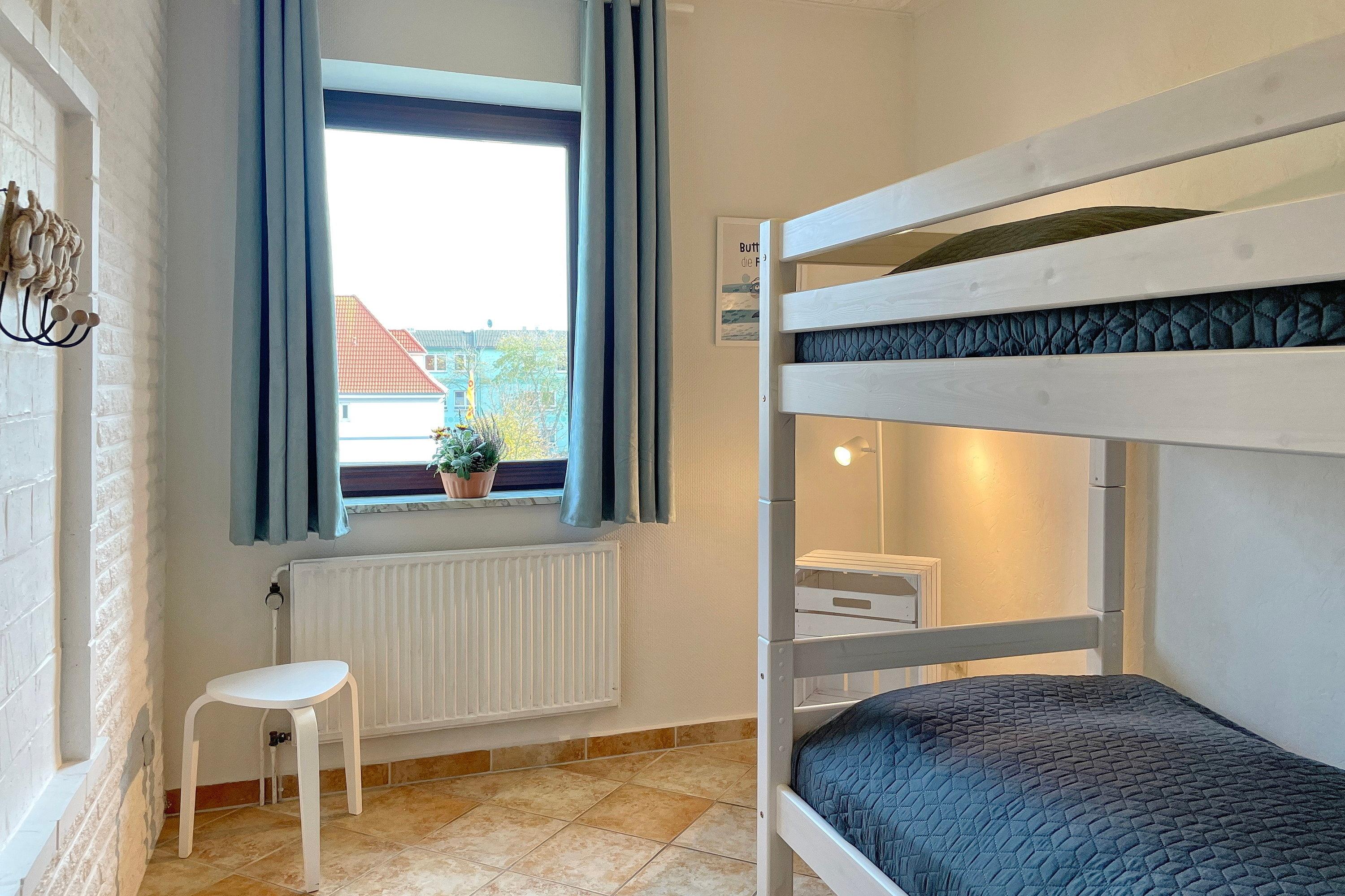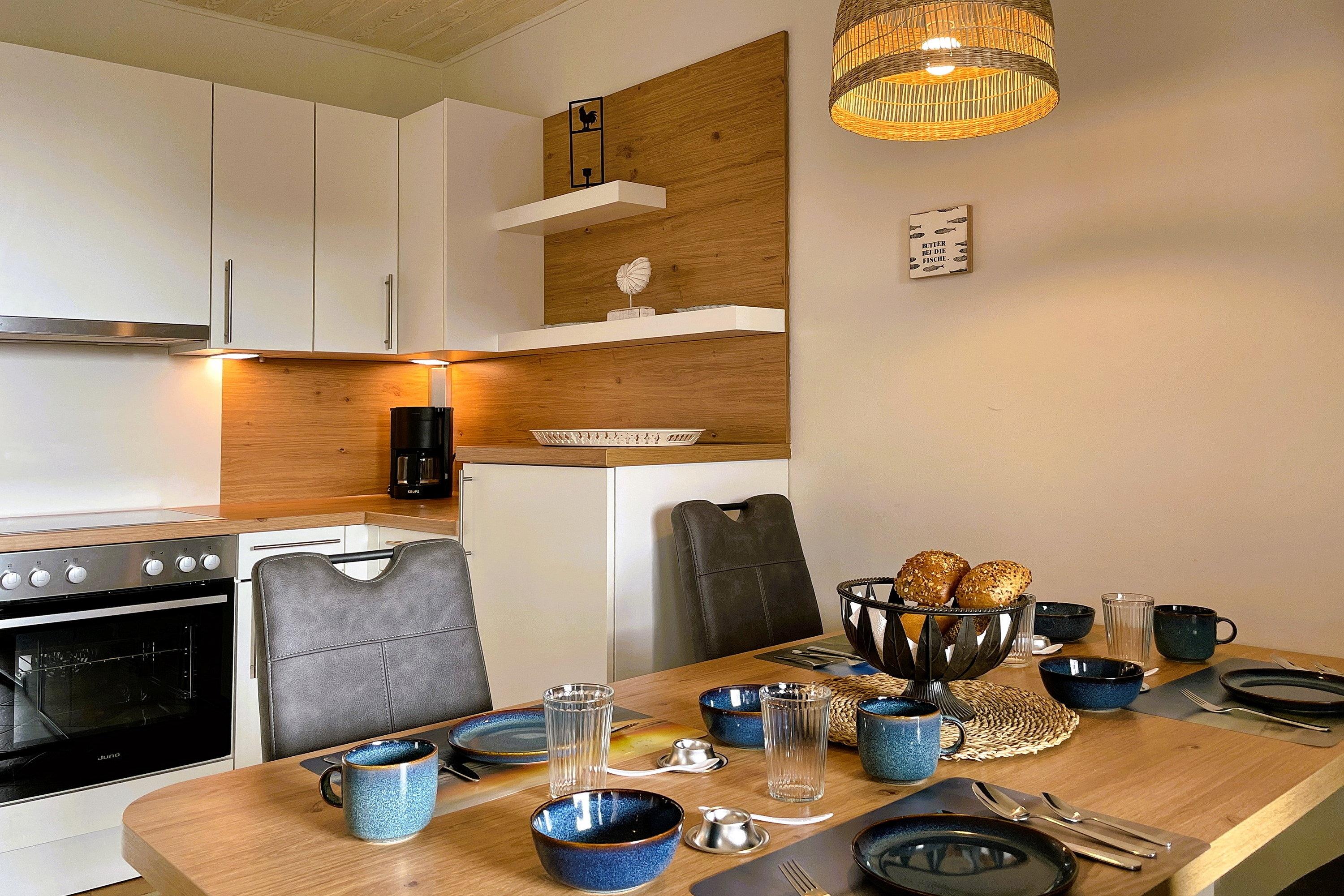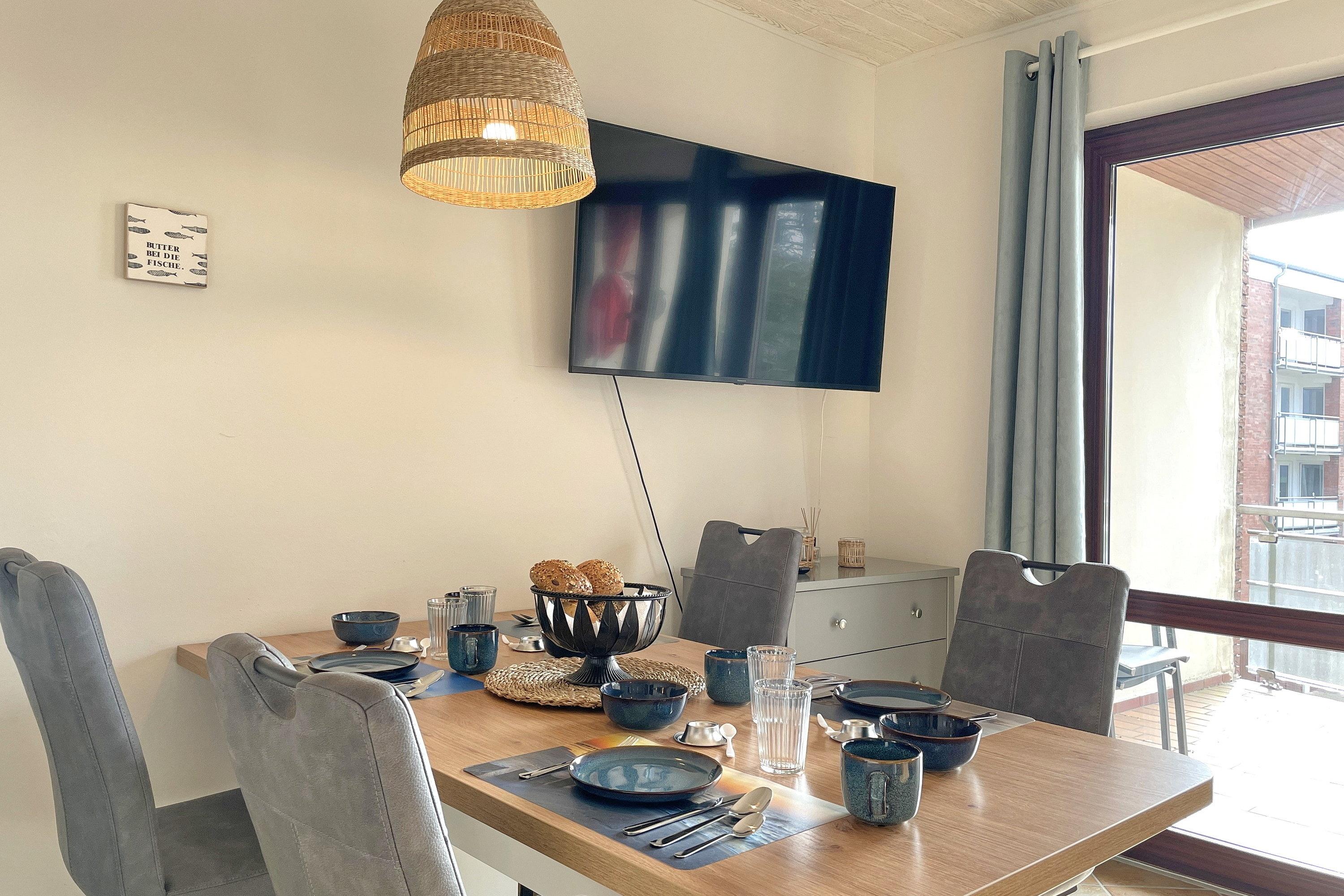 Die Wohnung 9 in unserem Fischerhuus bietet reichlich Platz für bis zu 5 Personen. Vom Flur aus gelangen Sie zu den beiden Schlafzimmern, dem Wohnschlafraum und dem Bad mit Badewanne. Der helle Wohnraum ist großzügig und lichtdurchflutet. In der gut ausgestatteten Küchenzeile mit Backofen, Geschirrspüler, Mikrowelle und Kühlschrank macht das Kochen Freude. Bereiten Sie typisch nordfriesische Fischgerichte zu und genießen Sie Ihre Mahlzeiten am großzügigen Essplatz. Die gemütliche Sitzecke lädt zum Relaxen ein und Sie können den Tag gemütlich mit einem Fernseh- oder Spielabend ausklingen lassen. Ruhige Nächte versprechen die beiden Schlafräume. Das Kinderzimmer ist mit einem Etagenbett und einem Einzelbett (90 x200 cm) ausgestattet, während der Elternschlafzimmer über ein bequemes Doppelbett verfügt und ein eigenes en-Suite Bad hat, dass mit einer Dusche ausgestattet ist. Sonnenstunden können Sie bei gutem Wetter auf dem geschützten Balkon erleben und die frische Nordseeluft genießen.