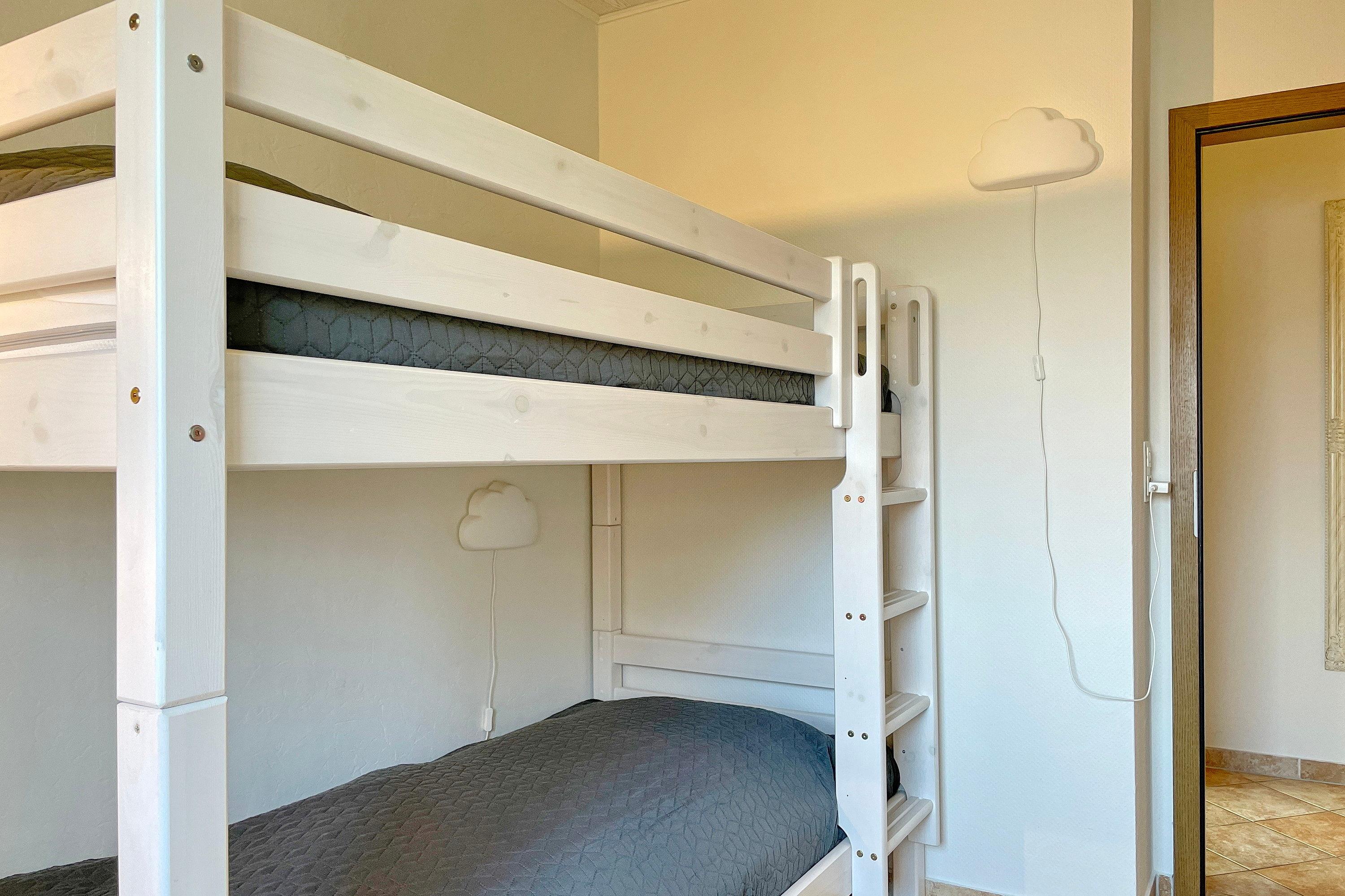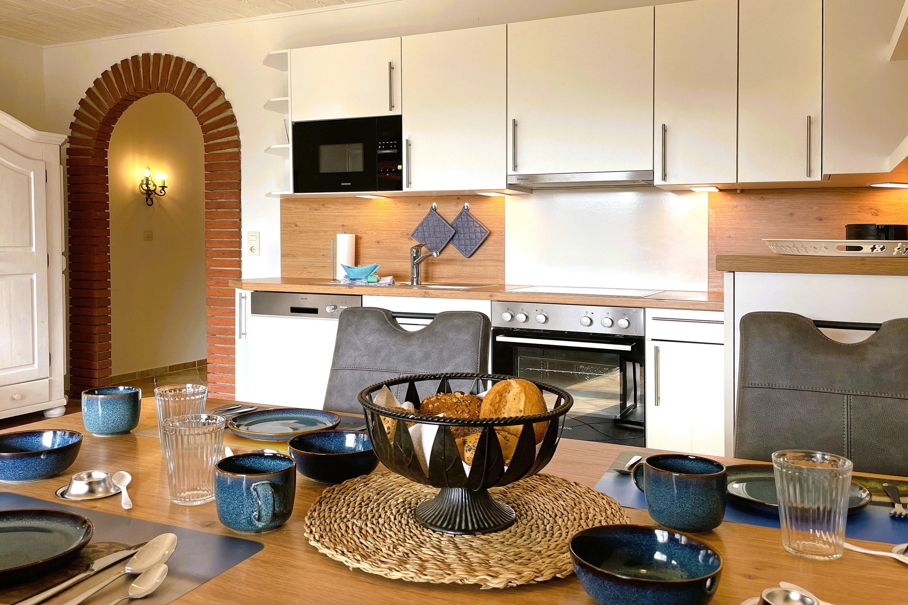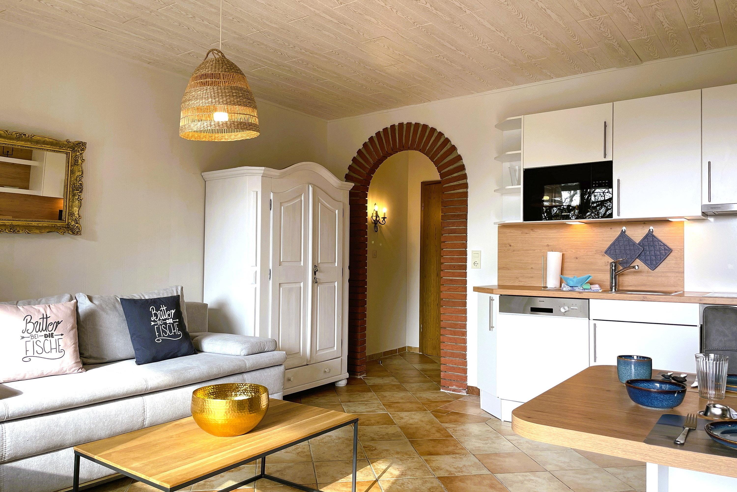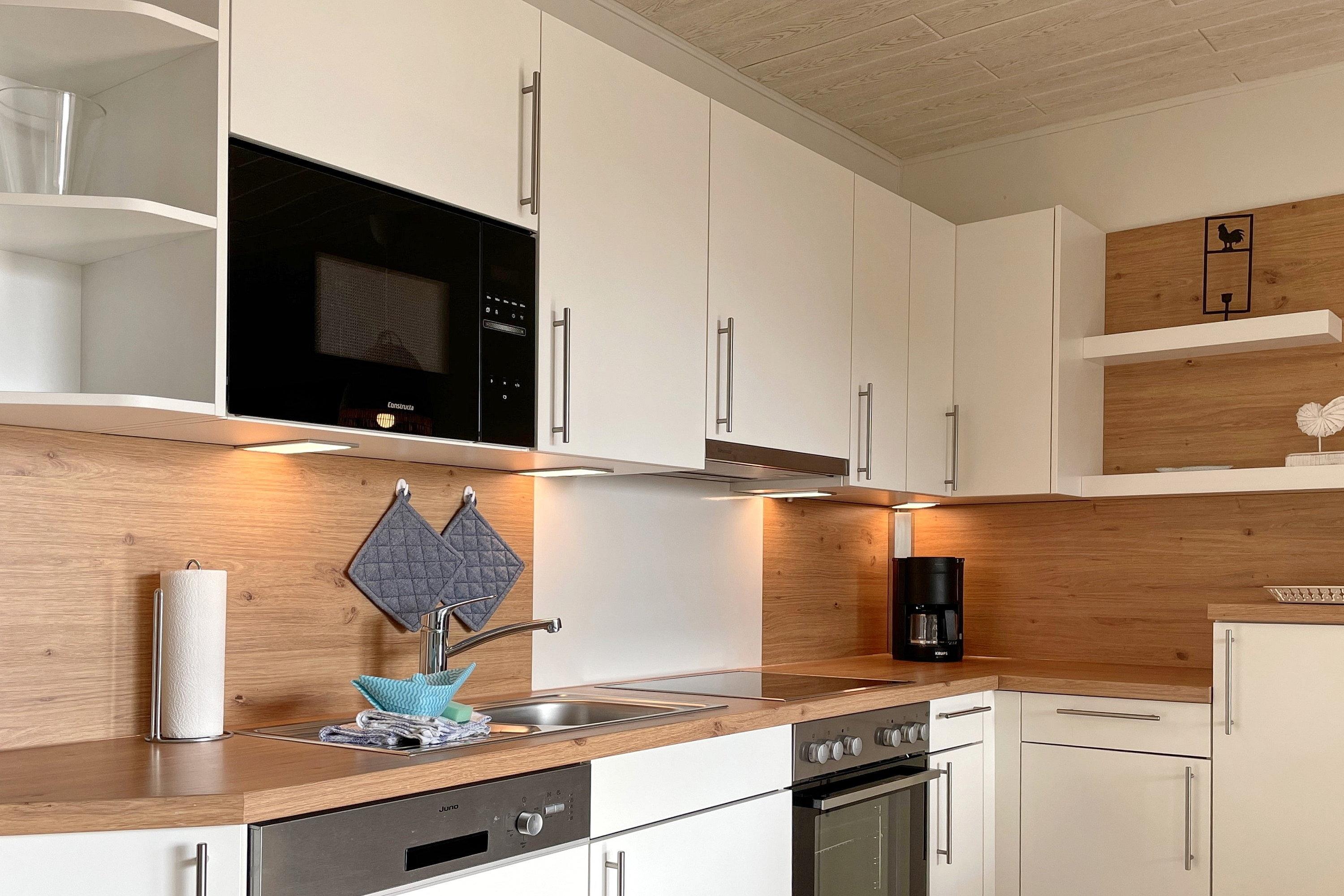 Die Wohnung 9 in unserem Fischerhuus bietet reichlich Platz für bis zu 5 Personen. Vom Flur aus gelangen Sie zu den beiden Schlafzimmern, dem Wohnschlafraum und dem Bad mit Badewanne. Der helle Wohnraum ist großzügig und lichtdurchflutet. In der gut ausgestatteten Küchenzeile mit Backofen, Geschirrspüler, Mikrowelle und Kühlschrank macht das Kochen Freude. Bereiten Sie typisch nordfriesische Fischgerichte zu und genießen Sie Ihre Mahlzeiten am großzügigen Essplatz. Die gemütliche Sitzecke lädt zum Relaxen ein und Sie können den Tag gemütlich mit einem Fernseh- oder Spielabend ausklingen lassen. Ruhige Nächte versprechen die beiden Schlafräume. Das Kinderzimmer ist mit einem Etagenbett und einem Einzelbett (90 x200 cm) ausgestattet, während der Elternschlafzimmer über ein bequemes Doppelbett verfügt und ein eigenes en-Suite Bad hat, dass mit einer Dusche ausgestattet ist. Sonnenstunden können Sie bei gutem Wetter auf dem geschützten Balkon erleben und die frische Nordseeluft genießen.