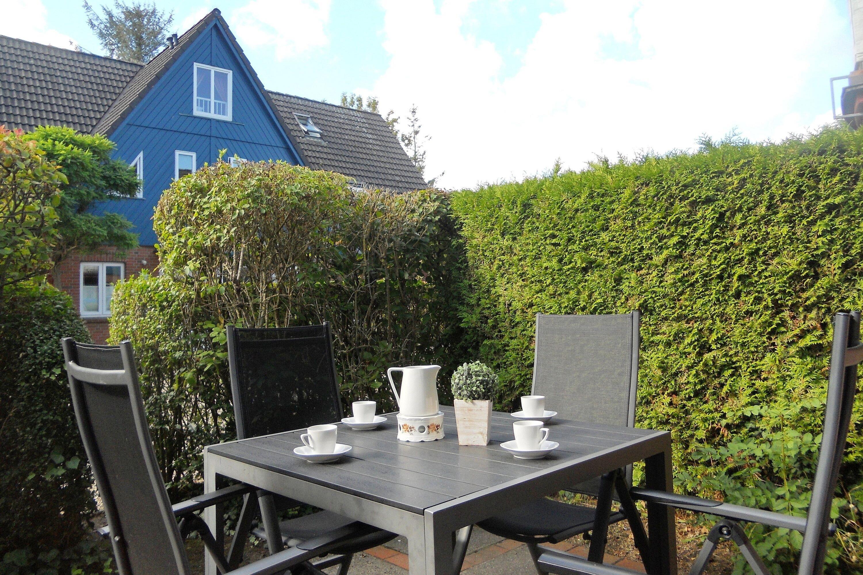 Die Terrasse ist nach Süden ausgerichtet, sodass Sie von morgens bis abends die Sonne genießen können. Der Zugang erfolgt direkt aus dem Wohn,-Küchenbereich über eine doppelflügelige Terrassentür. Die Lage des gesamten Terrassenbereiches ist absolut ruhig und so gestaltet, dass ein Sichtschutz und die grüne Bepflanzung zum Nachbargrundstück Ihnen die Privatsphäre gestattet, die Sie sich wünschen. Dies ist ein Domizil zum Wohlfühlen und zum Genießen Ihres Urlaubes.