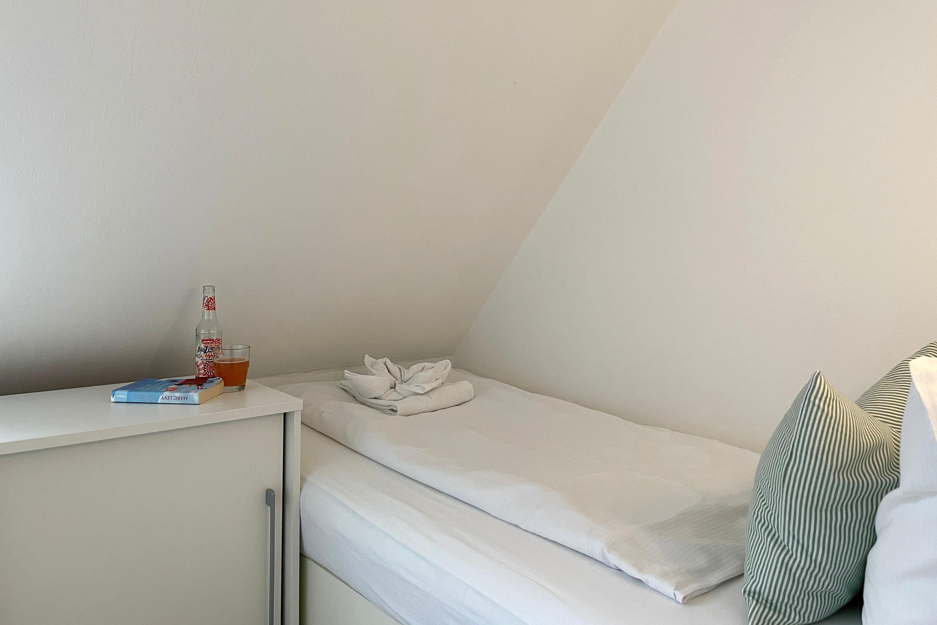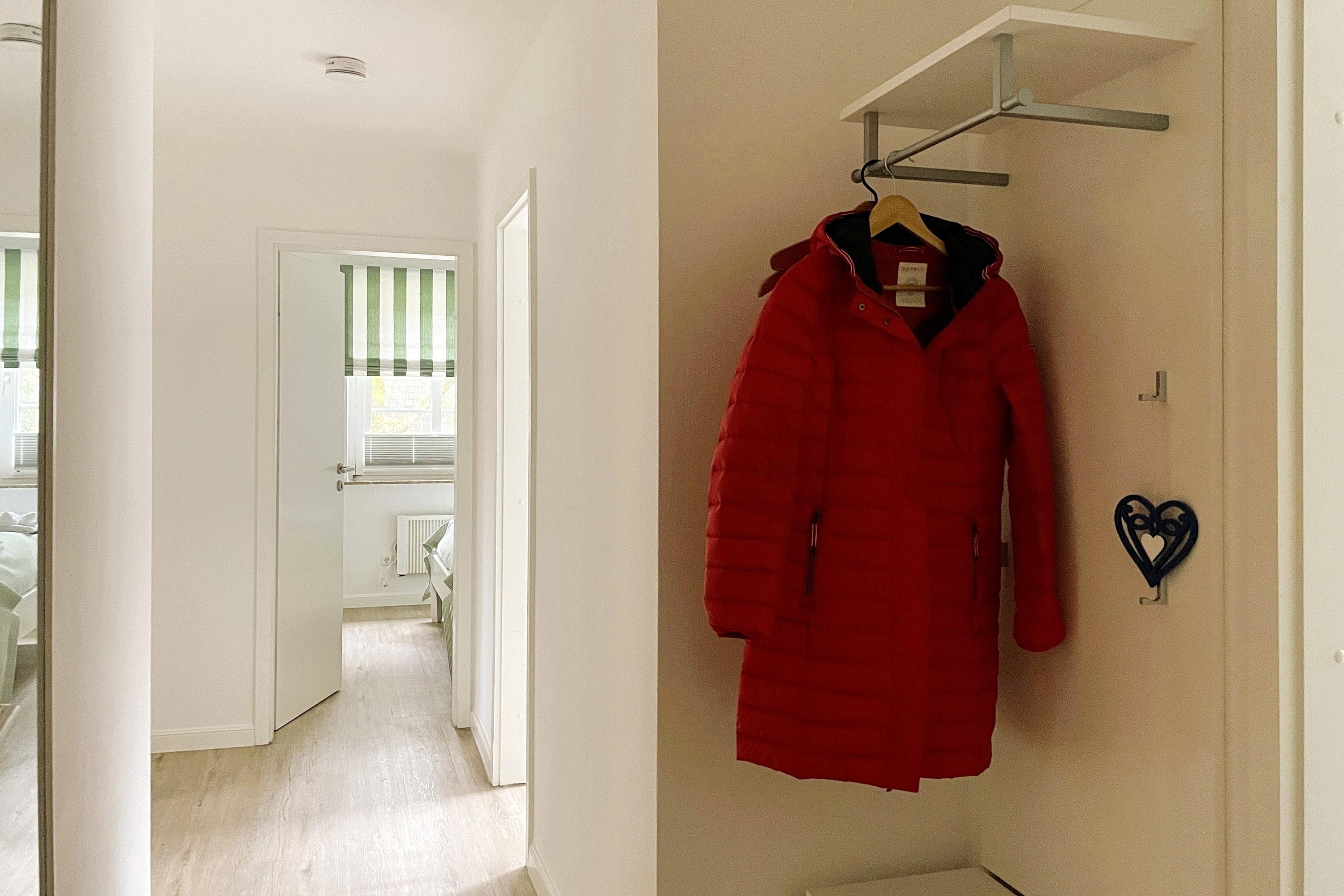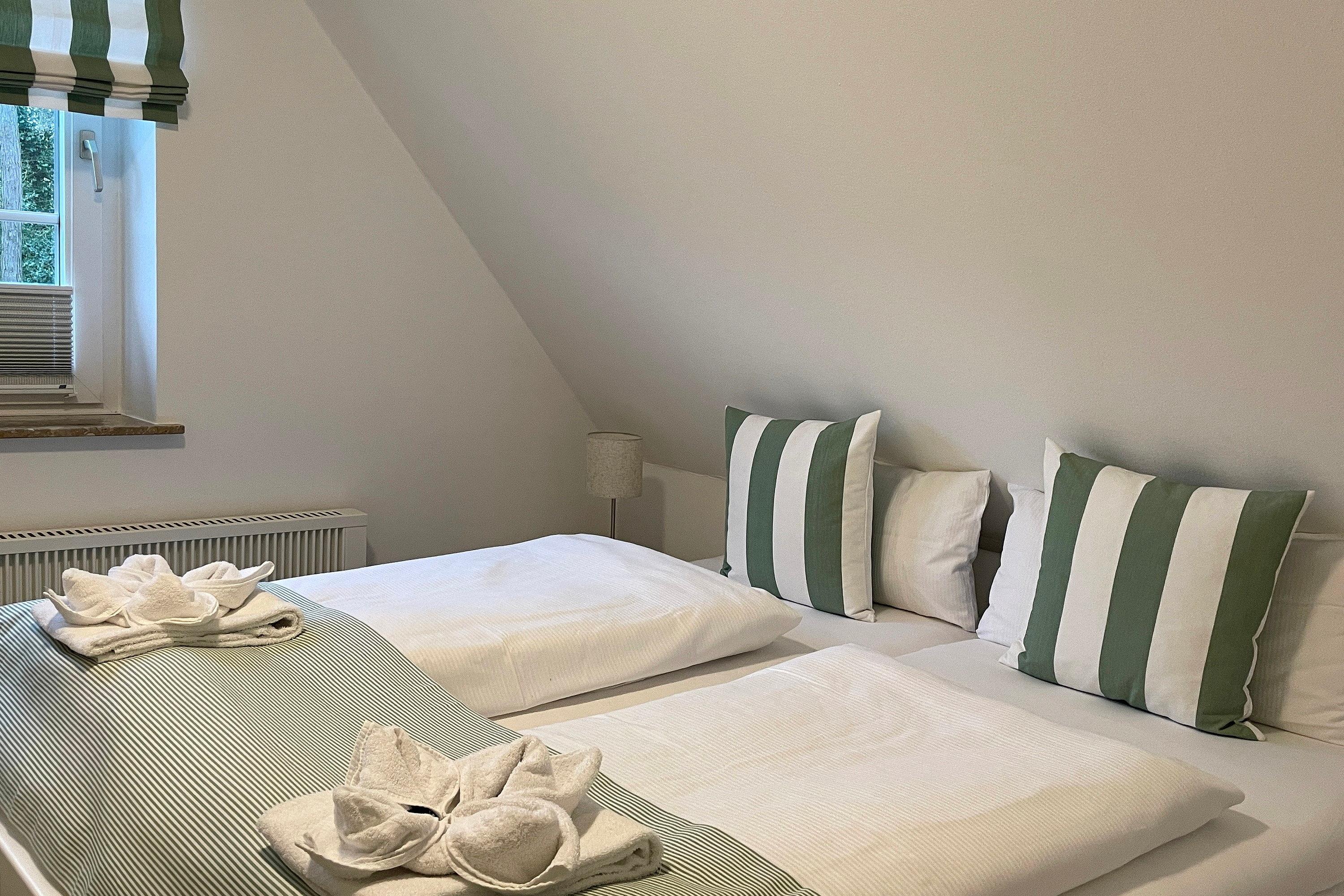 Das Haus am Stadtpark gelegen im Grünstreifen unweit des Stadtparkes mit seinen schönen Waldwegen und dem Abenteuerspielplatz Löwenhöhle ist eine gepflegte Anlage mit einem weitläufigen Grundstück. Hier befindet sich für alle Gäste der Anlage neben einem kleinen Spielplatz und einer Sitzecke auch die Möglichkeit gegen eine geringe Gebühr Waschmaschine und Trockner zu benutzen und die Fahrräder in dem Keller unterzustellen. Eine finnische Dampfsauna (gegen Gebühr) und ein kleiner Fitnessraum laden zum Verweilen ein. Viele Gäste genießen die ruhige Lage, wobei Sie einen Bäcker, einen Schlachter, den kleinen gut sortierten Einkaufsladen und natürlich den Strand und das Meer fußläufig erreichen können. Die Obergeschosswohnung im Haus am Stadtpark ist eine ideale Wohnung für Familien, welche sich über zwei Etagen erstreckt. Im 1. Obergeschoss befindet sich das moderne Badezimmer mit großzügiger Dusche, die beiden Schlafräume und der geräumige Wohnschlafraum mit integrierter Küche und Essplatz. Das Wohnzimmer verfügt über eine Sitzgarnitur (Schlafcouch 170 x 190 cm), einen elektrisch verstellbaren Relax Sessels , Smart-TV, WLAN und auf der anderen Seite des Raumes befindet sich die gut ausgestattete Küche mit einem Essplatz. Von hier aus gelangen Sie auf einen kleinen Balkon, der für 2 bis 3 Personen ausgerichtet ist. Ruhige Nächte verbringen Sie in den beiden Schlafzimmern. Das Elternschlafzimmer ist mit einem Doppelbett (180 x 200 cm) und einem Kleiderschrank ausgestattet, wobei das kleine Kinderzimmer ein Bett (90 x 200 cm) sowie eine Kommode vorweist.