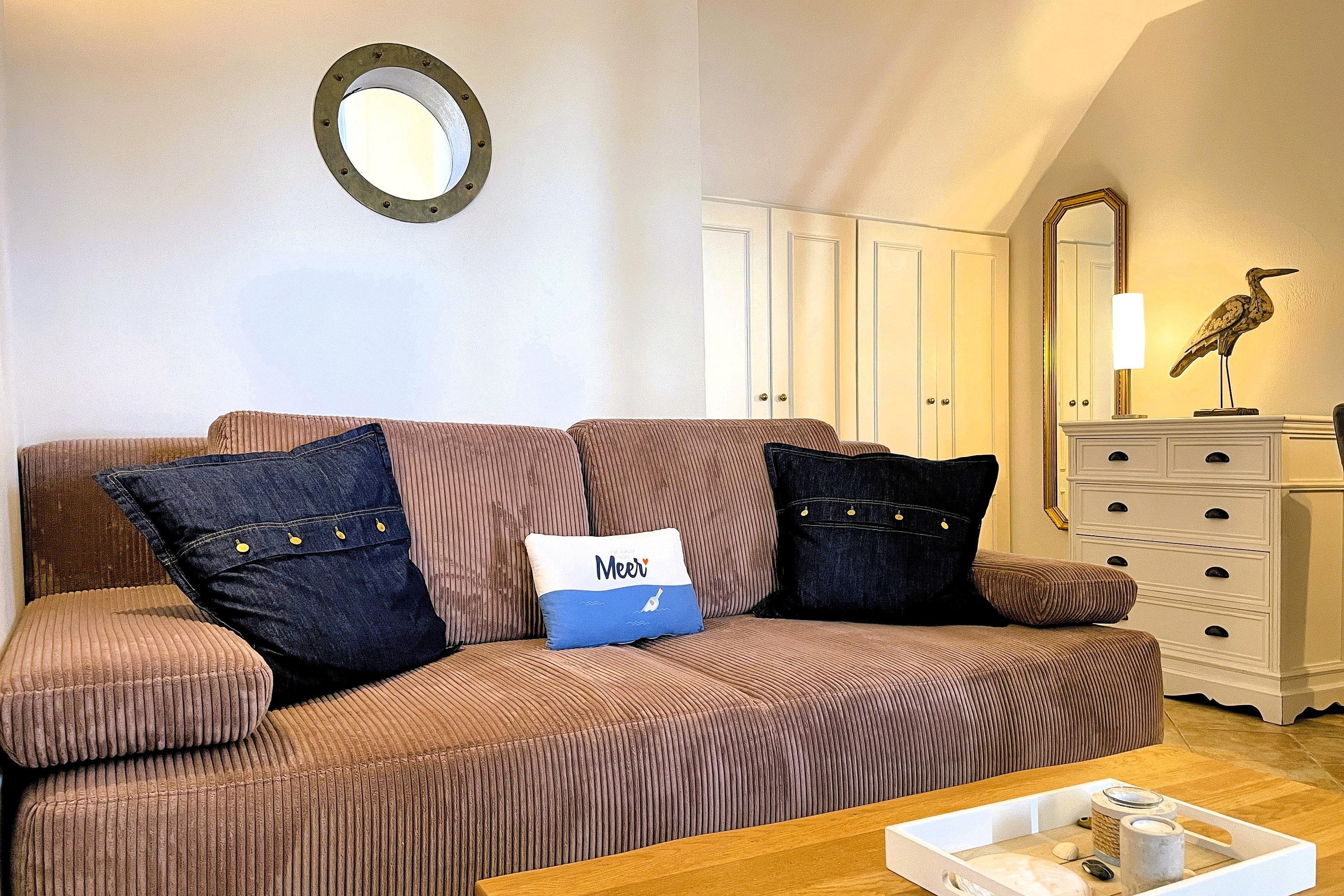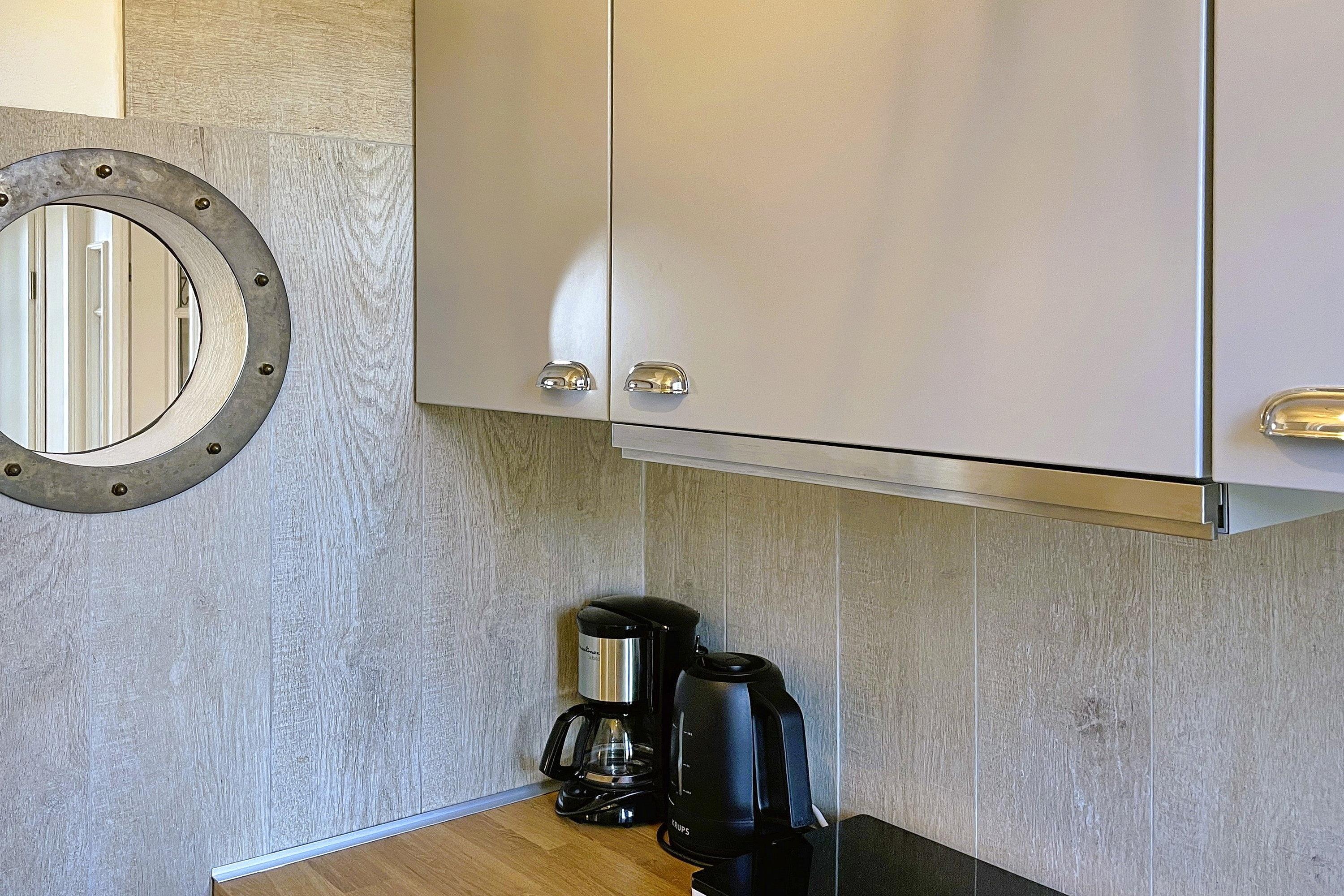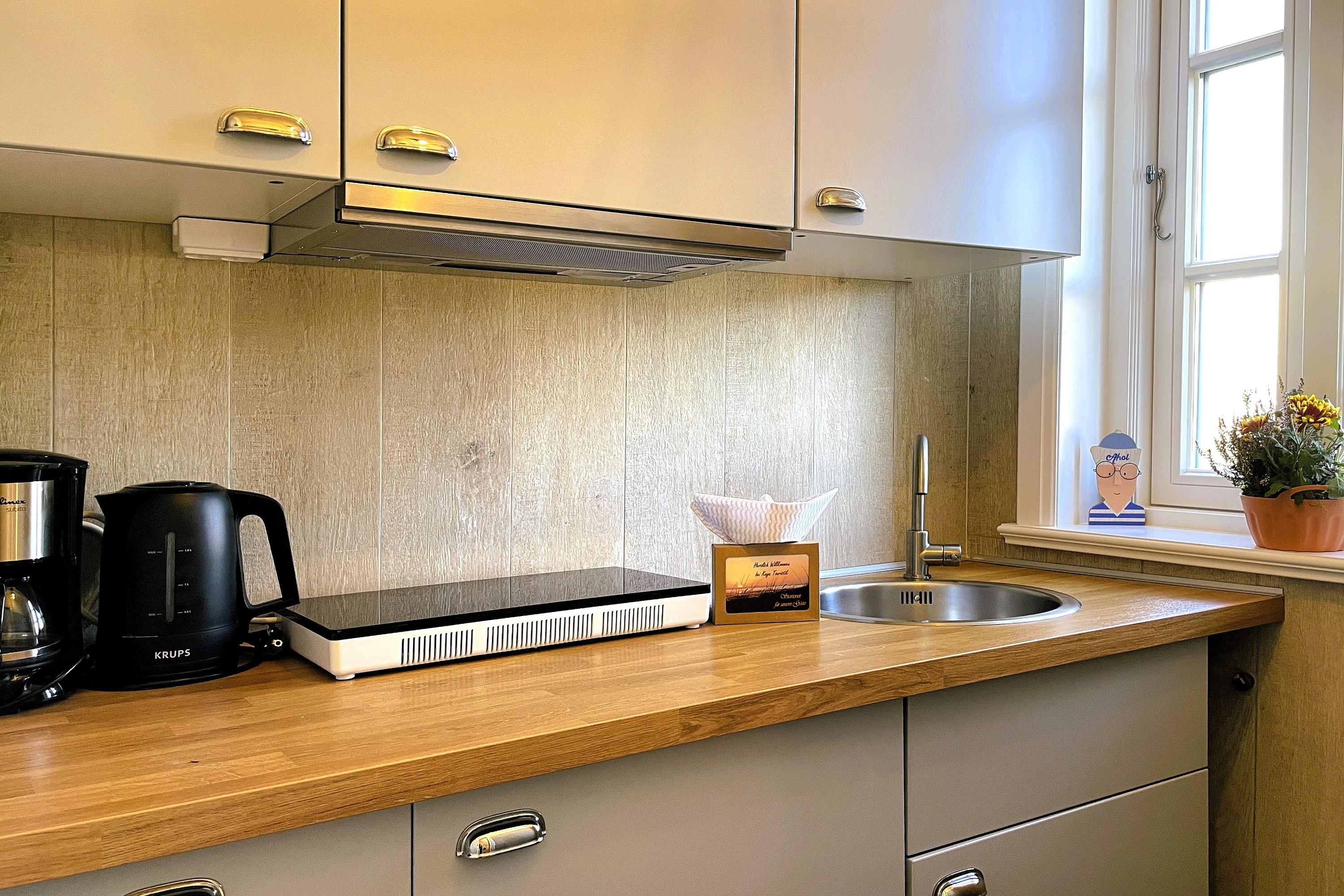 Die Ferienwohnung "Halligenblick" bietet Ihnen einen komfortablen Aufenthalt mit atemberaubendem Meerblick. Diese charmante Unterkunft verfügt über zwei Zimmer und ist perfekt für Paare oder Alleinreisende, die eine erholsame Zeit an der Nordsee verbringen möchten. Im gemütlichen Wohnzimmer finden Sie ein bequemes Schlafsofa (160x200) für eine zusätzliche Person, großzügige Wandschränke für Ihre Habseligkeiten und einen Essbereich mit Tisch und Stühlen. Die abgegrenzte Küchenzeile ist kompakt, aber zweckmäßig ausgestattet. Hier stehen Ihnen ein Induktionskochfeld mit zwei Platten, eine Filterkaffeemaschine, ein Wasserkocher, ein Toaster und ein Kühlschrank zur Verfügung. Geschirr, Besteck und Kochutensilien sind ebenfalls vorhanden.