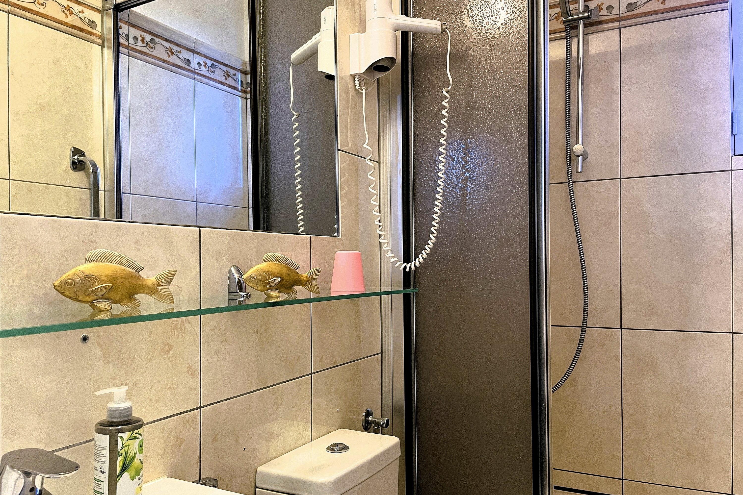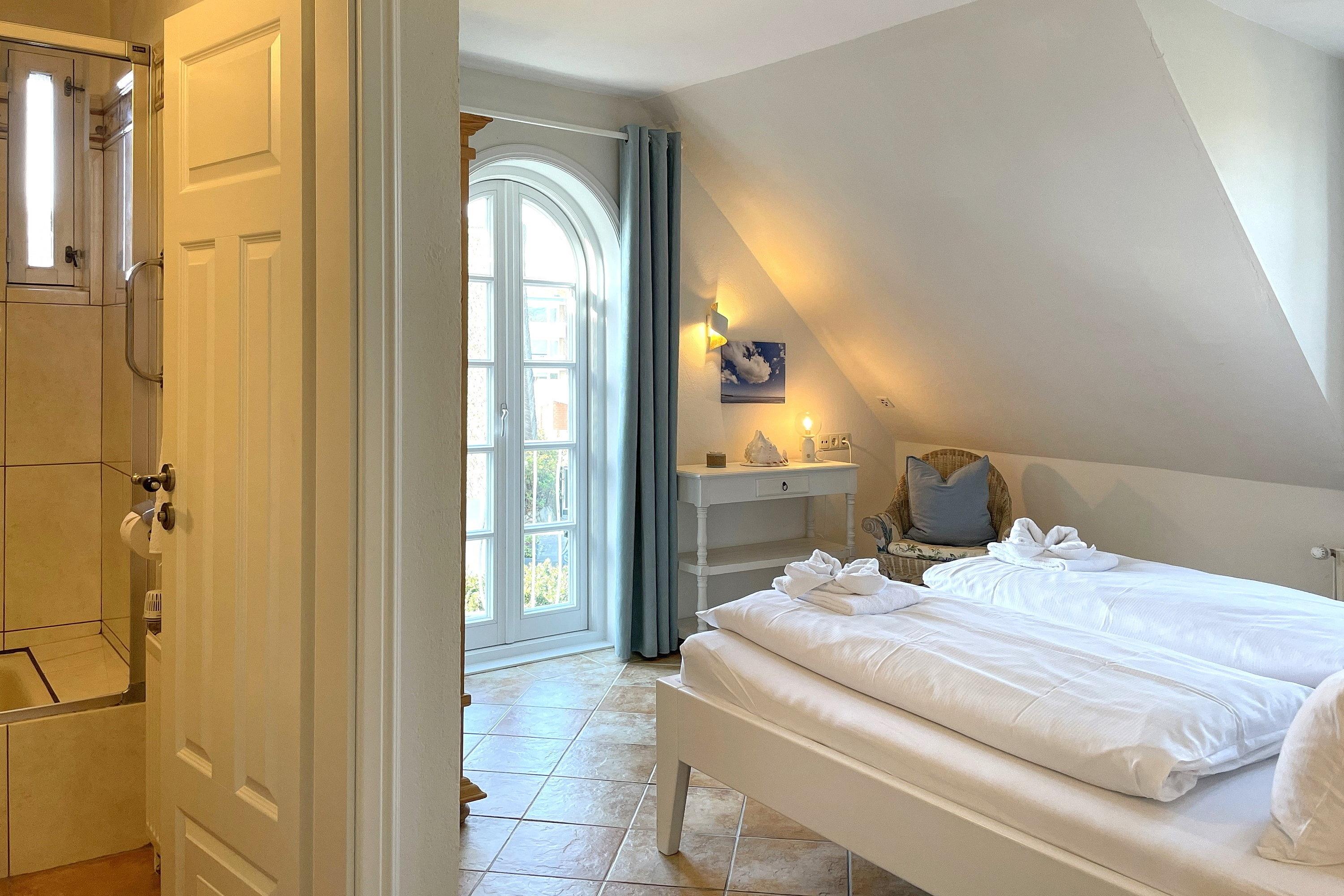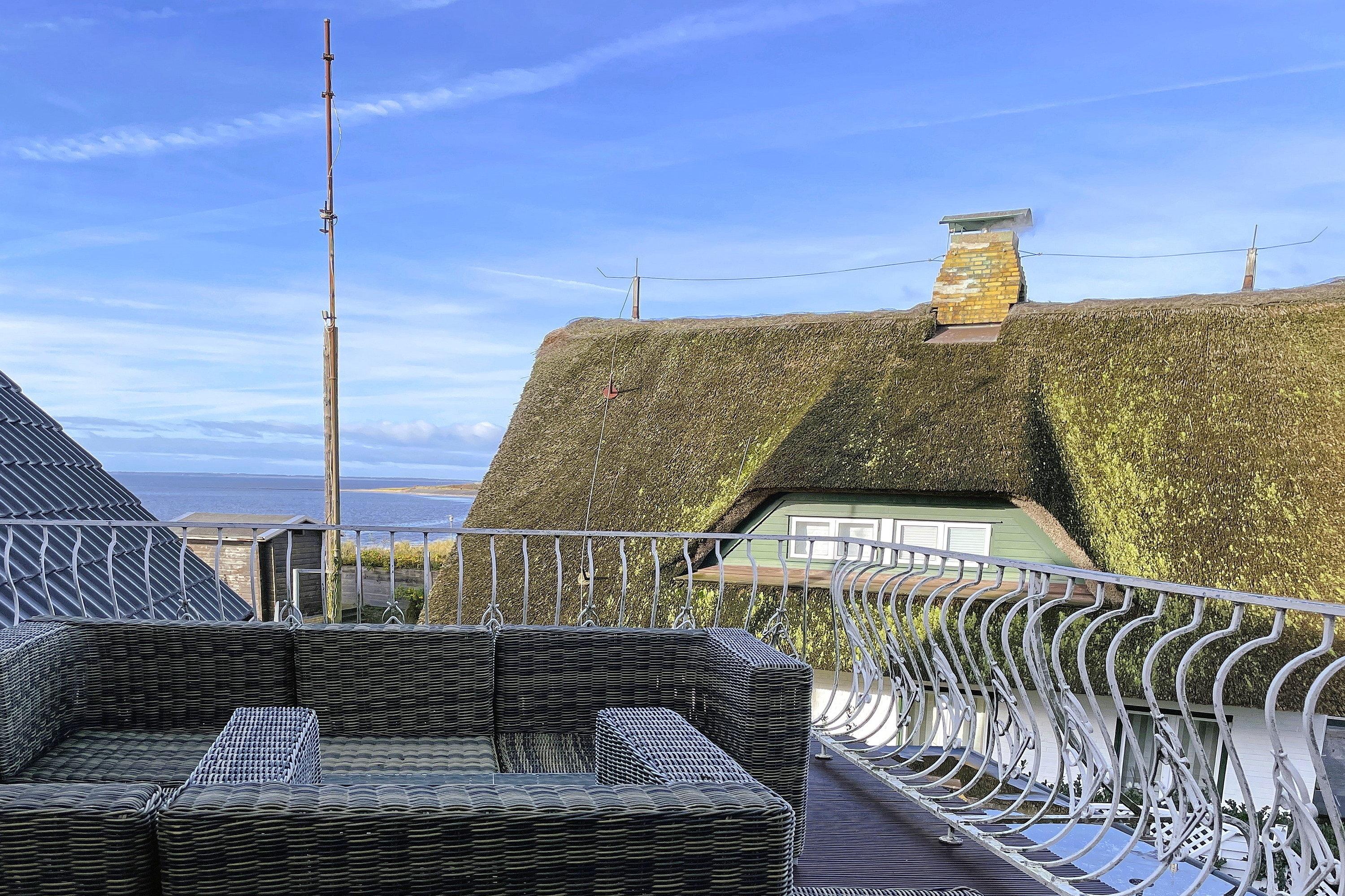 Ein besonderes Highlight ist die Aussicht vom Balkon, der sich direkt vom Wohnzimmer aus erreichen lässt. Hier können Sie an einem Tisch mit Sitzgelegenheiten Ihre Mahlzeiten genießen oder einfach Nordsee und Halligen bewundern. Das separate Schlafzimmer, zugänglich durch eine Glastür vom Wohnbereich aus, bietet ein großes Doppelbett für erholsame Nächte und einen geräumigen Kleiderschrank. Ein kleiner französischer Balkon ermöglicht einen zusätzlichen Blick über die gemeinschaftliche Dachterrasse auf das Meer - perfekt für romantische Momente. Das kompakte Badezimmer mit Dusche und WC grenzt direkt an das Schlafzimmer an und bietet alles Notwendige für Ihre tägliche Pflege.