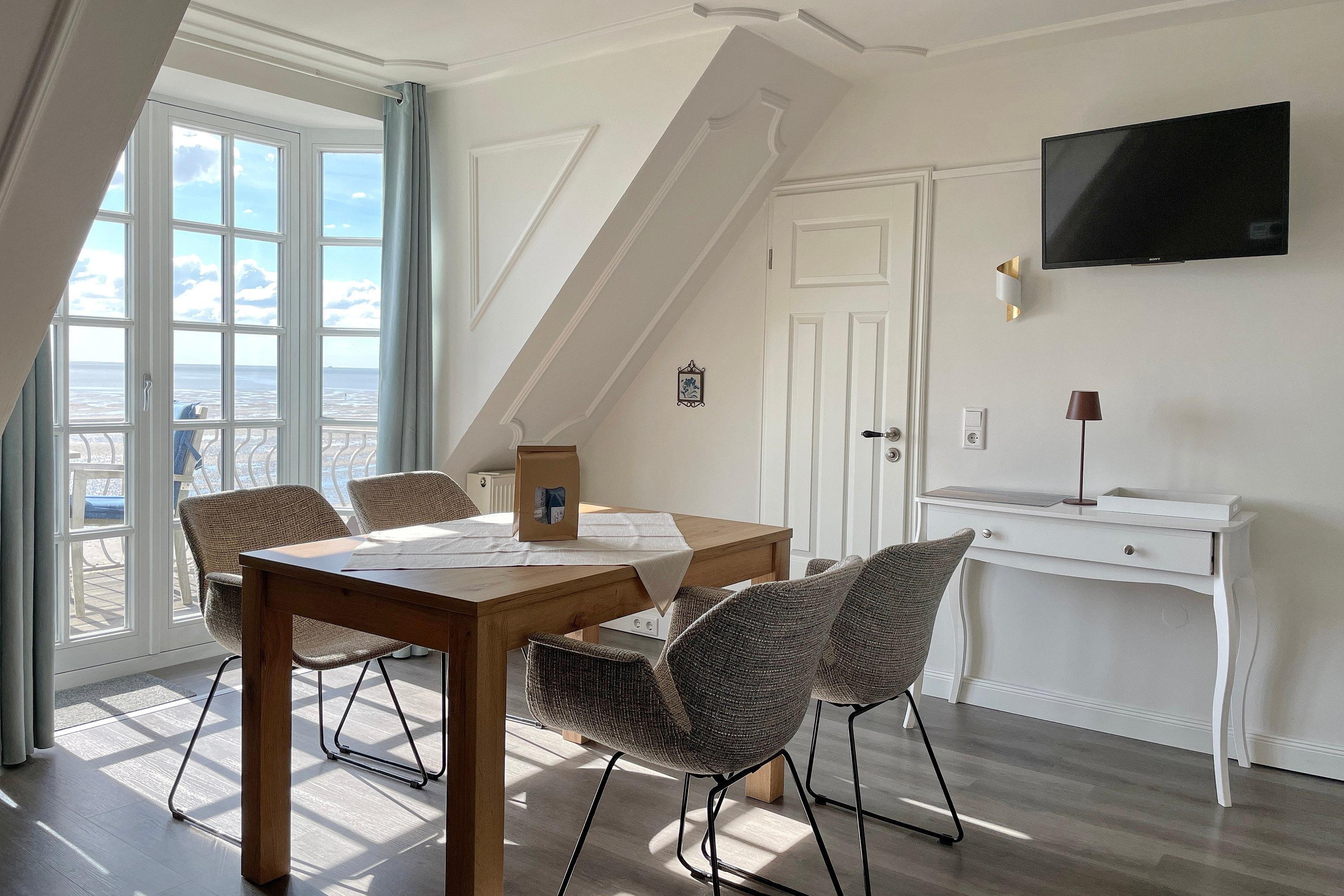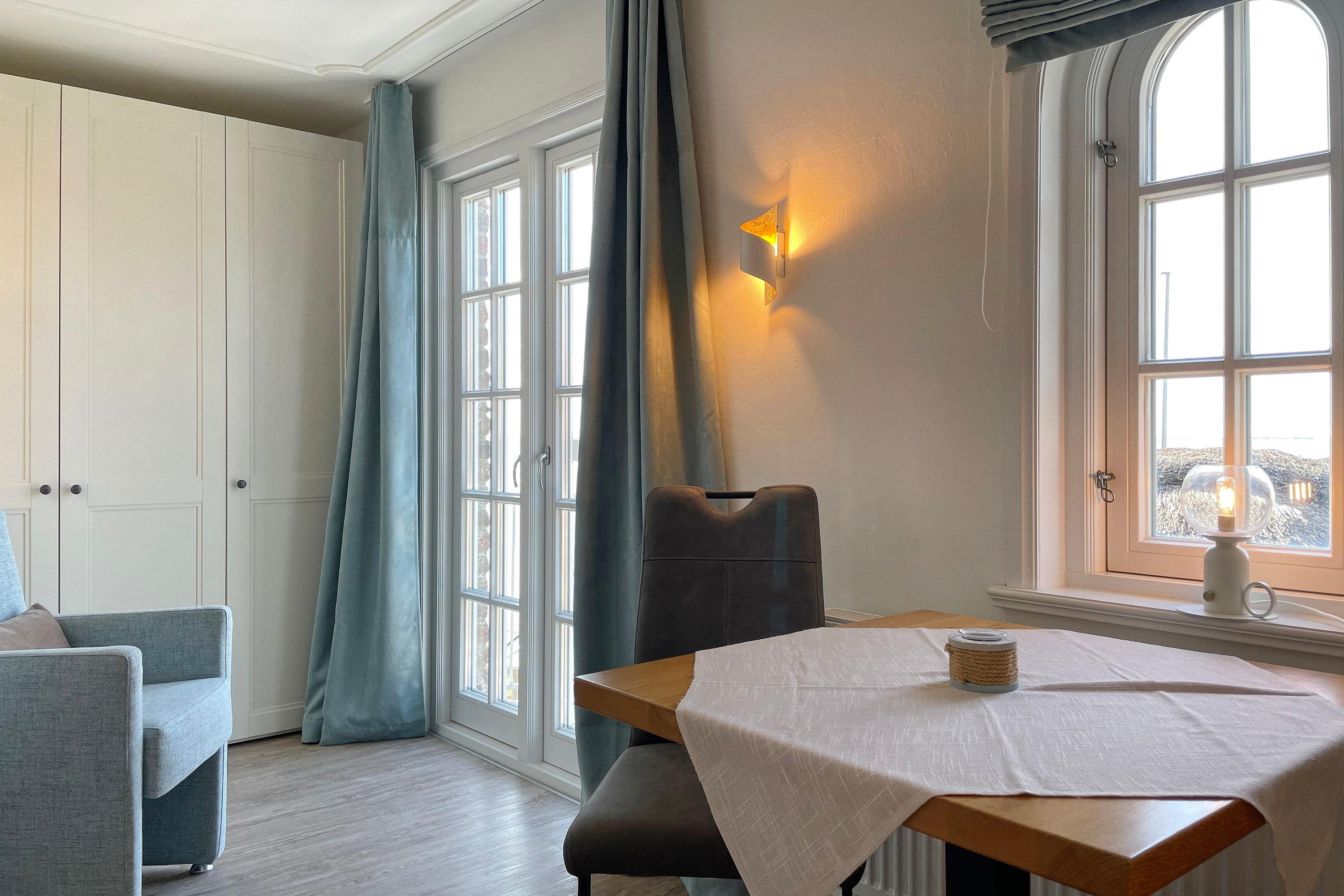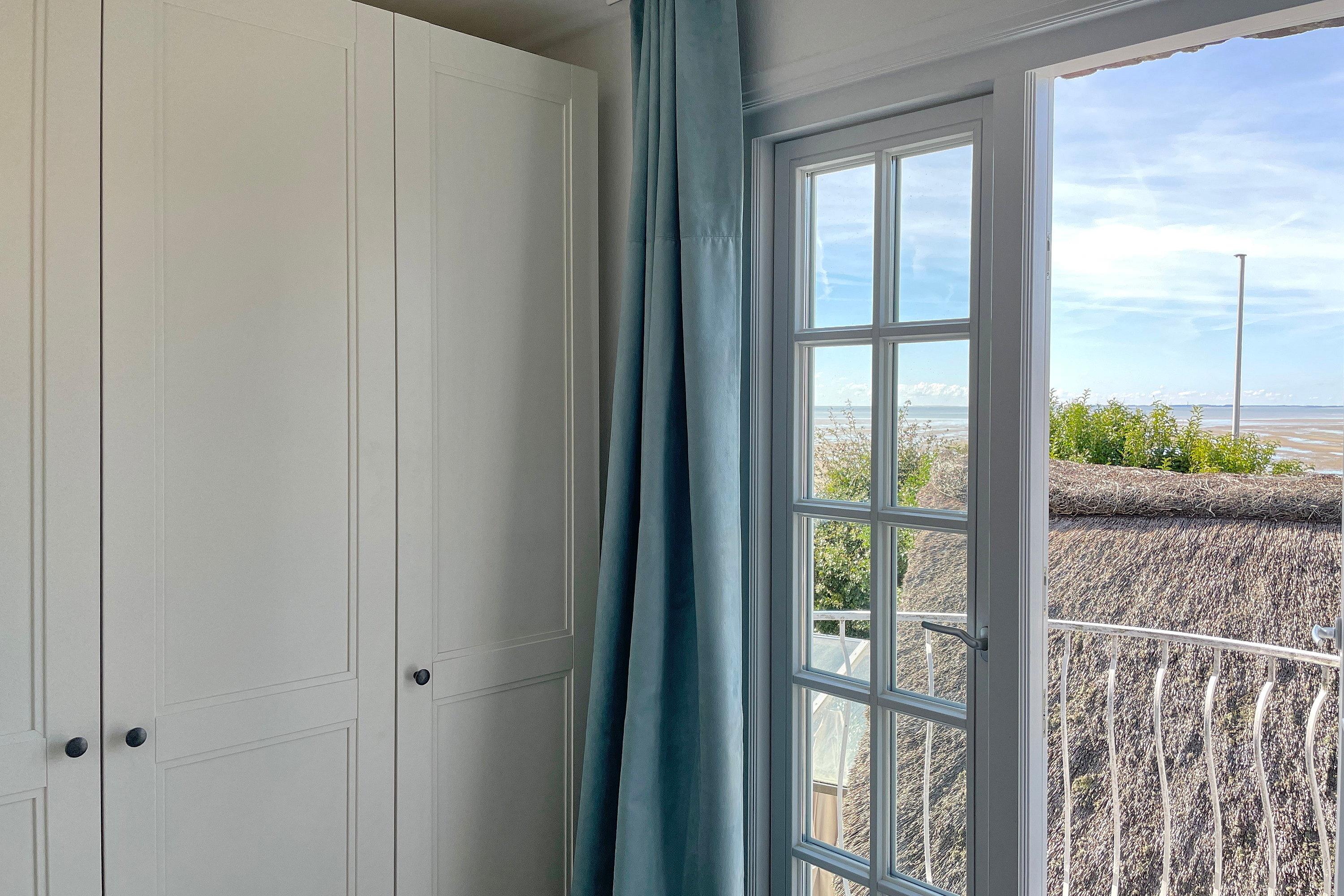 Erleben Sie unvergessliche Tage in dieser liebevoll eingerichteten Ferienwohnung. Vom Eingangsbereich mit Garderobe gelangen Sie in das Schlafzimmer mit einem komfortablen Doppelbett, einem großzügigen Kleiderschrank, einer gemütlichen Sitzecke und einem französischen Balkon. Das helle Wohnzimmer überzeugt mit einer integrierten Küchenzeile, einer einladenden Essecke und einer hochwertigen Schlafcouch, die Platz für ein bis zwei weitere Gäste bietet. Von hier aus treten Sie direkt auf den Balkon und genießen bei einer Tasse Kaffee oder einem Glas Wein den traumhaften Blick auf die Nordsee, die Halligen und die Insel Amrum. Ein besonderes Plus sind die zwei voll ausgestatteten Duschbäder, die zusätzlichen Komfort versprechen. Das Hus Lüttenblick ist der ideale Rückzugsort, um den Tag entspannt ausklingen zu lassen – hier erwartet Sie Ihre perfekte Auszeit an der Nordseeküste.