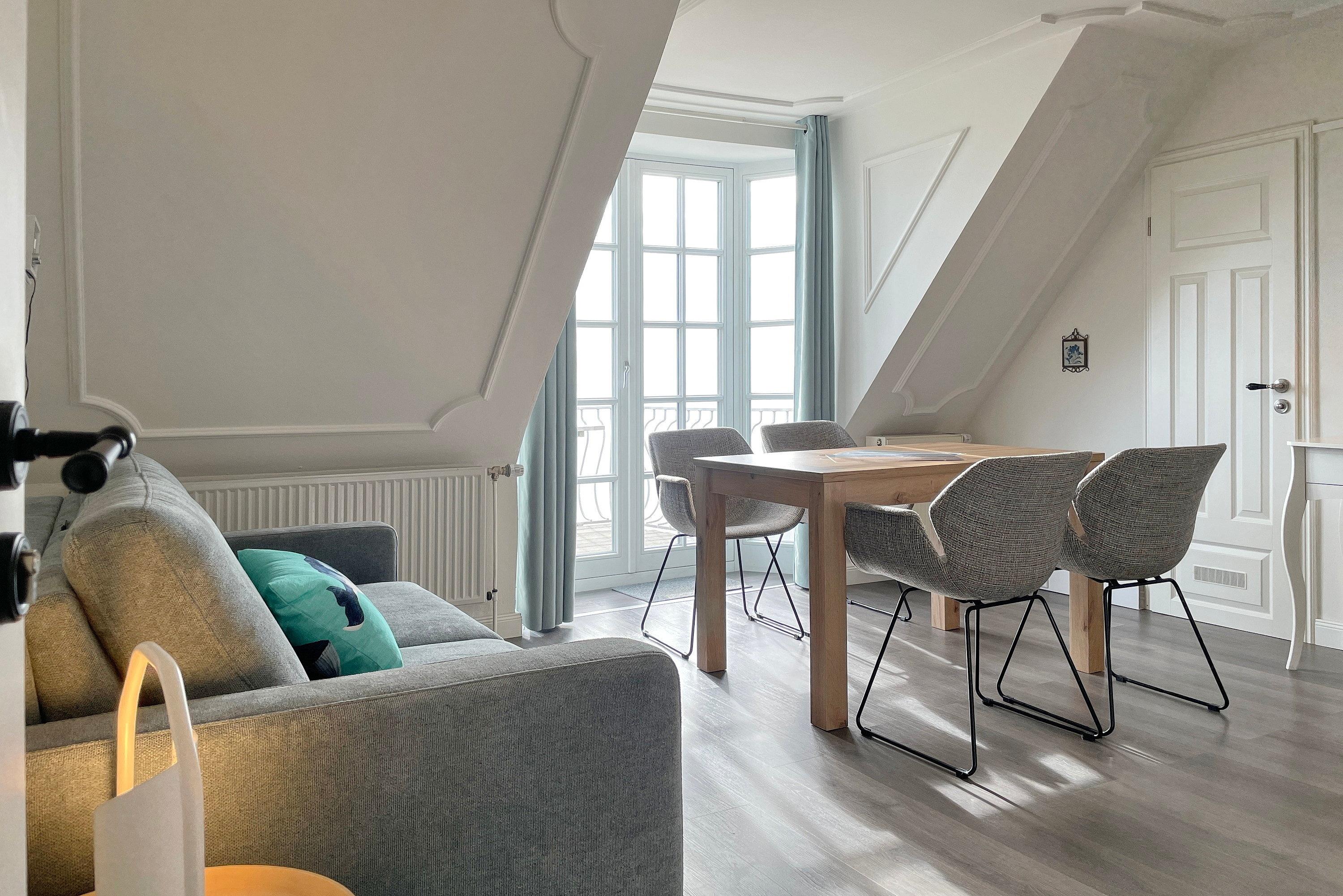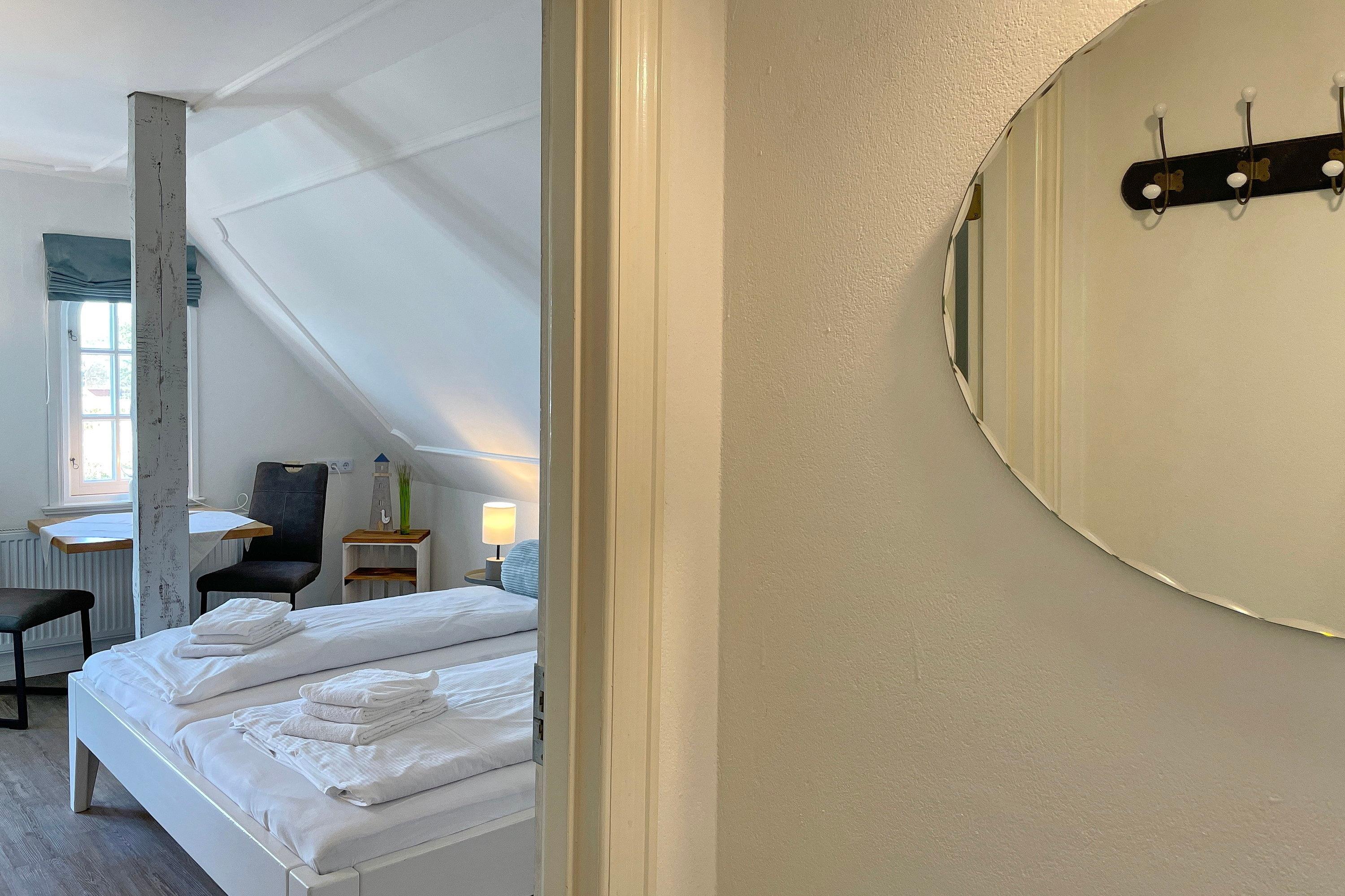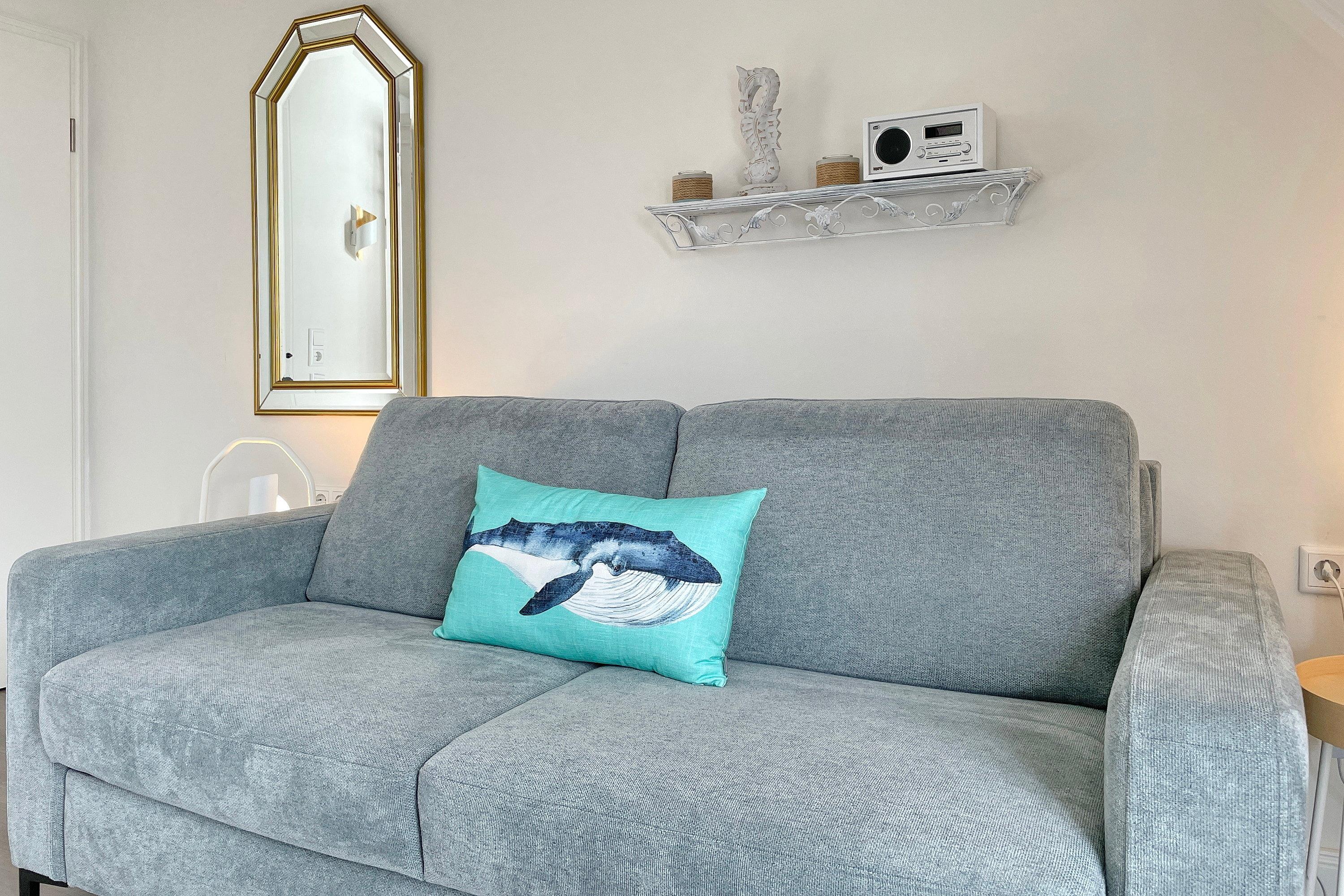 Erleben Sie unvergessliche Tage in dieser liebevoll eingerichteten Ferienwohnung. Vom Eingangsbereich mit Garderobe gelangen Sie in das Schlafzimmer mit einem komfortablen Doppelbett, einem großzügigen Kleiderschrank, einer gemütlichen Sitzecke und einem französischen Balkon. Das helle Wohnzimmer überzeugt mit einer integrierten Küchenzeile, einer einladenden Essecke und einer hochwertigen Schlafcouch, die Platz für ein bis zwei weitere Gäste bietet. Von hier aus treten Sie direkt auf den Balkon und genießen bei einer Tasse Kaffee oder einem Glas Wein den traumhaften Blick auf die Nordsee, die Halligen und die Insel Amrum. Ein besonderes Plus sind die zwei voll ausgestatteten Duschbäder, die zusätzlichen Komfort versprechen. Das Hus Lüttenblick ist der ideale Rückzugsort, um den Tag entspannt ausklingen zu lassen – hier erwartet Sie Ihre perfekte Auszeit an der Nordseeküste.