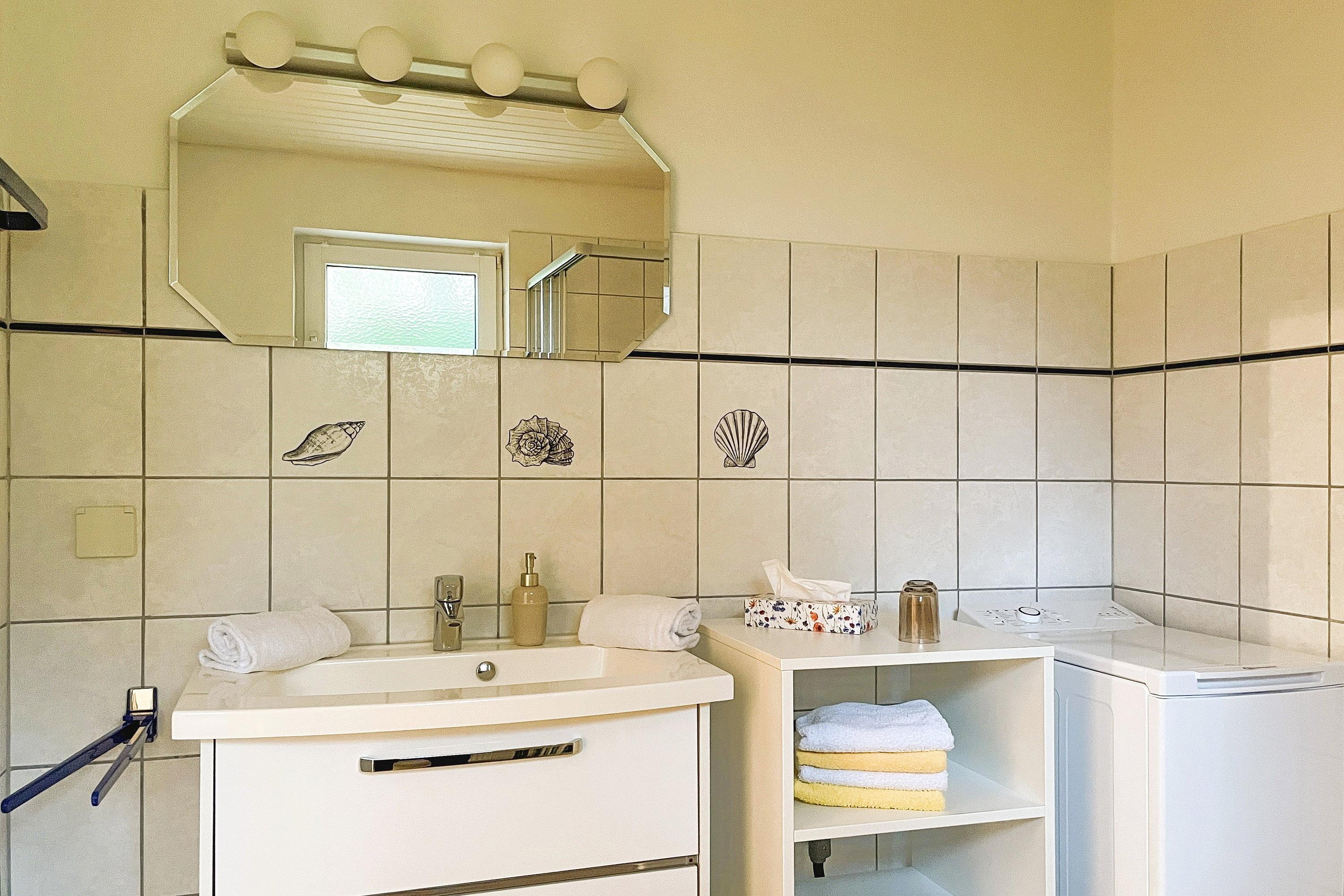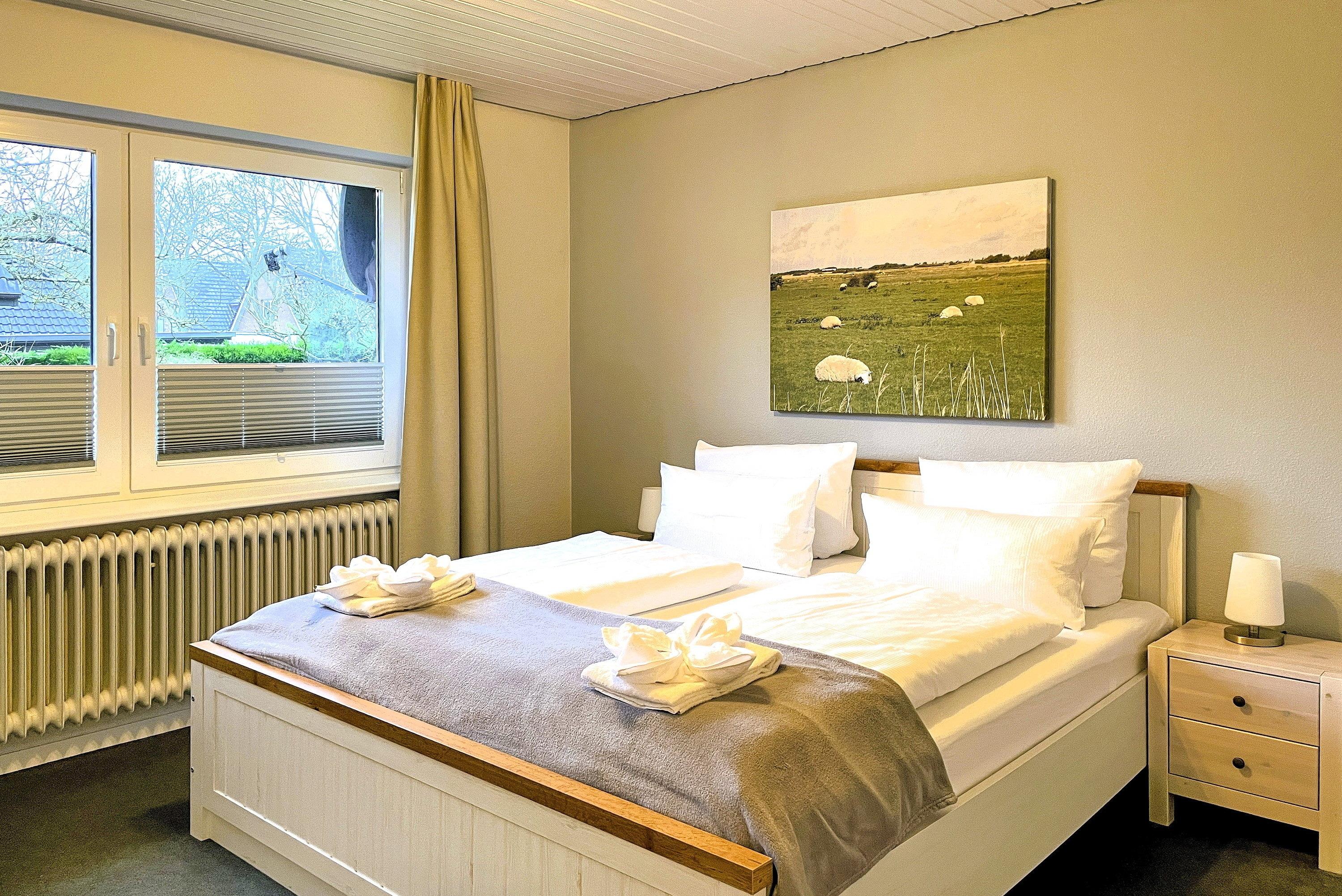 Entdecken Sie Ihr gemütliches Inselrefugium in der Ferienhaus Inselglück auf Föhr. Diese charmante Unterkunft bietet auf ca. 50 qm reichlich Platz für zwei Erwachsene, die ein eigenes "Häuschen" schätzen. Über einen privaten Eingang betreten Sie die Wohnung und werden sofort von einem freundlichen Ambiente empfangen. Der lichtdurchflutete Wohnraum bildet das Herzstück der Unterkunft und besticht durch eine hochwertige Schlafcouch sowie eine weiße Essecke, die zu gemütlichen Mahlzeiten einlädt. Von hier aus gelangen Sie direkt in den Gemeinschaftsgarten mit Ihrer eigenen Terrasse, wo Sie entspannen und die frische Nordseeluft genießen können. Die separate Küche ist gut ausgestattet und lässt keine Wünsche offen. Hier finden Sie alles, was Sie für die Selbstversorgung benötigen, sowie eine kleine Sitzecke für schnelle Mahlzeiten. Im praktischen Badezimmer erwarten Sie eine Dusche und ein Waschmaschine zur kostenfreien Nutzung. Das Schlafzimmer ist im nordischen Stil gehalten und bietet ein komfortables Doppelbett sowie inseltypische Accessoires, die das Föhr-Feeling unterstreichen. Erleben Sie einen unvergesslichen Wohlfühlurlaub in Ihrem eigenen Föhrer Refugium. Unser Inselglück vereint Komfort, Privatsphäre und Charme der Nordseeinsel – perfekt für Ihren nächsten Inselurlaub zu Zweit.