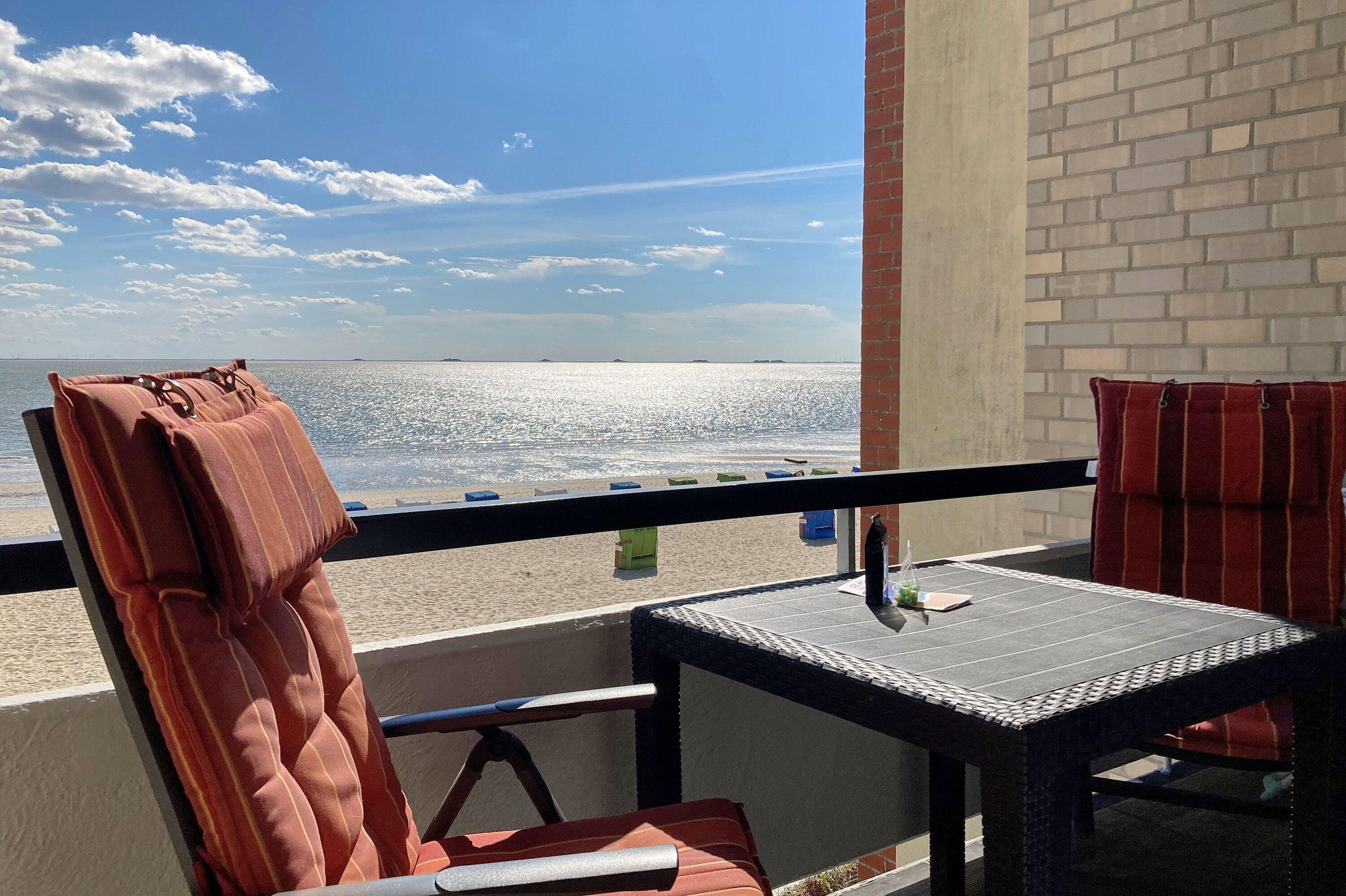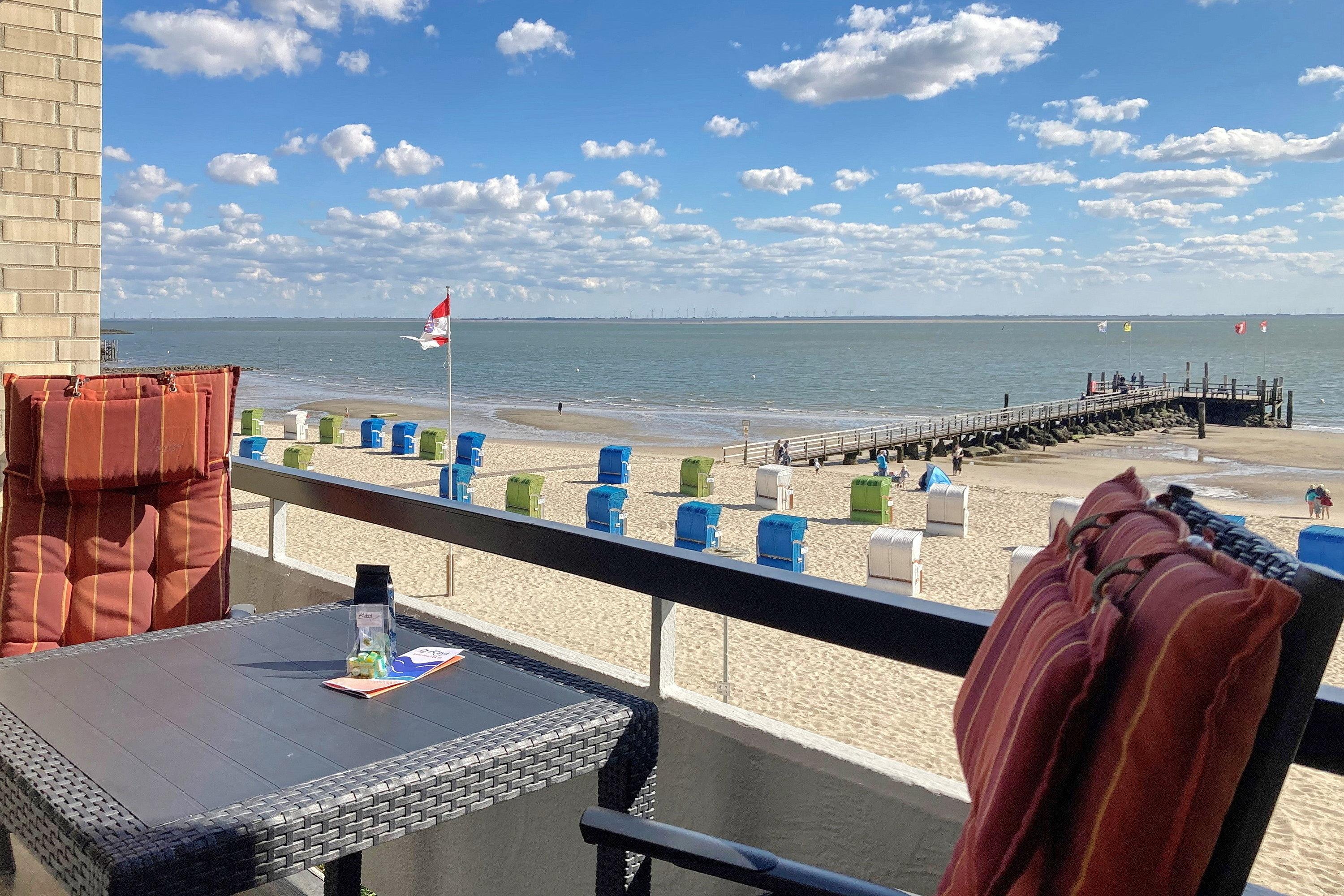 Windgeschützt in der Logia des Hauses Irma am Sandwall in Wyk genießen Sie bei jedem Wetter die Aussicht auf den Strand und das Wattenmeer. Ein besonders schöner Moment ist, wenn die Sonne am Meereshorizont erwacht..