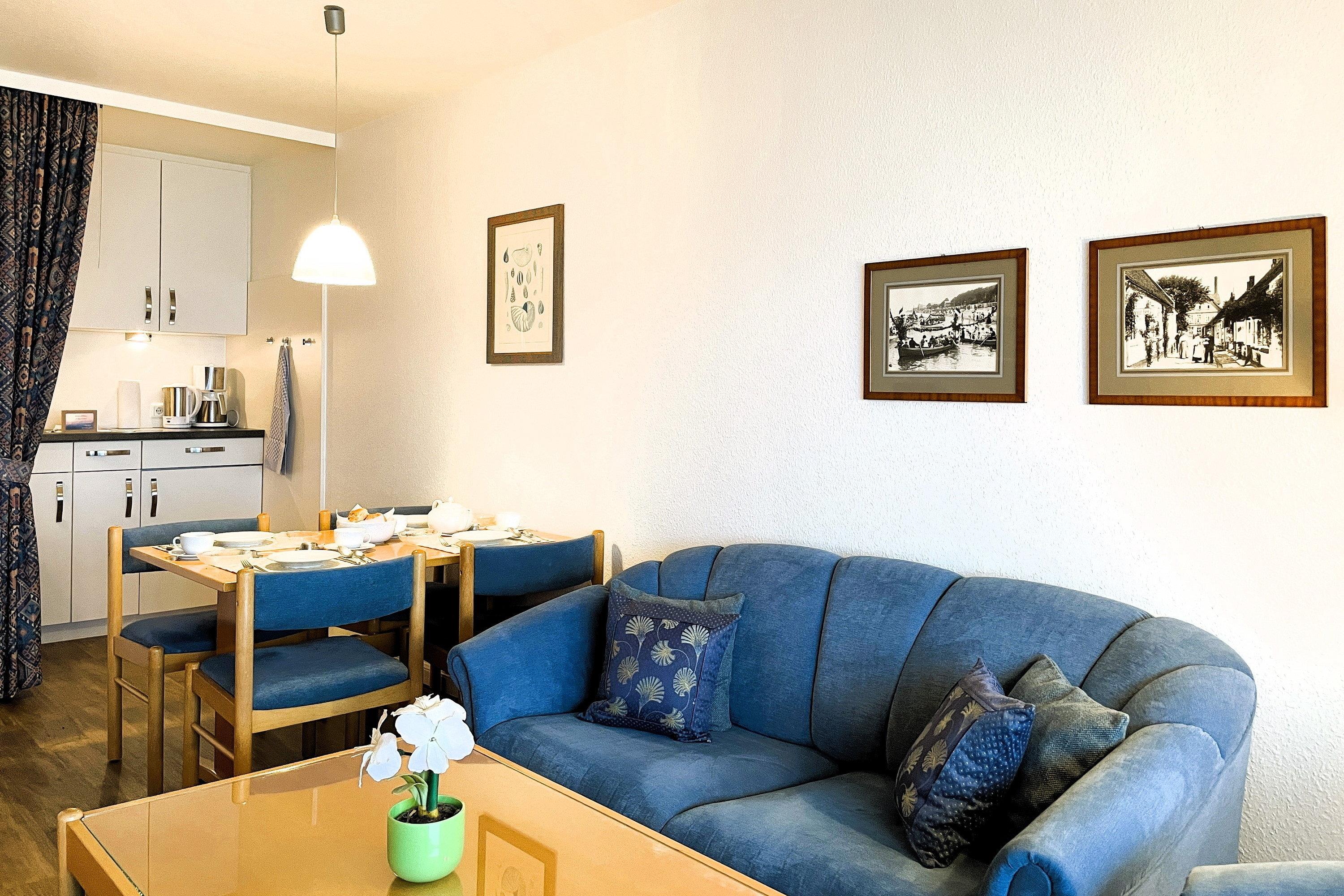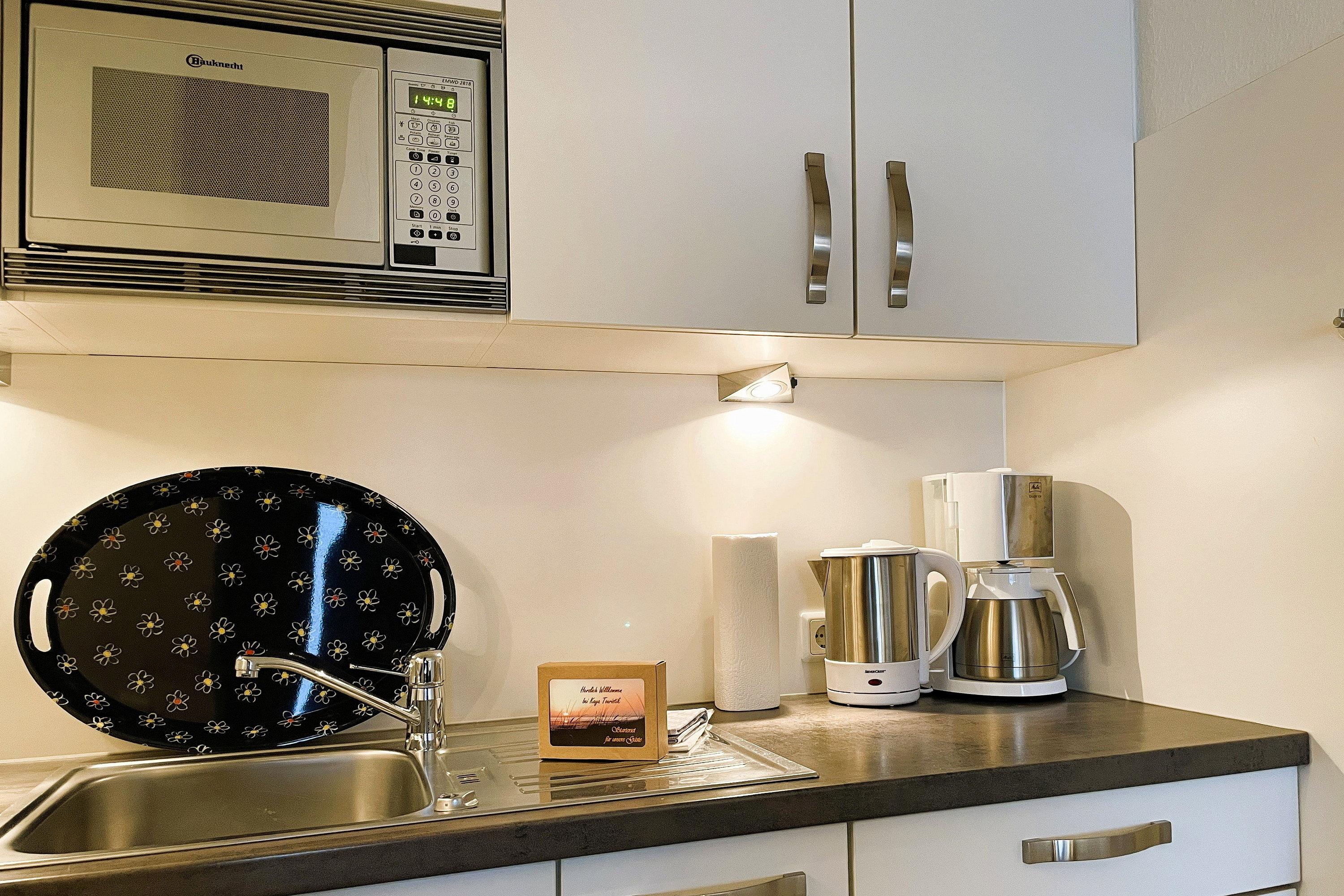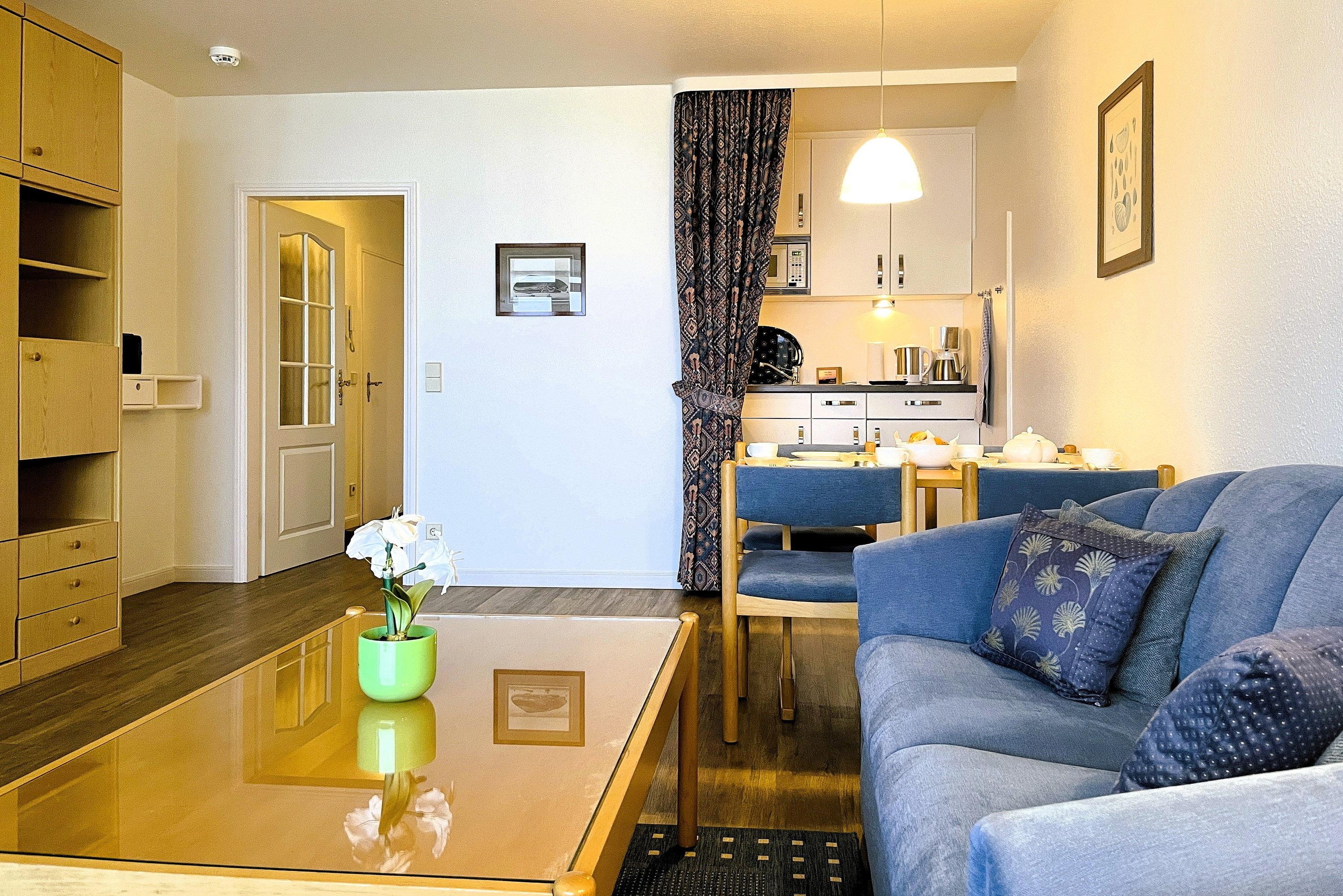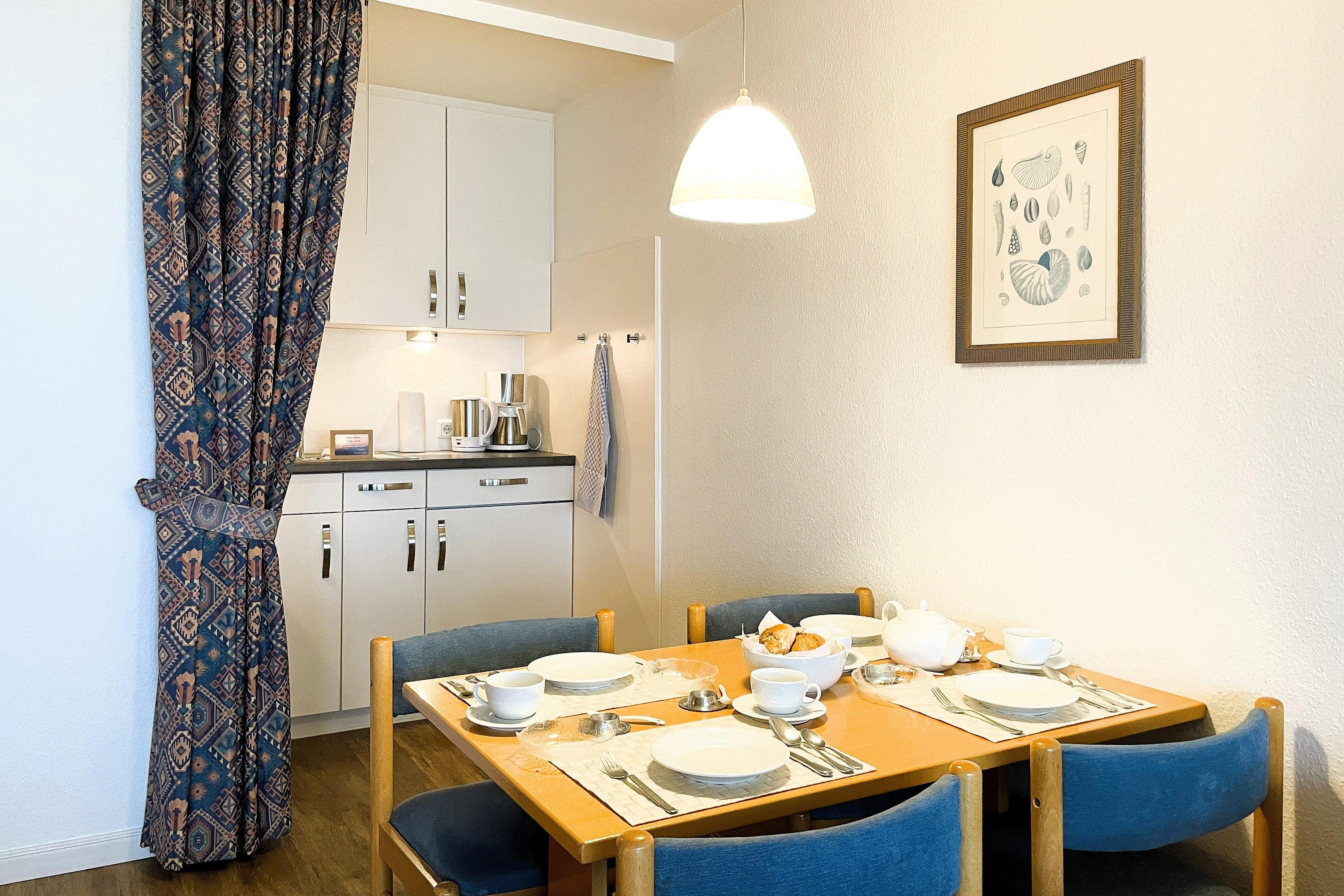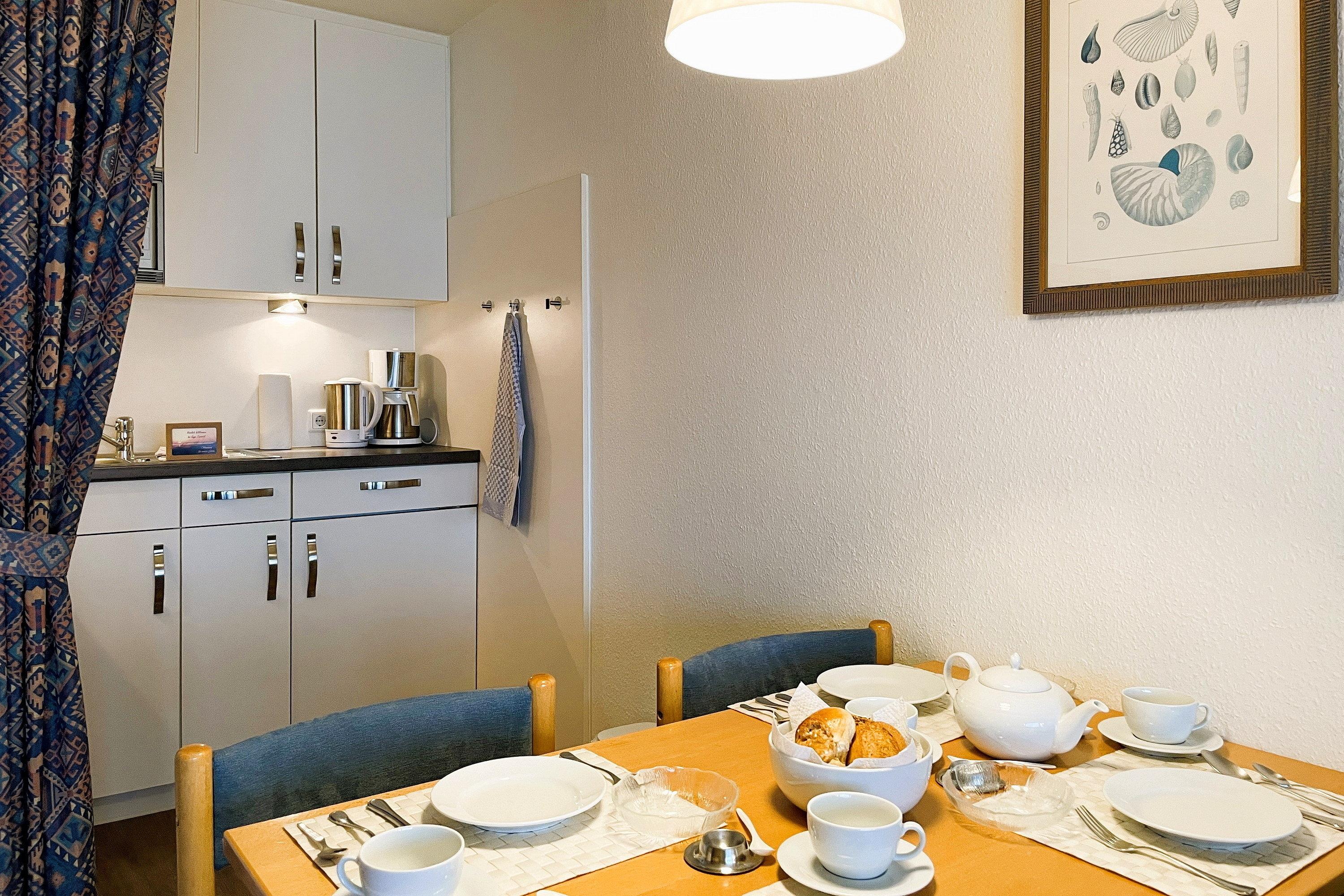 Bestehend aus einem Schlafzimmer mit Doppelbett (180 x 200cm), einem hellen und großen Wohnschlafzimmer mit Schrankbetten (180 x 190cm), einer Küchenzeile und einem gemütlichem Essbereich bietet die Wohnungen bis zu 4 Personen Platz. Ein zusätzliches Babybett kann ebenfalls aufgestellt werden. Die moderne, liebevoll in Stil und Farben abgestimmte Einrichtung erfüllt gehobene Ansprüche und lässt Sie Ihre Urlaubstage mit allem nötigen Komfort so richtig genießen. Die Küche verfügt u.a. über Mikrowelle, Toaster, Kaffeemaschine und Wasserkocher usw...