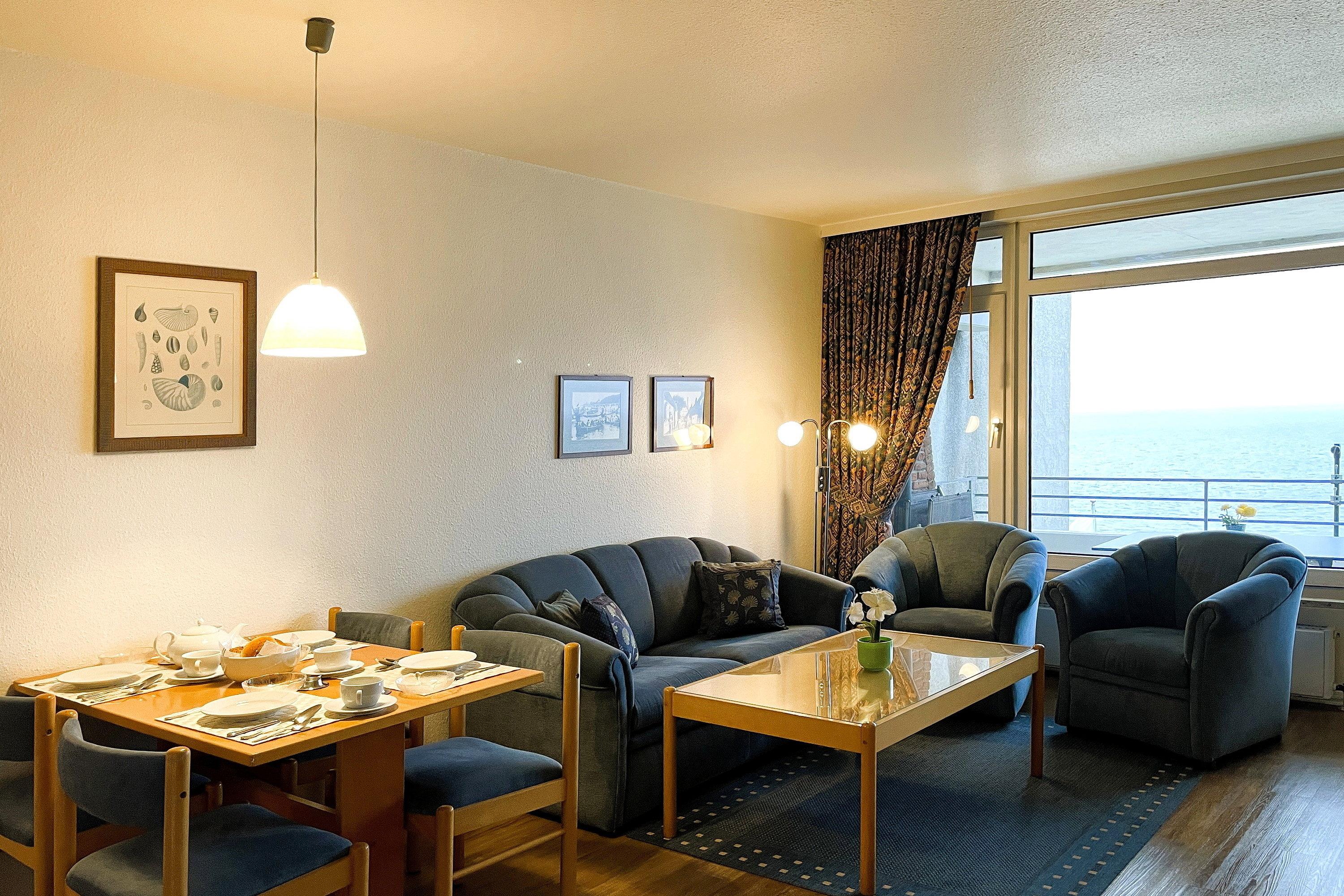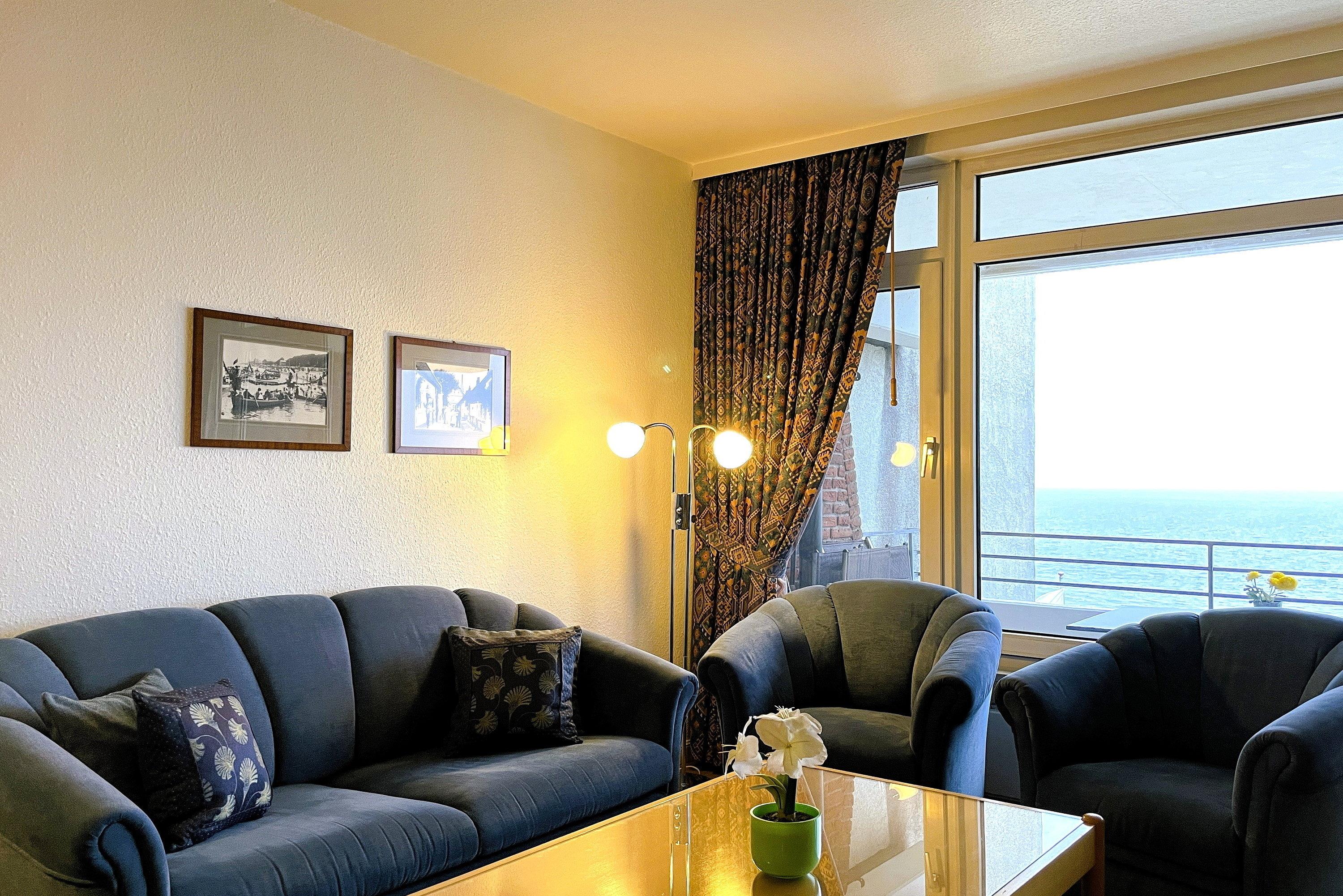Von der riesigen Fensterfront des Wohnzimmers und dem sonnigen Balkon können Sie den direkten Meerblick genießen, der Sie zu einem ausgiebigen Urlaubsfrühstück einlädt.