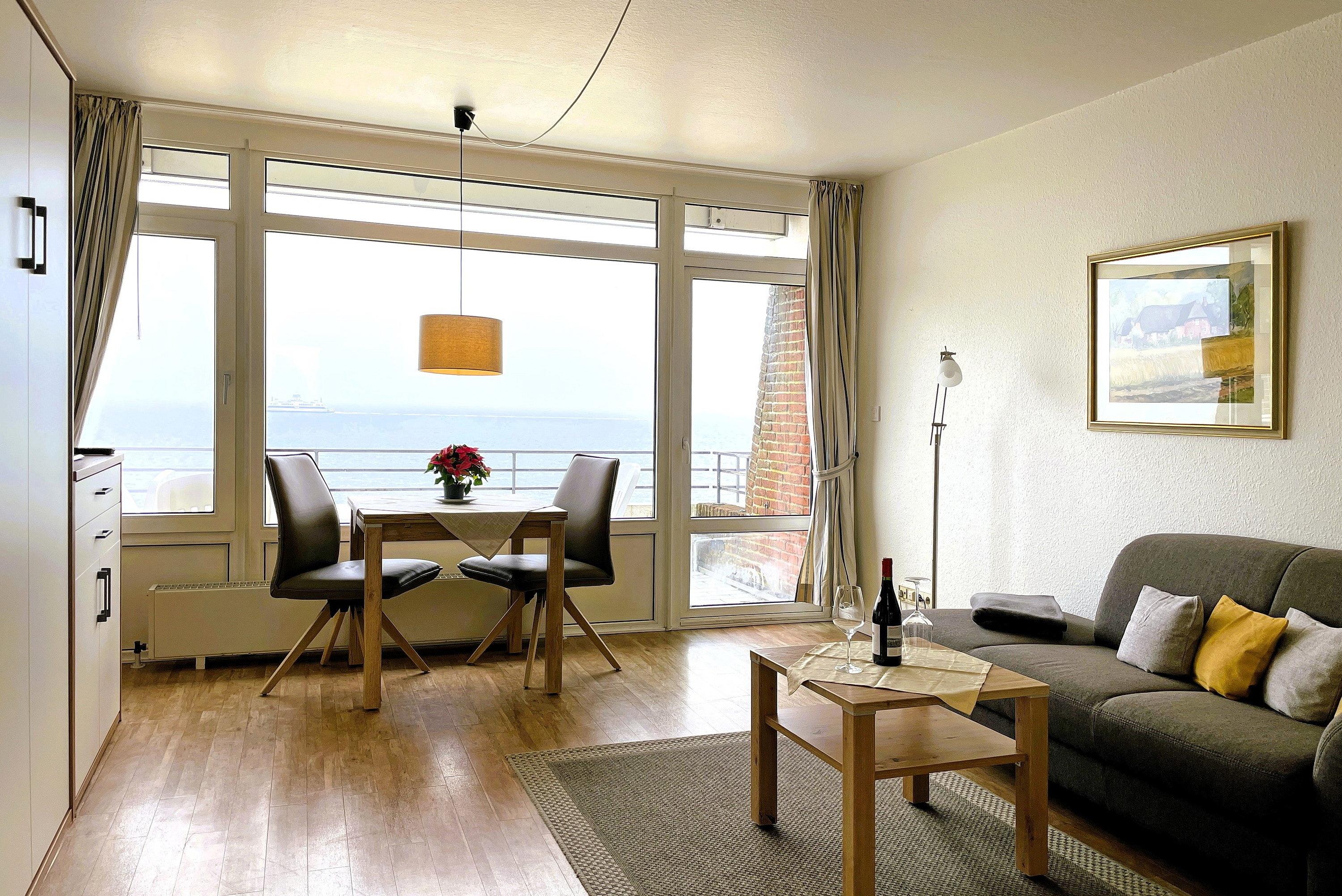 Im ruhigeren Abschnitt des belebten Sandwalls befindet sich das Haus Klaar Kiming direkt vor der Strandpromenade. In wenigen Minuten sind Sie mitten im Geschehen und können die vielen freundlichen Cafés und Restaurants besuchen, in den kleinen Geschäften bummeln gehen oder sich im Aquaföhr vergnügen. Im Haus befindet sich eine Waschmaschine und Trockner, die gegen eine geringe Gebühr zur gemeinschaftlichen Nutzung bereitsteht. Vom Keller aus gelangen Sie durch einen zweiten Eingang (Ostern bis Ende Oktober wetterabhängig) auch direkt an die Promenade und den Strand. Die Wohnungen bieten hier einen herrlichen Blick über das Meer und Sie können die Fähren, die Möwen und Ebbe und Flut vom Balkon oder der Terrasse aus beobachten. Unsere gemütliche Wohnung Klaar Kiming 5b befindet sich im 5. Obergeschoss des Hauses, welche Sie bequem mit dem Aufzug oder sportlich über die Treppe erreichen können. Der lichtdurchflutete Wohnschlafraum mit integrierter Küchenzeile ist ausgestattet mit WLAN, Flachbild-TV, einer bequemen Sitzgruppe und einem Esstisch, der sich direkt vor der Fensterfront befindet und Sie schon beim Frühstück mit dem Anblick des Meeres verwöhnt. Die im Wohnzimmer integrierte Küchenzeile ist ausgestattet mit einem Ceranfeldherd, einer Mikrowelle mit Grillfunktion, Geschirrspüler und einem Kühlschrank mit Gefrierfach. Das Doppelschrankbett (160x190cm) verspricht ruhige Nächte und das kleine Badezimmer mit Dusche ist funktional und freundlich gestaltet. Der Balkon mit Markise bietet Ihnen den unvergleichbaren Blick über den Strand und das Meer, der zum Träumen einlädt. Des Weiteren können Sie direkt durch das Untergeschoss des Hauses auf die Strandpromenade gelangen und zwischen einem erlebnisreichen Arbeitstag und dem Abendessen noch eine Runde in der Nordsee schwimmen. Erleben Sie entspannte Urlaubstage auf unserer herrlichen Insel!