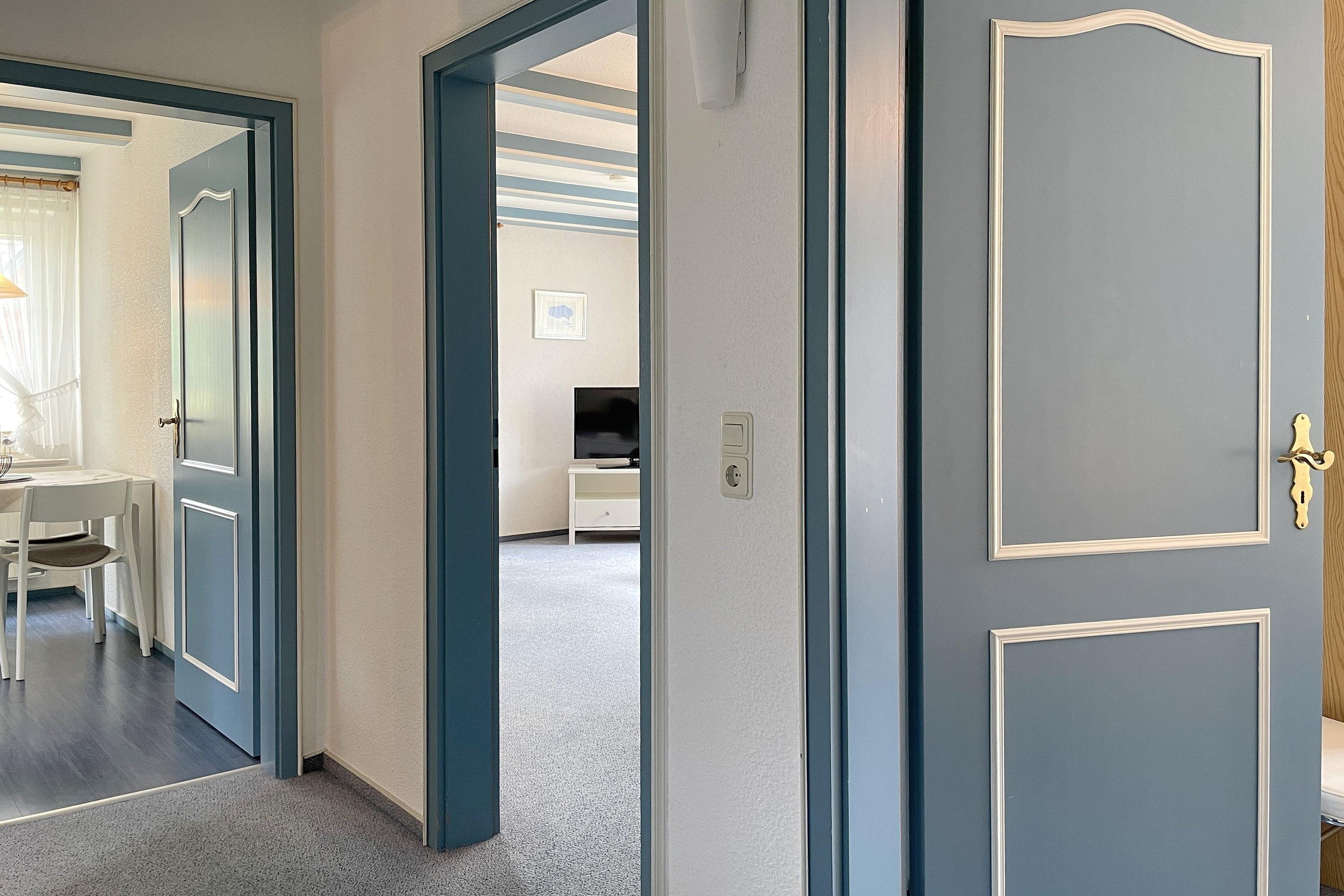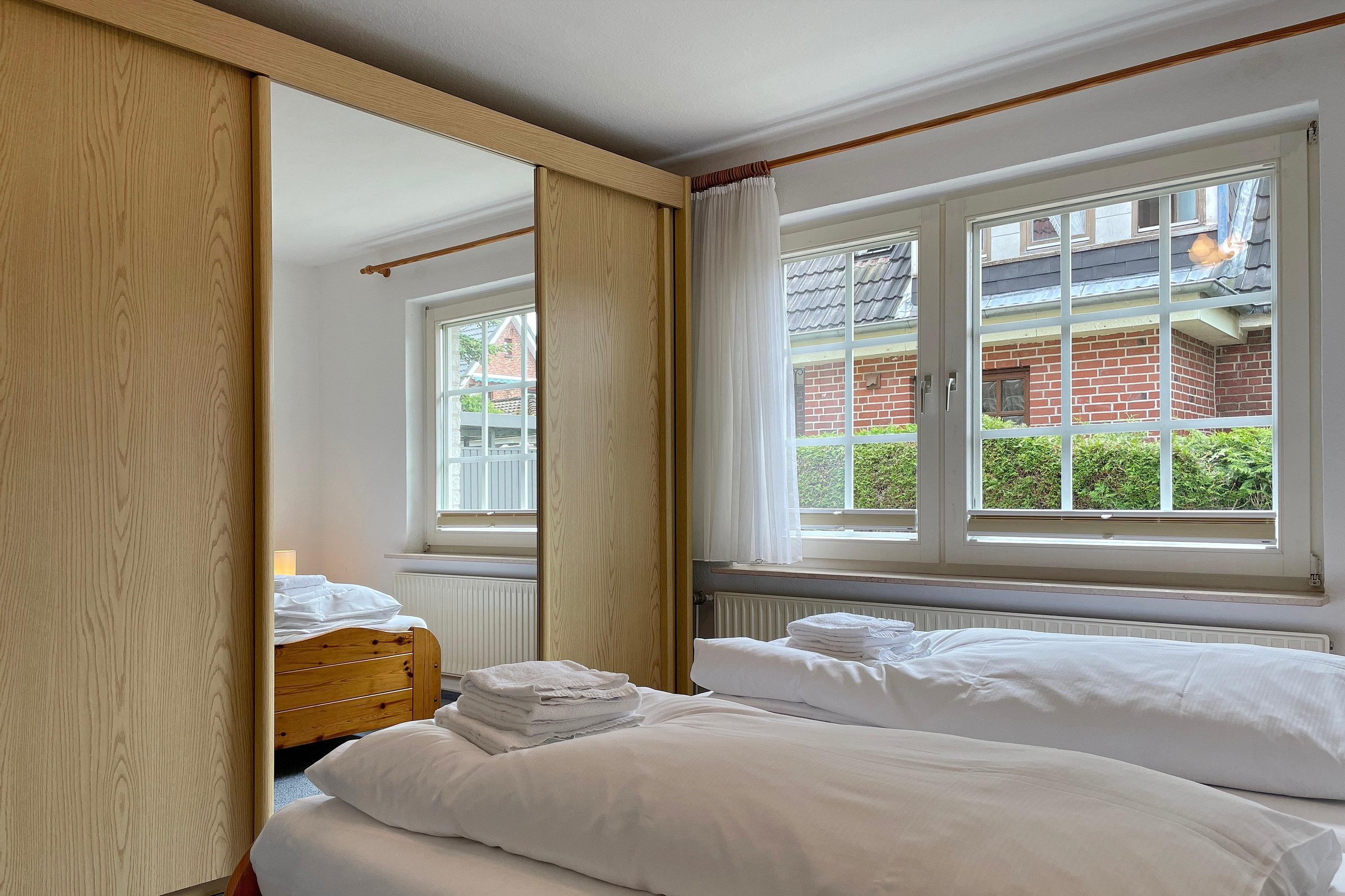 Die behagliche Erdgeschosswohnung Manuela Sieck EG bietet Platz für 4 Personen. Das geräumige Wohnzimmer mit Flachbild-TV, WLAN, CD-Player mit Kassettenfach und einer kleinen Auswahl an Büchern verfügt über eine moderne Sitzgruppe bestehend aus zwei Sofas und einem Lesesessel ist maritim eingerichtet. Hier befindet sich ein gemütliches Doppelschrankbett (160x 200 cm). Die Wohnküche mit Essplatz für 4 Personen, Ceranfeldherd, Backofen, Kühlschrank mit Gefrierfach, Geschirrspüler und Mikrowelle ist gut ausgestattet. Geruhsame Nächte verspricht das Schlafzimmer mit Doppelbett (180x190 cm) und einem Einzelbett (90x190cm) sowie dem geräumigen Kleiderschrank. Das kleine Duschbad mit Fenster ist funktional. Genießen Sie den maritimen Charme dieser Wohnung und verbringen Sie herrliche Urlaubstage. Wunderbar eignet sich dieses Domizil auch für zwei befreundete Familien, die gerne zusammen in Urlaub fahren möchten, dabei aber auch Ihre eigene Ruhezone besitzen möchten. Wir freuen uns auf Ihren Anruf!
