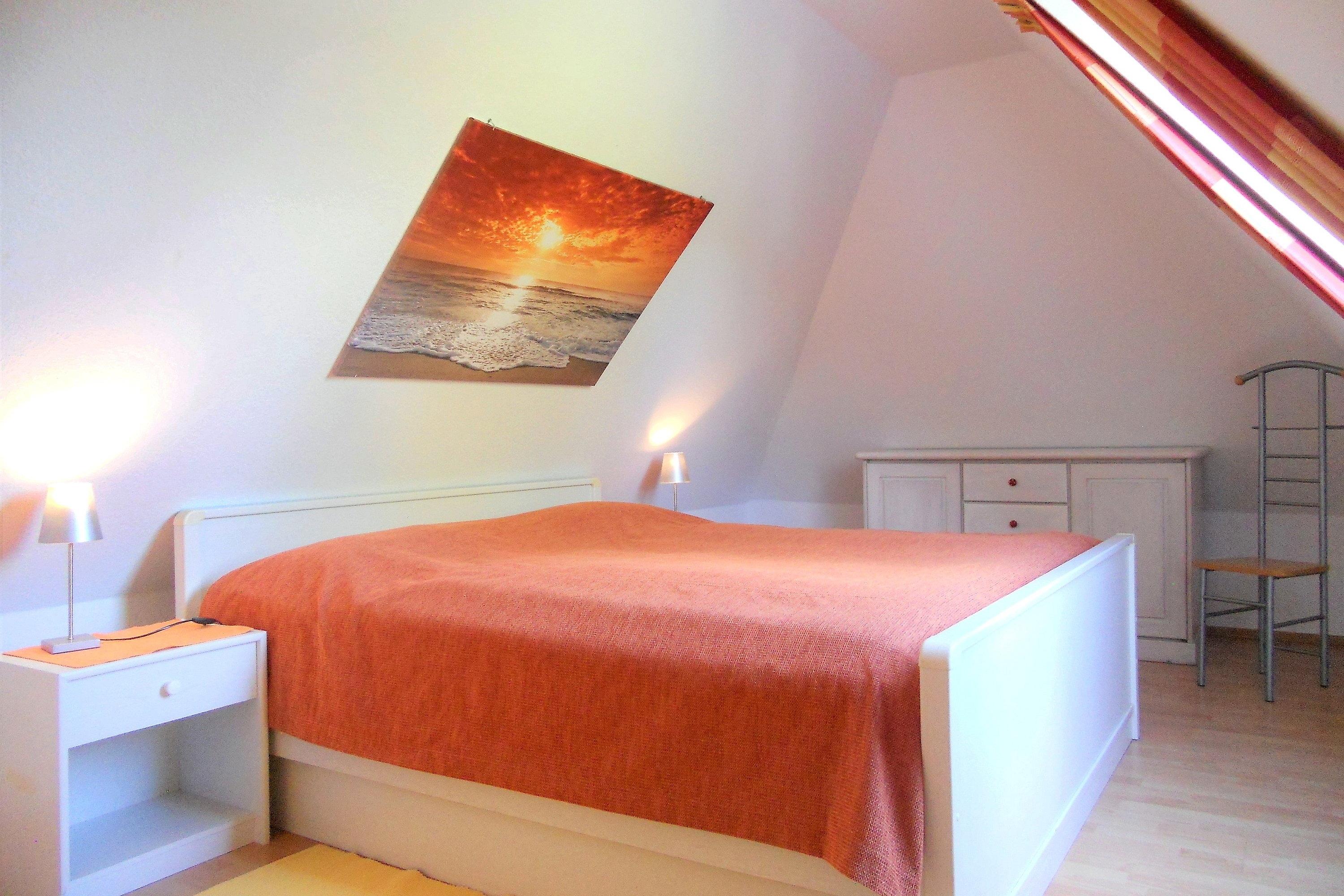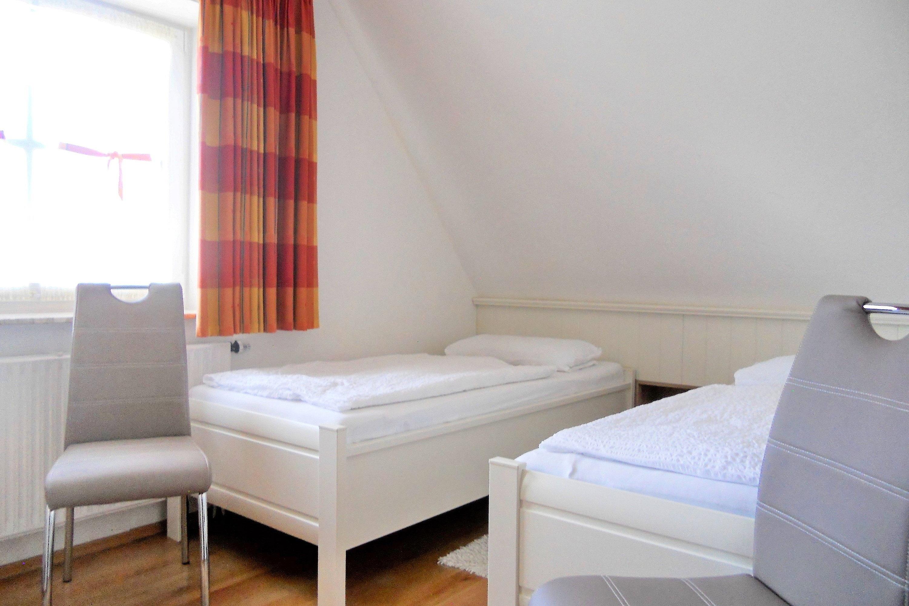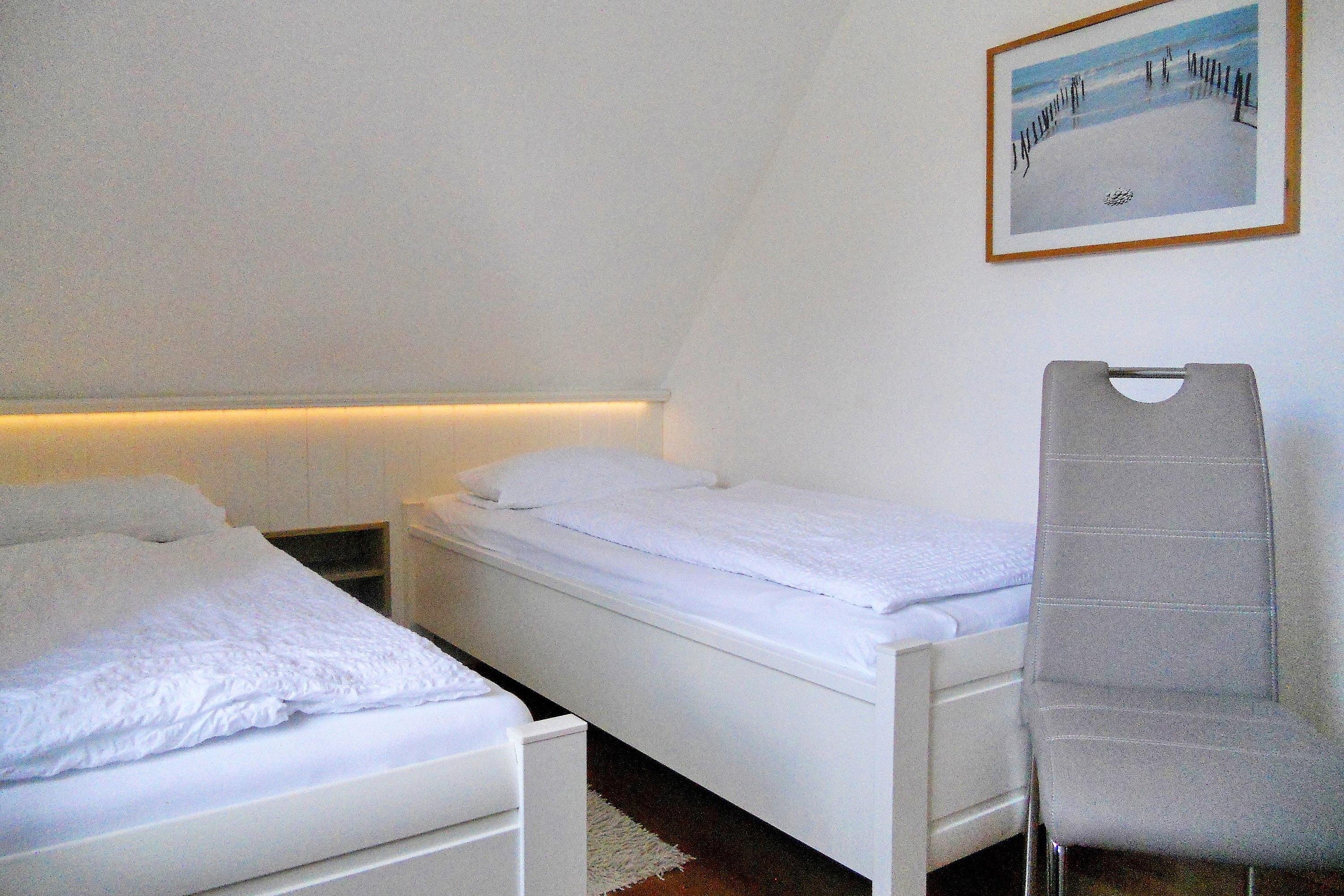 Im Herzen von Wyk gelegen, befindet sich in ruhiger Lage unser Domizil Rugstieg 8 mit seinen 4 Ferienwohnungen für 2 bis 5 Personen. Die Wohnungen des Hauses sind allergiker- und kinderfreundlich eingerichtet. Unsere Wohnung Rugstieg 8/4 erstreckt sich über das erste und zweite Obergeschoß und bietet bis zu 4 Personen genügend Platz für herrliche Urlaubstage. Das gemütlich eingerichtete Wohnzimmer ist liebevoll gestaltet und technisch gut ausgestattet mit WLAN, Telefon, Stereoanlage, Flachbild-TV und DVD-Player. Hier befindet sich auch der Essplatz neben der Treppe, die hinaus zum offenen Dachgeschoss-Schlafzimmer mit Doppelbett führt. Auf der ersten Etage befindet sich weiterhin ein Schlafzimmer mit zwei Einzelbetten, das Bad mit Dusche und Föhn sowie die separate Küche mit Ceranfeld-Herd und Backofen, Geschirrspüler, Mikrowelle und vielem mehr. Probieren sie doch mal friesische Gerichte in Ihrem Urlaub aus. In der Wyker Innenstadt finden Sie freundliche Buchhändler, die schöne friesische Kochbücher anbieten. Im Untergeschoss des Hauses befindet sich eine Sauna mit einigen Fitnessgeräten sowie Waschmaschine und Trockner zur gemeinsamen kostenfreien Nutzung. Das gepflegte Haus mit dem idyllischen Garten liegt wenige Meter vom Wyker Stadtwäldchen mit dem Abenteuerspielplatz Löwenhöhle entfernt und lädt somit Jung und Alt zum Spazierengehen und Verweilen ein. In ca. 10 Gehminuten erreichen Sie den Strand und das Meer sowie die Fußgängerzone mit zahlreichen Cafés, kleinen Geschäften und Restaurants. Schauen Sie sich die Wohnungen an und überzeugen Sie sich selbst! Wir freuen uns auf Ihren Anruf.