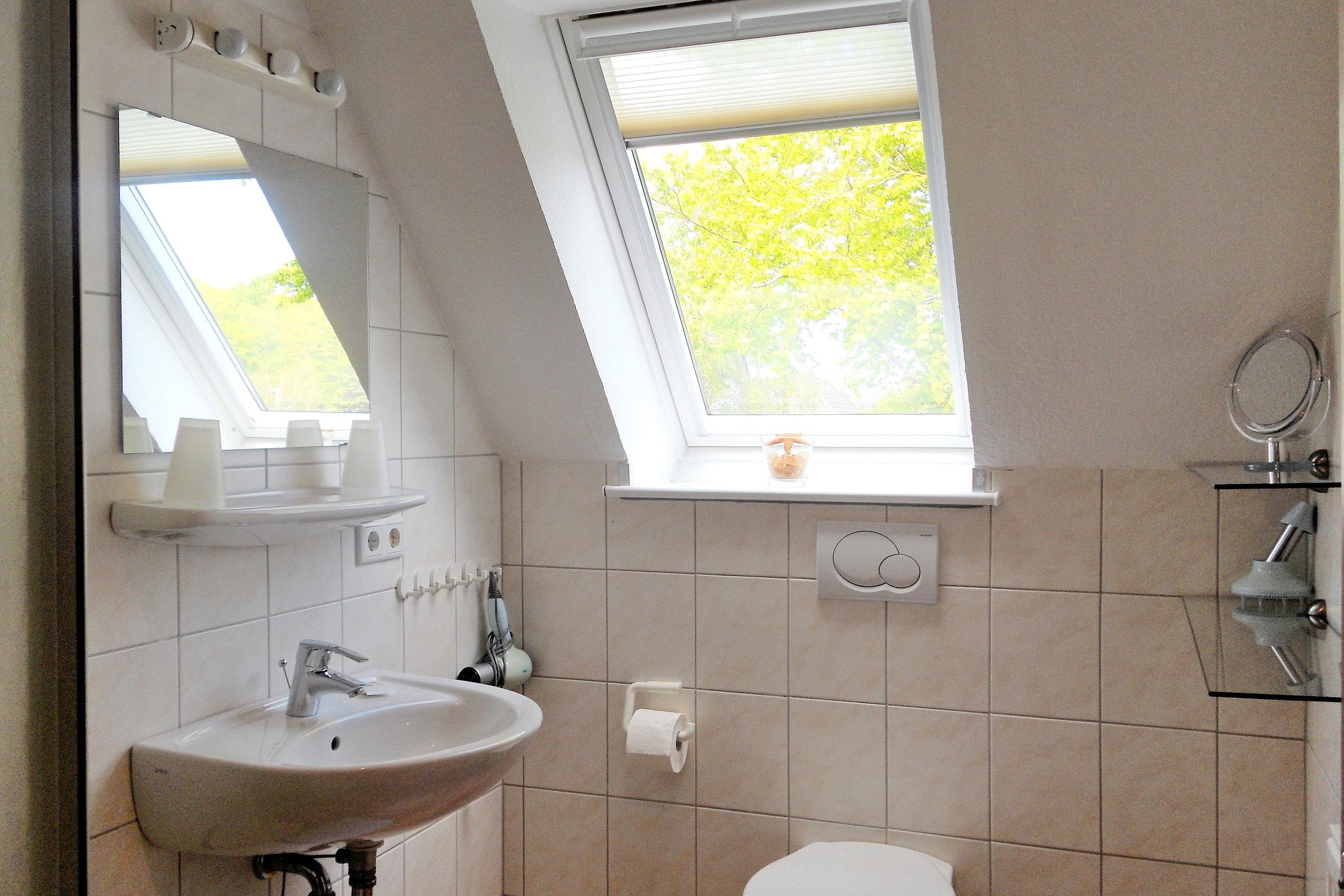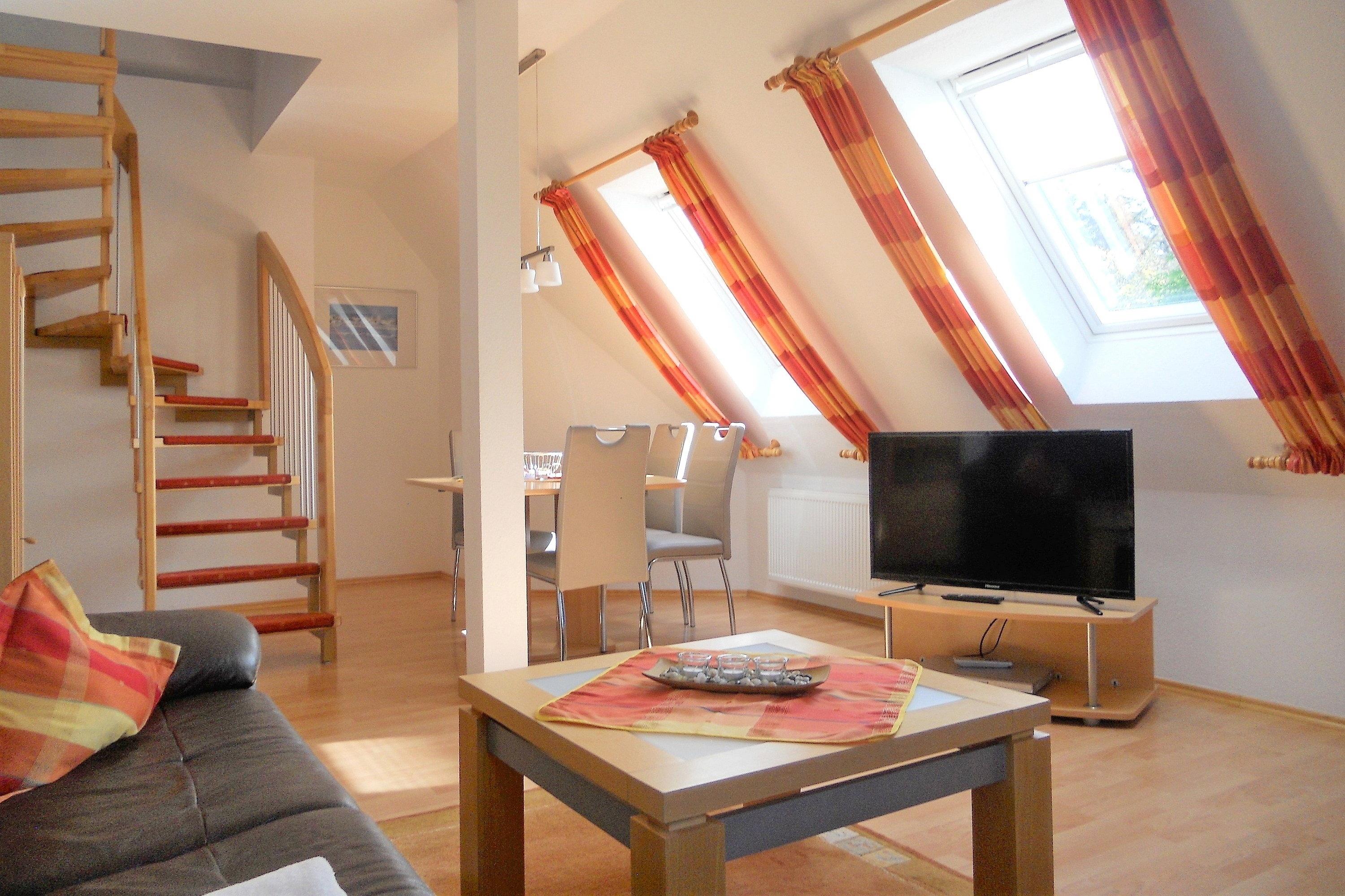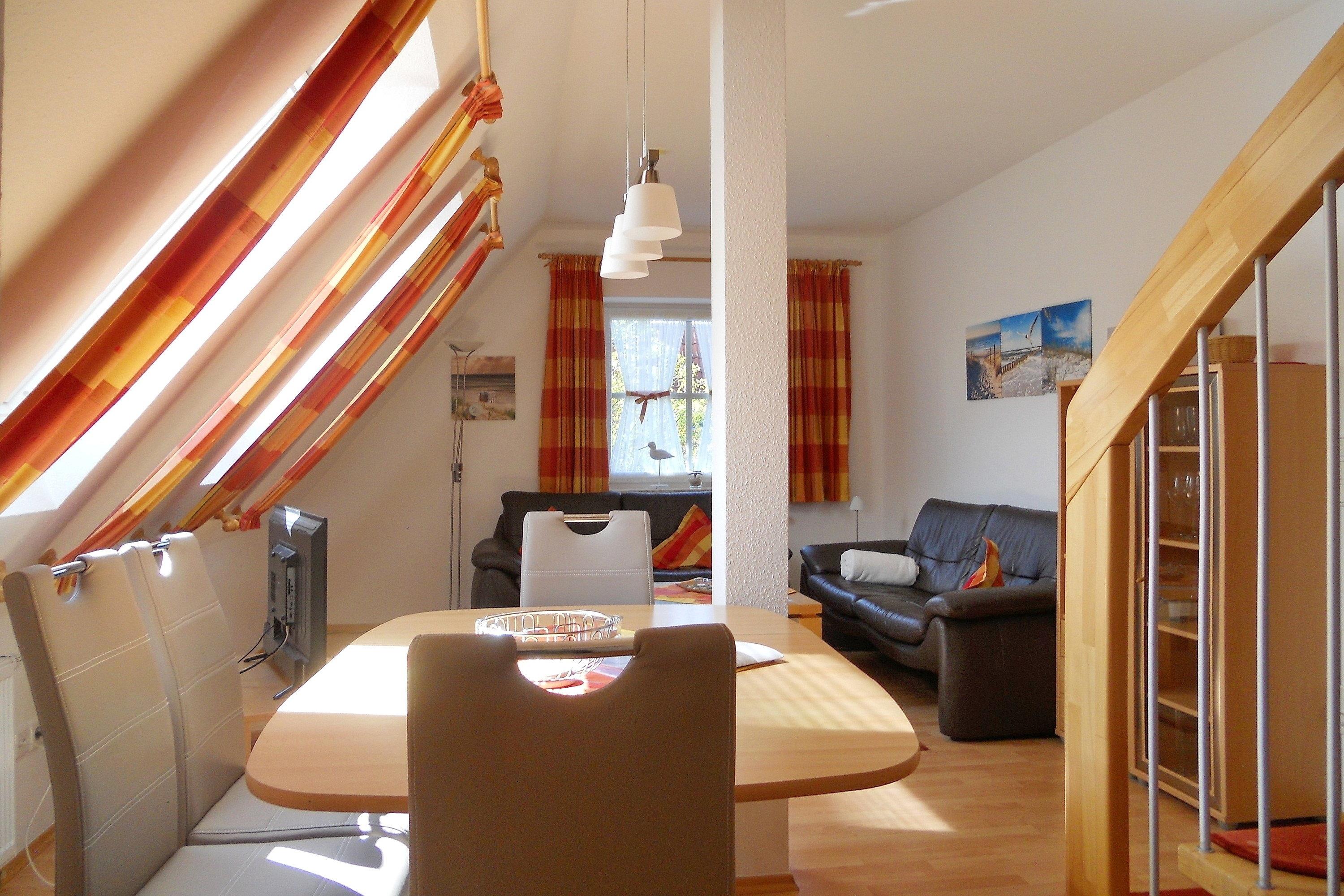Im Herzen von Wyk gelegen, befindet sich in ruhiger Lage unser Domizil Rugstieg 8 mit seinen 4 Ferienwohnungen für 2 bis 5 Personen. Die Wohnungen des Hauses sind allergiker- und kinderfreundlich eingerichtet. Unsere Wohnung Rugstieg 8/4 erstreckt sich über das erste und zweite Obergeschoß und bietet bis zu 4 Personen genügend Platz für herrliche Urlaubstage. Das gemütlich eingerichtete Wohnzimmer ist liebevoll gestaltet und technisch gut ausgestattet mit WLAN, Telefon, Stereoanlage, Flachbild-TV und DVD-Player. Hier befindet sich auch der Essplatz neben der Treppe, die hinaus zum offenen Dachgeschoss-Schlafzimmer mit Doppelbett führt. Auf der ersten Etage befindet sich weiterhin ein Schlafzimmer mit zwei Einzelbetten, das Bad mit Dusche und Föhn sowie die separate Küche mit Ceranfeld-Herd und Backofen, Geschirrspüler, Mikrowelle und vielem mehr. Probieren sie doch mal friesische Gerichte in Ihrem Urlaub aus. In der Wyker Innenstadt finden Sie freundliche Buchhändler, die schöne friesische Kochbücher anbieten. Im Untergeschoss des Hauses befindet sich eine Sauna mit einigen Fitnessgeräten sowie Waschmaschine und Trockner zur gemeinsamen kostenfreien Nutzung. Das gepflegte Haus mit dem idyllischen Garten liegt wenige Meter vom Wyker Stadtwäldchen mit dem Abenteuerspielplatz Löwenhöhle entfernt und lädt somit Jung und Alt zum Spazierengehen und Verweilen ein. In ca. 10 Gehminuten erreichen Sie den Strand und das Meer sowie die Fußgängerzone mit zahlreichen Cafés, kleinen Geschäften und Restaurants. Schauen Sie sich die Wohnungen an und überzeugen Sie sich selbst! Wir freuen uns auf Ihren Anruf.