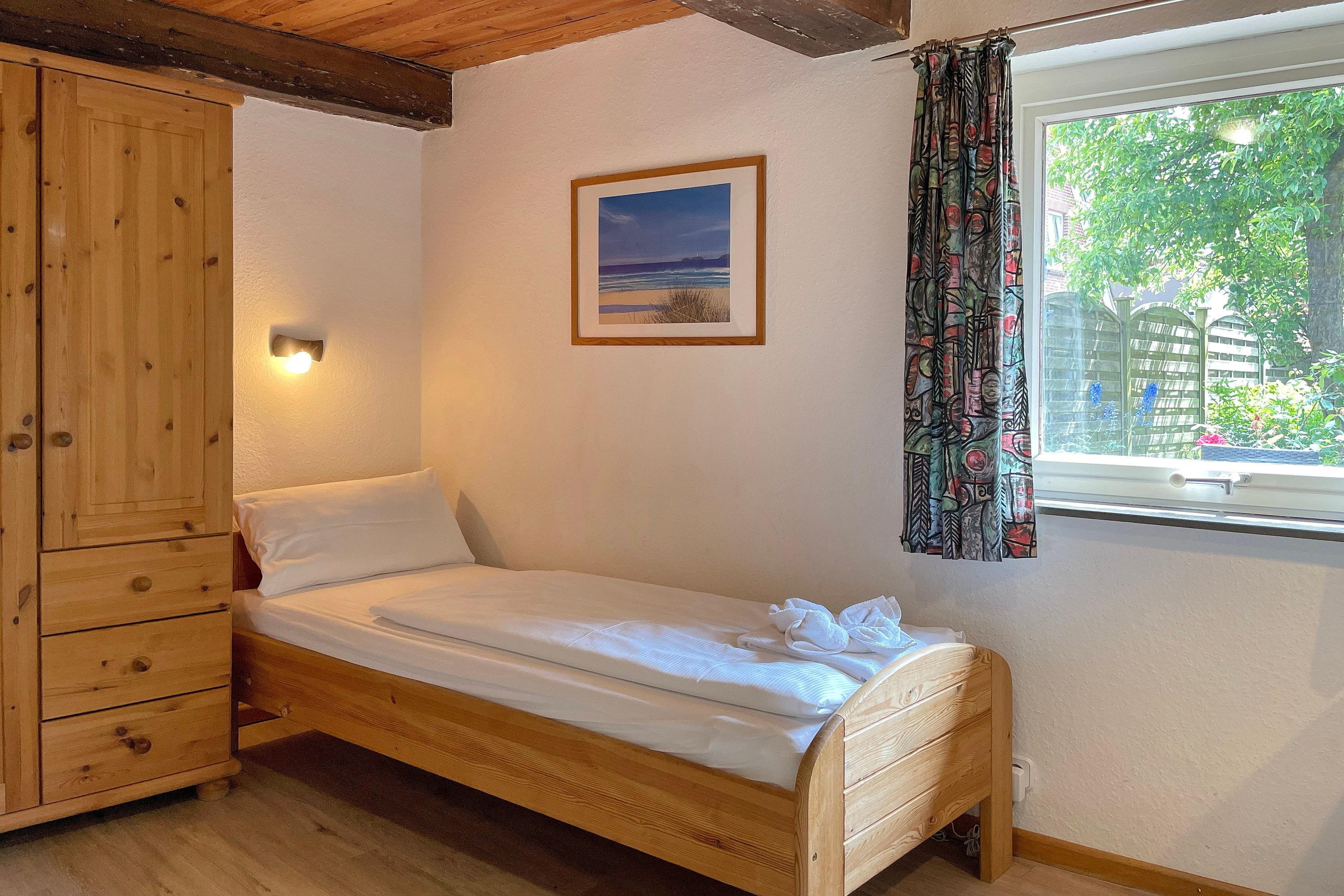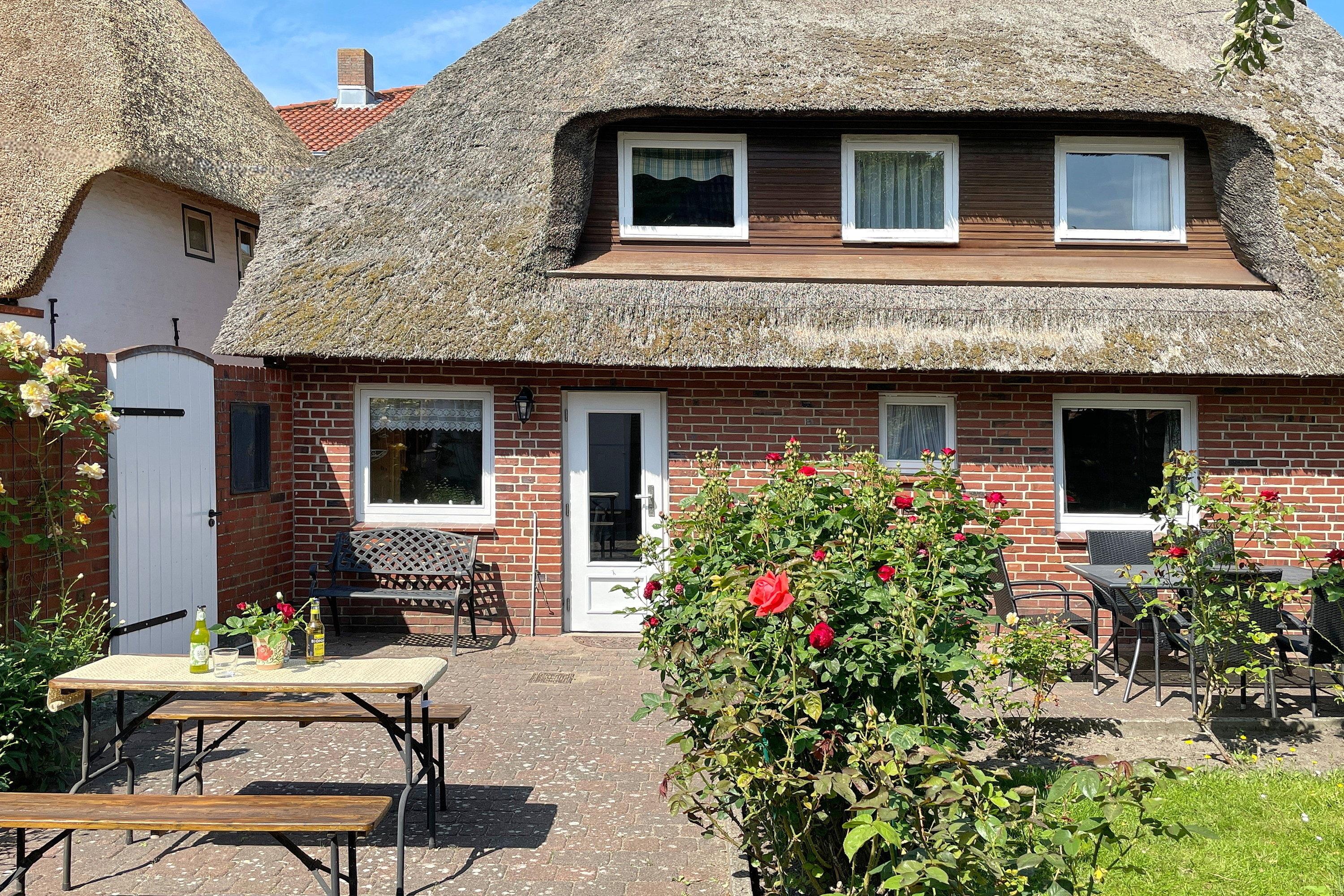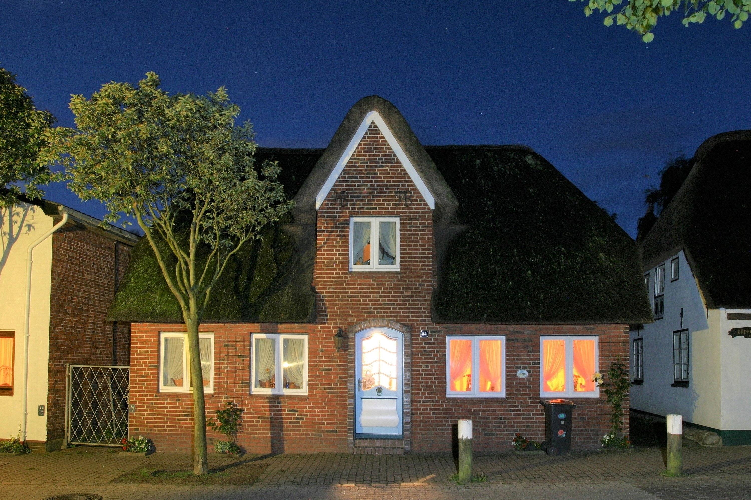 In der Hafenstaße im Herzen von Wyk liegt das gemütliche Haus Stamp, nur wenige Minuten vom Strand und vom Hafen entfernt. Alle wichtigen Versorgungseinrichtungen wie Bäckereien und Supermärkte befinden sich in unmittelbarer Umgebung, ebenso wie die Fußgängerzone und die Strandpromenade mit Boutiquen, Cafés, Kino, Restaurants und vielem mehr! Das Domizil Stamp ist ein reetgedecktes Friesenhaus für 6 Personen und heißt Sie mit seinem friesischen Charme Willkommen. Erleben Sie die friesische Gemütlichkeit und Gastfreundschaft in Ihrem Domizil. Im Erdgeschoss befinden sich 2 Schlafräume, eines mit Doppelbett (140 x 200 cm), das andere mit 2 Einzelbetten (80 x200 cm) und einem zusätzlichem Waschbecken. Das gemütliche Wohnzimmer mit WLAN, Musikanlage und Flachbild-TV lädt zum Entspannen ein und wirkt behaglich. Die Wohnküche mit Essplatz, Geschirrspüler, Backofen, Mikrowelle, Kaffeemaschine und vielem mehr führt Sie auf die Terrasse und den Garten, wo Sie herrliche Sonnenstunden im Sommer verbringen können. Eine kleine Besonderheit stellt die altfriesische Durchreiche ins Wohnzimmer dar. Auf beiden Etagen befindet sich ein Duschbad, das funktional und liebevoll gestaltet wurde. Das dritte Schlafzimmer mit einem Doppelbett (180 x 200cm) und einem zusätzlichem Kojenbett (80 x 180 cm) erreichen Sie über die Treppe, die zum ersten Obergeschoss führt. Hier gibt es weiterhin einen zusätzlichen Wohnraum mit einem weiteren Kojenbett (80x180cm), der sich hervorragend eignet, wenn Sie sich einmal zurückziehen möchten.