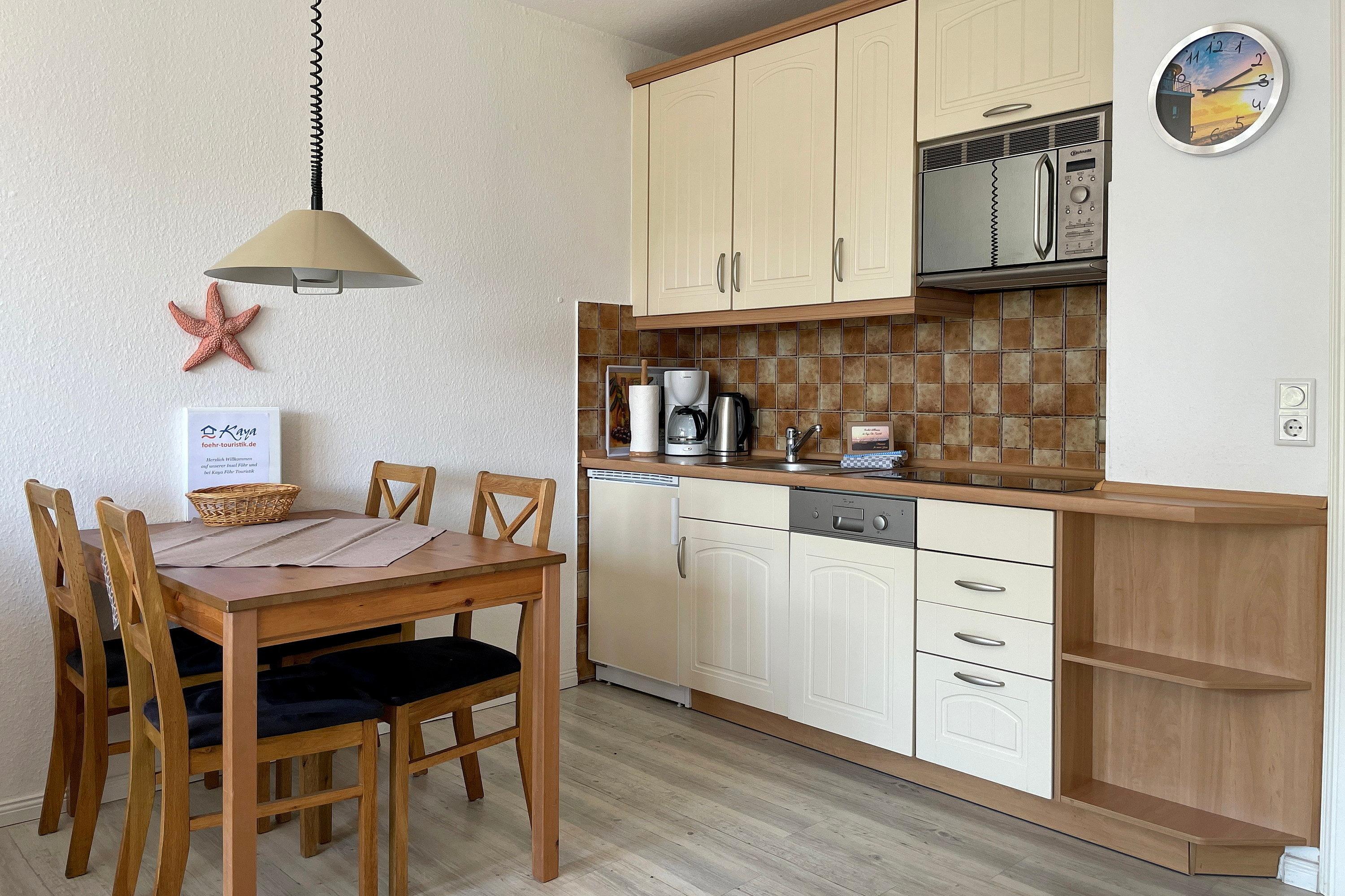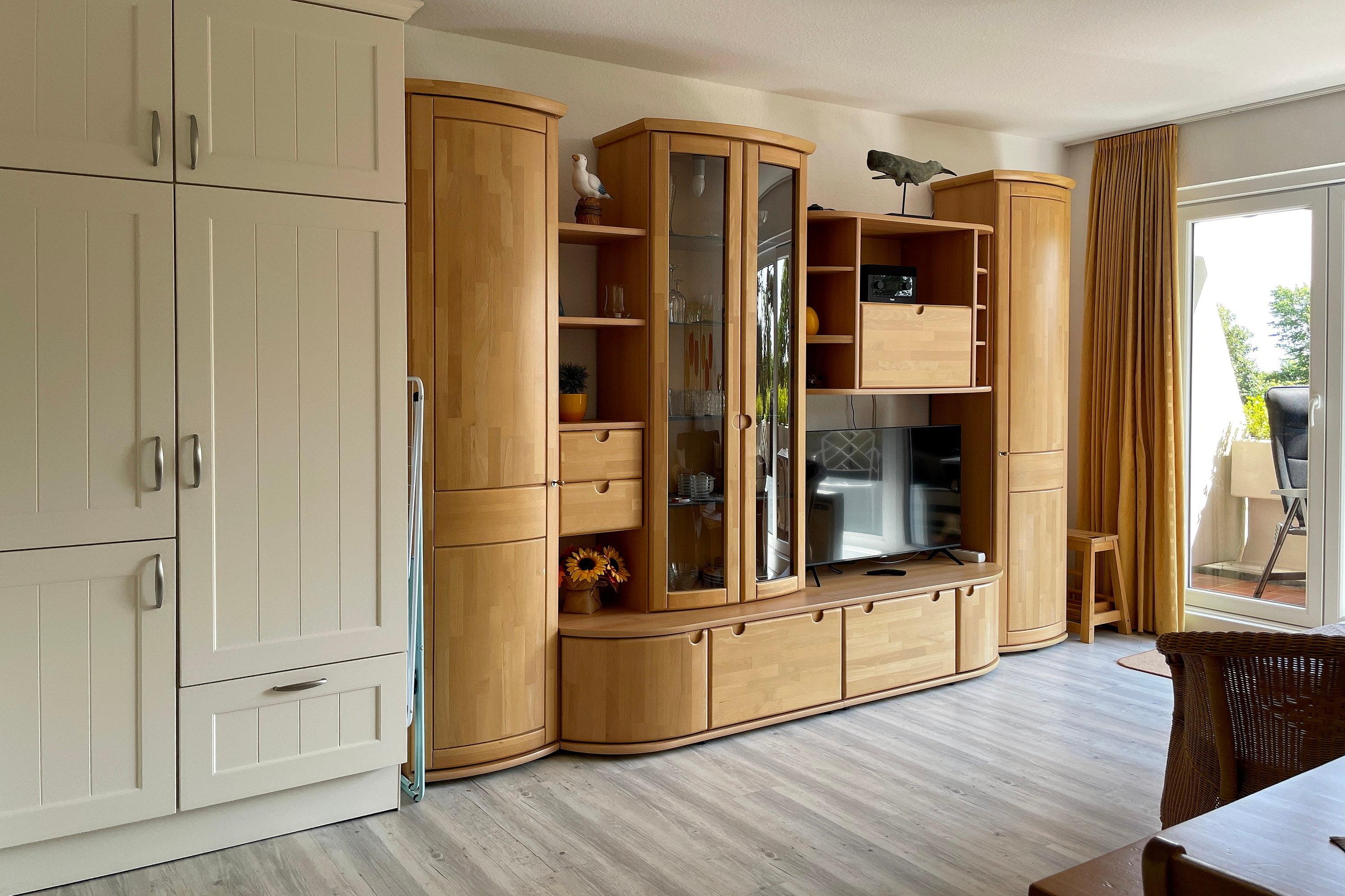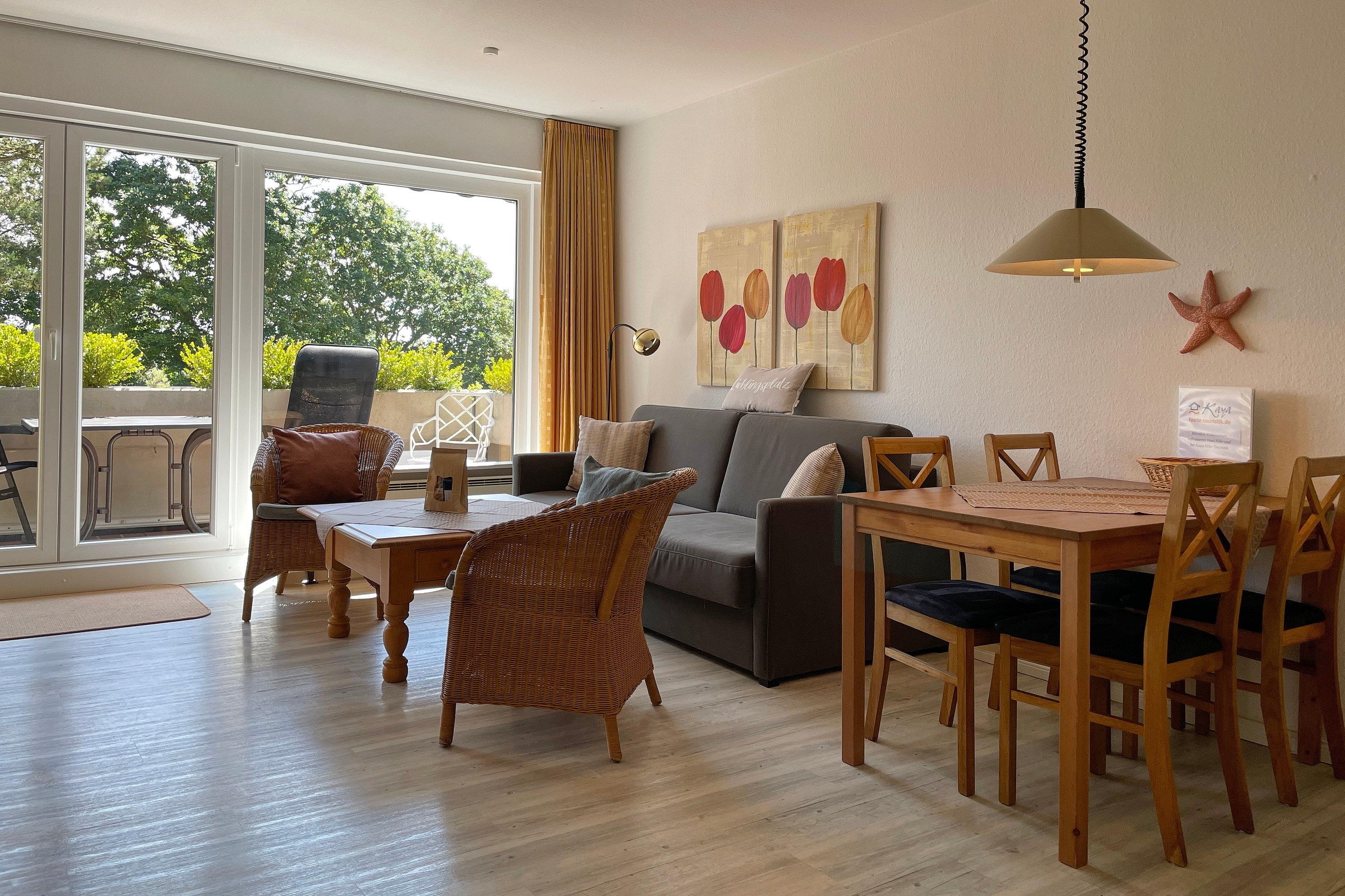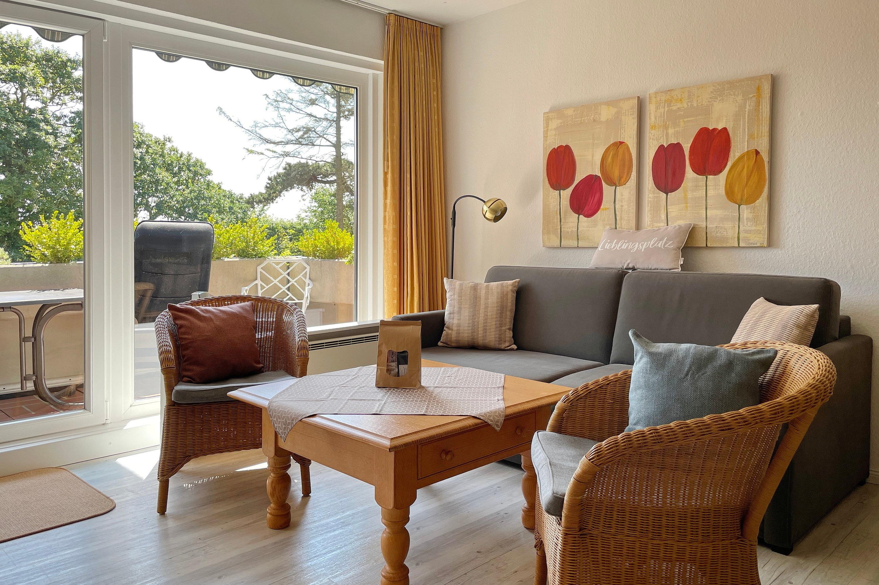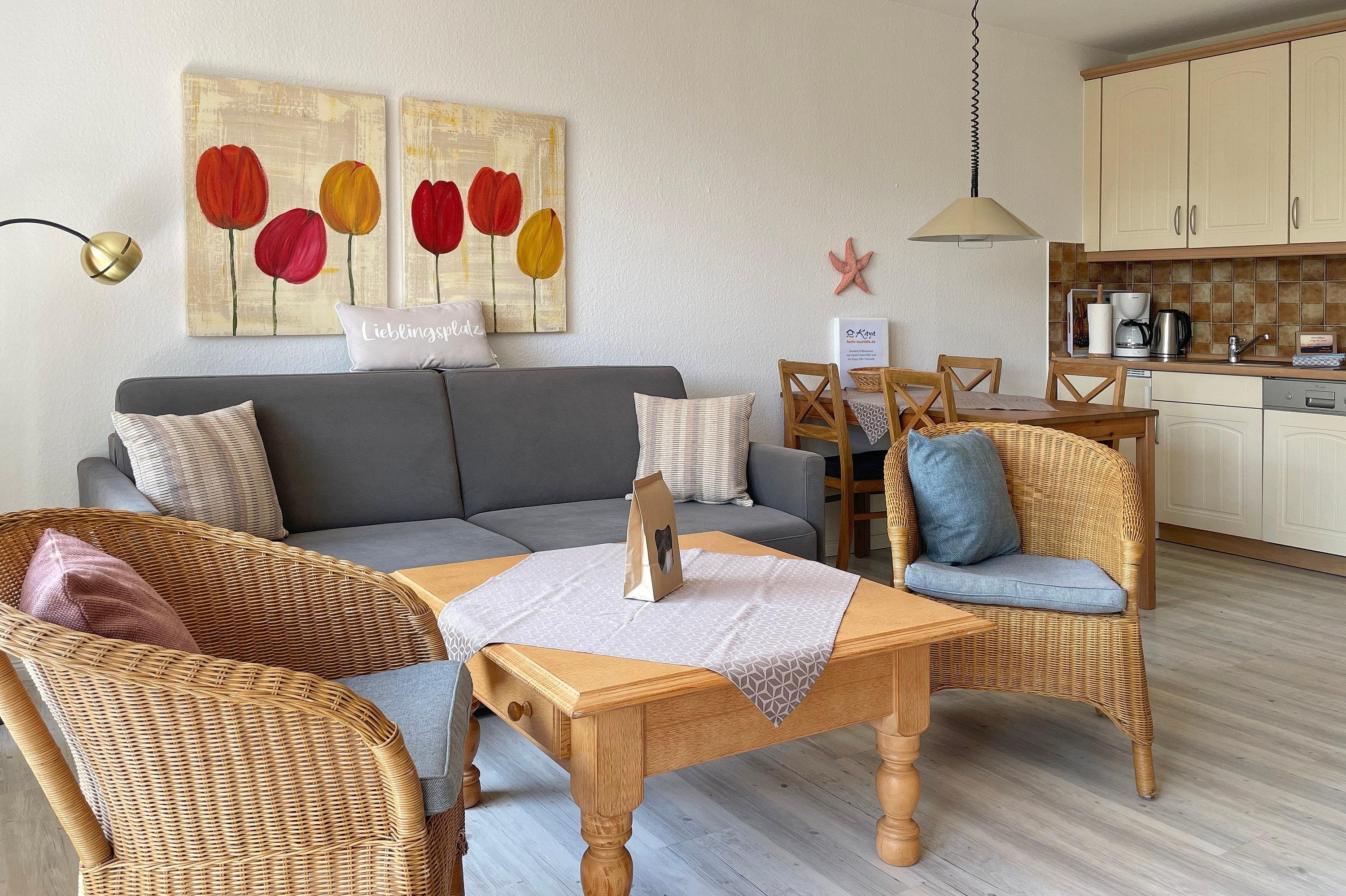 Unsere einladende Wohnung "Watt'n Blick" befindet sich nahe des Wyker Leuchtturms nur einen Katzensprung vom Strand entfernt und eignet sich für 2 Personen hervorragend für einen erholsamen Urlaub. Das Wohnzimmer mit hochwertiger Schlafcouch (170x190cm), integrierter Essecke und gut ausgestatteter Küchenzeile ist mit WLAN, Internet- TV und einer Stereoanlage sowie einer kleinen Auswahl an Büchern ausgestattet. Von hier aus gelangen Sie auf den Balkon mit einer automatisch ausfahrbaren Markise. Das kleine Duschbad mit Handtuchheizung ist funktional eingerichtet und im separaten Schlafzimmer mit Doppelbett (140 x 200 cm) können Sie ruhige Nächte erleben. Waschmaschine und Trockner stehen zur gemeinschaftlichen Nutzung gegen eine geringe Gebühr bereit und zur Wohnung gehört ein eigener PKW-Stellplatz.