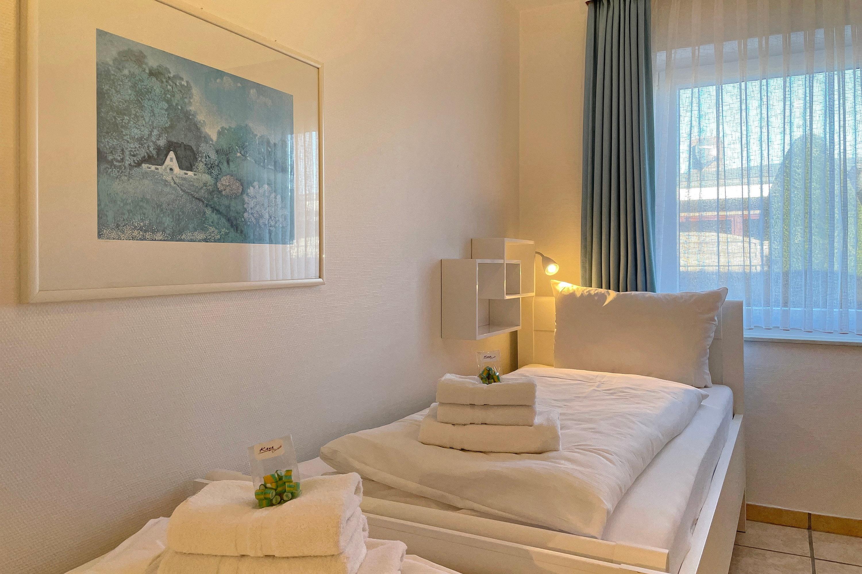 In zentrale und ruhiger Lage befindet sich die Anlage Gästehäuser Lindemann mit seinen 6 Ferienwohnungen auf einem 2000 qm großen und gepflegten Grundstück. Verbringen Sie Ihren Urlaub in einer der freundlich eingerichteten ca. 42 qm großen Ferienwohnungen, die alle sehr ähnlich eingerichtet sind und einen erholsamen Urlaub für 2 Personen anbieten. Das Wohnzimmer mit integrierter Essecke und Küchenzeile ist gemütlich eingerichtet und mit Flachbild-TV, Wlan und Telefon ausgestattet. Von hier aus gelangen Sie auf die Terrasse, die in den Sommermonaten mit Gartenmöbeln ausgestattet ist. Die neu eingebaute Küchenzeile mit Mikrowelle, Geschirrspüler, Ceranfeldherd und Kühlschrank mit Gefrierfach lädt zum Kochen ein. Weiterhin erreichen Sie über den Flur das Badezimmer mit Dusche, Fenster und Doppelwaschtisch sowie ein Schlafzimmer mit 2 Einzelbetten (90 x 200 cm) und Kleiderschrank. Das im Wohnzimmer befindliche Schrankbett (180 x200 cm) dient als Ausweichmöglichkeit, falls Sie getrennt schlafen möchten. Die Wohnungen eignen sich auch hervorragend für befreundete Pärchen, die zusammen Ihren Urlaub verbringen, doch gerne ein wenig Privatsphäre dabei haben möchten. Sie finden in unmittelbarer Nähe alles, was Sie benötigen vom Einkaufladen, über den Bäcker, zu gemütlichen Cafés und Restaurants bis zur Wyker Innenstadt. Strand ud Meer sind auch nicht weit entfernt und jederzeit einen Spaziergang wert. Ein gemeinschaftlicher Parkplatz am Haus und eine gemeinschaftlich, nutzbare Waschmaschine runden das Angebot ab.