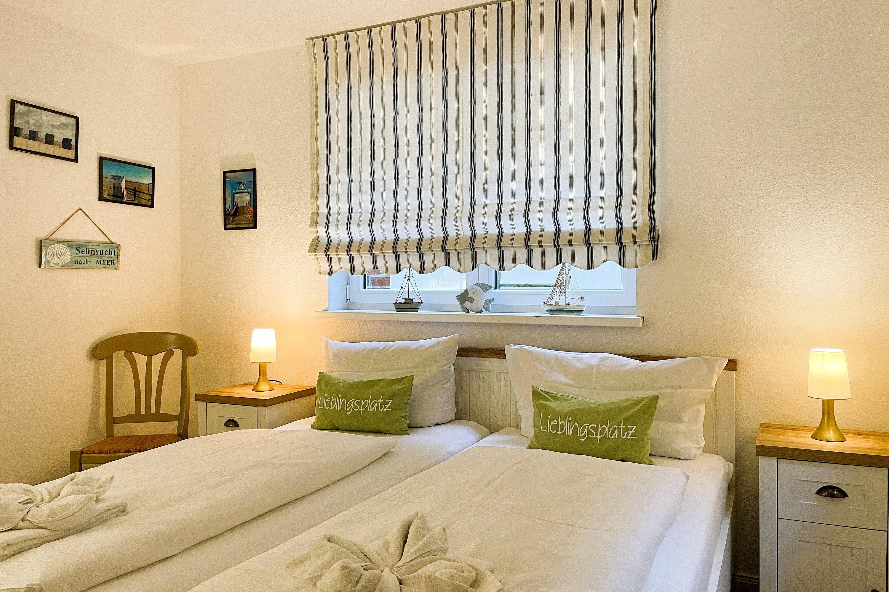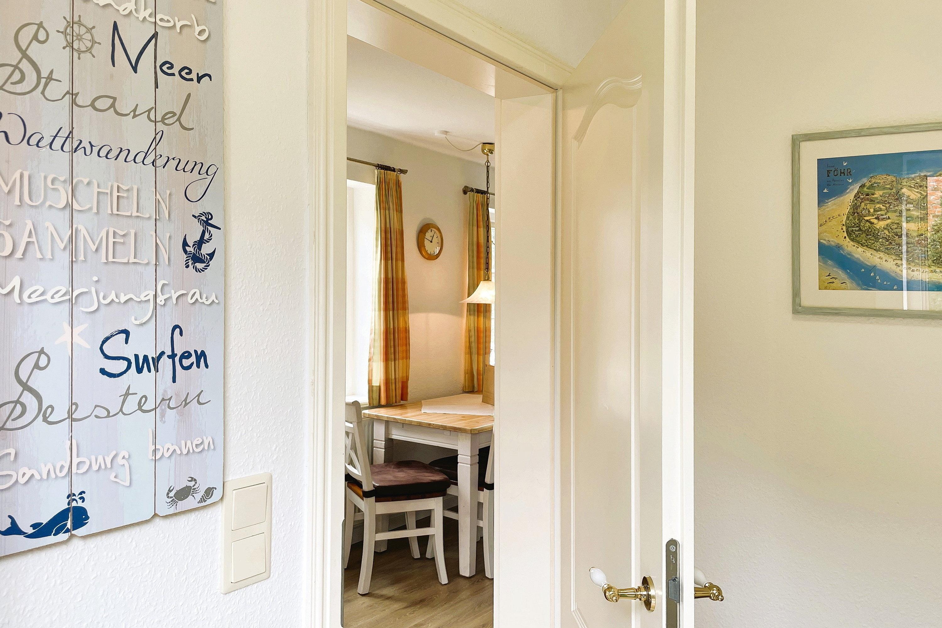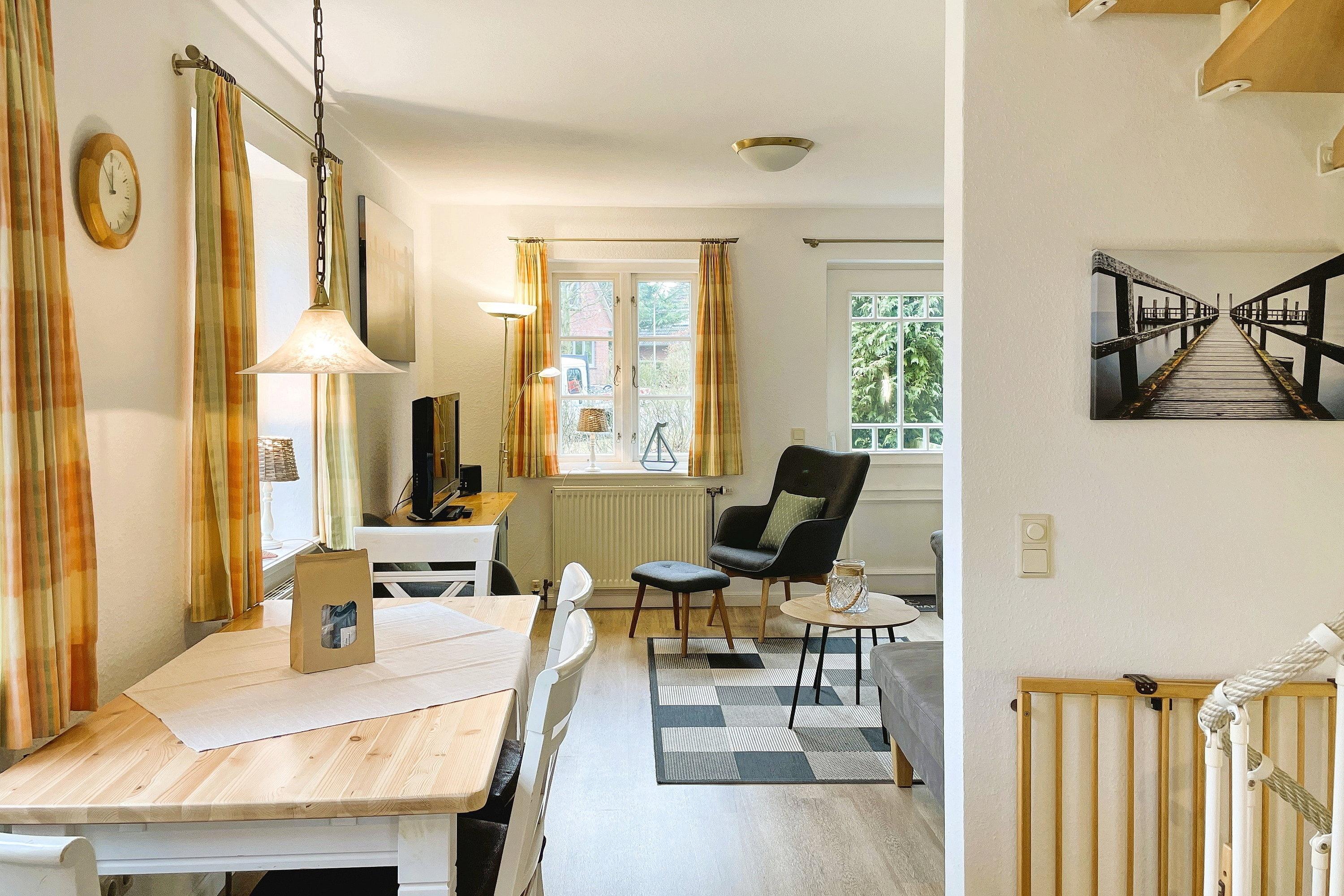 HARTELK WELKIMEN ÜÜS GREEN EILUN Herzlich Willkommen auf unserer grünen Insel! Durch die Reihenhausendlage und die Fenster wirkt diese Wohnung hell und freundlich. Sie wurde renoviert und erstreckt sich auf ca. 75m, teilweise mit Fußbodenheizung über 4 Etagen. Im Erdgeschoss des Hauses befindet sich der offene Wohn- Essbereich mit Küche. Die Küche bietet Hobbyköchen eine gute Ausstattung und der anliegende Essbereich ist für 6 Personen ausgelegt. Modern und einladend gestaltet sich der Wohnbereich mit WLAN, Flachbild-TV, Radio, CD und DVD-Player sowie einer kleinen Filmauswahl. Von hier aus gelangen Sie auf die kleine, geschützte Südterrasse mit Gartenmöbeln und Gartenliege (im Sommer). Genießen Sie eine entspannte Auszeit. Über eine gut begehbare Treppe gelangen Sie in die oberen Stockwerke. Hier befindet sich im ersten OG ein großzügiges Bad mit Badewanne und genügend Ablagefläche und ein liebevoll gestaltetes Schlafzimmer mit Doppelbett(2 Boxspringbetten 0,90 x 2 m)und Kleiderschrank. Eine Galerie mit 2 vollwertigen Einzelbetten (90 x 200 cm) befindet sich direkt unter dem Dach. Die Galerie ist jedoch nicht für Kleinkinder geeignet! Im Untergeschoss befindet sich das dritte Schlafzimmer mit Doppelbett (180 x200 cm), Kleiderschrank und einem zweiten Flachbild-TV, ein kleines vollwertiges Duschbad sowie der Hauswirtschaftsraum mit der Waschmaschine, die Ihnen kostenfrei zur Verfügung steht. In diesem Domizil werden Sie wunderschöne Urlaubstage verbringen können.