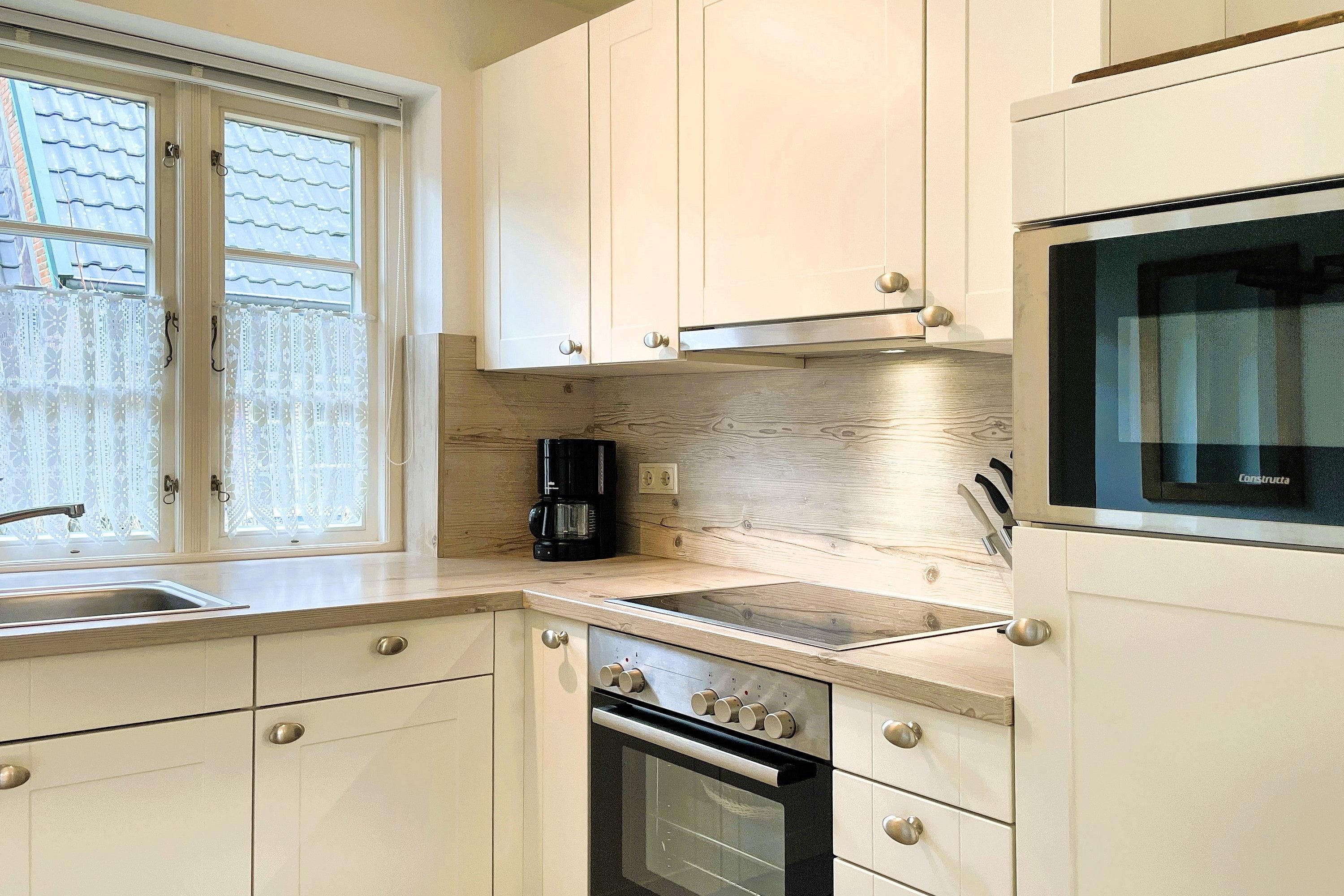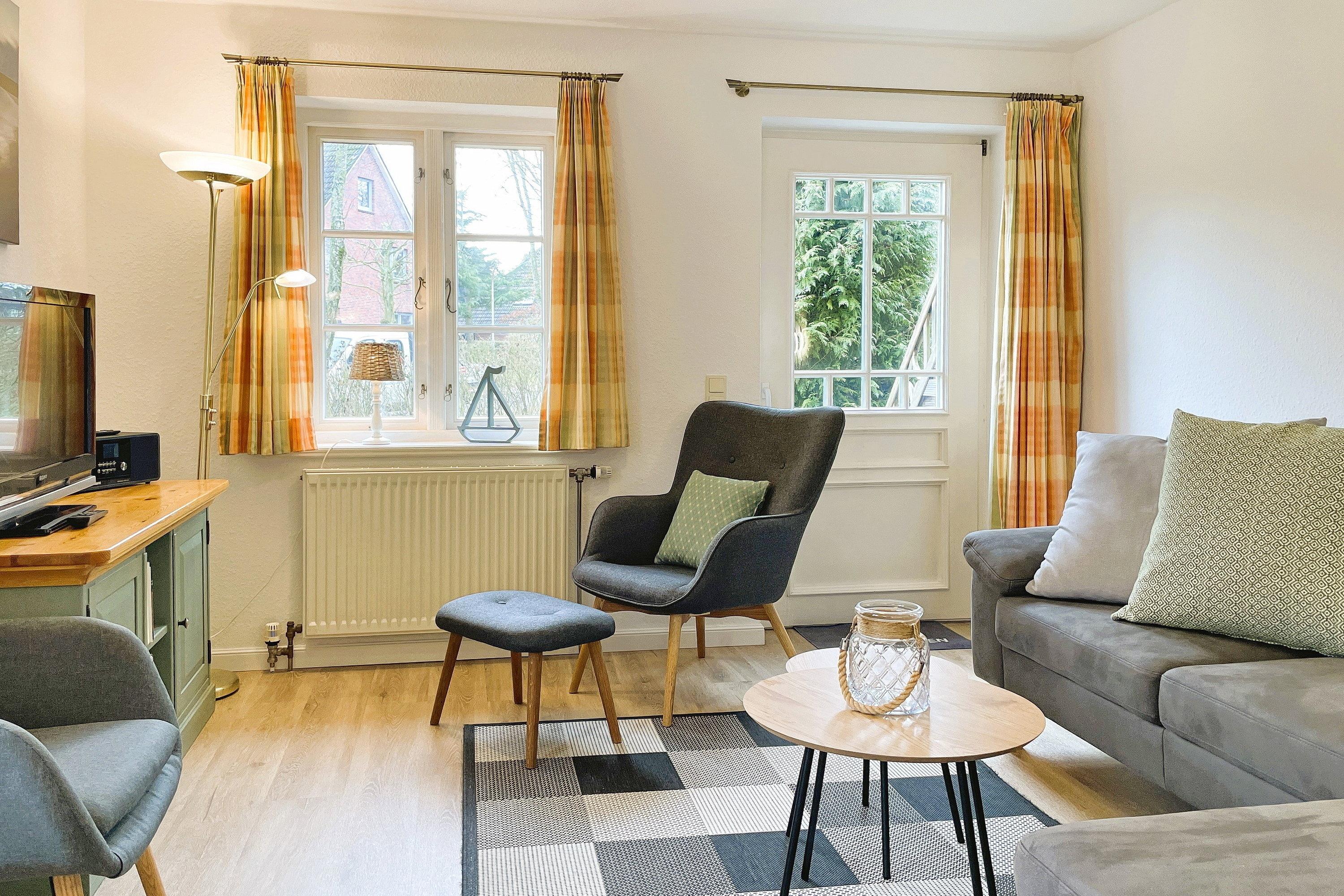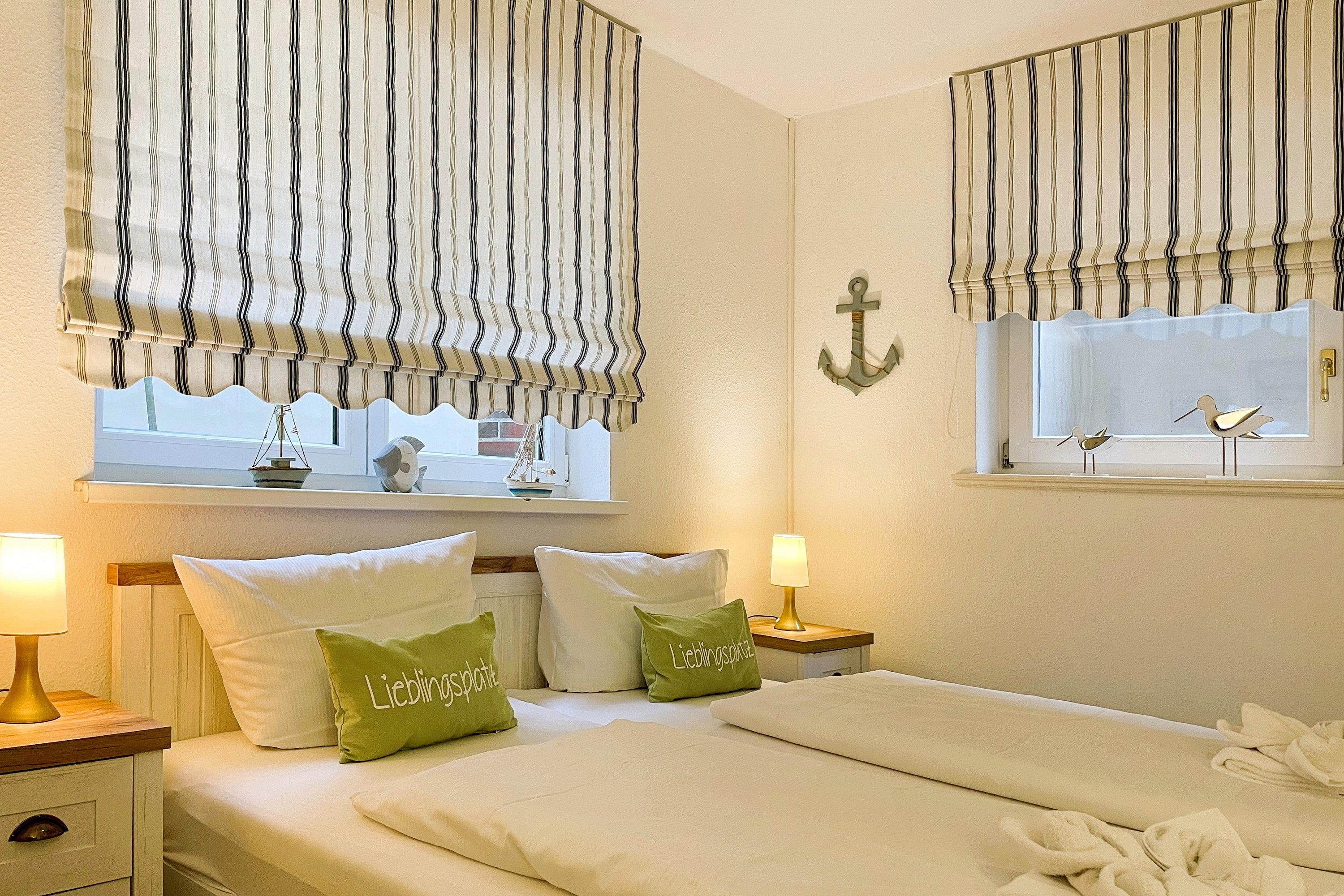 HARTELK WELKIMEN ÜÜS GREEN EILUN Herzlich Willkommen auf unserer grünen Insel! Durch die Reihenhausendlage und die Fenster wirkt diese Wohnung hell und freundlich. Sie wurde renoviert und erstreckt sich auf ca. 75m, teilweise mit Fußbodenheizung über 4 Etagen. Im Erdgeschoss des Hauses befindet sich der offene Wohn- Essbereich mit Küche. Die Küche bietet Hobbyköchen eine gute Ausstattung und der anliegende Essbereich ist für 6 Personen ausgelegt. Modern und einladend gestaltet sich der Wohnbereich mit WLAN, Flachbild-TV, Radio, CD und DVD-Player sowie einer kleinen Filmauswahl. Von hier aus gelangen Sie auf die kleine, geschützte Südterrasse mit Gartenmöbeln und Gartenliege (im Sommer). Genießen Sie eine entspannte Auszeit. Über eine gut begehbare Treppe gelangen Sie in die oberen Stockwerke. Hier befindet sich im ersten OG ein großzügiges Bad mit Badewanne und genügend Ablagefläche und ein liebevoll gestaltetes Schlafzimmer mit Doppelbett(2 Boxspringbetten 0,90 x 2 m)und Kleiderschrank. Eine Galerie mit 2 vollwertigen Einzelbetten (90 x 200 cm) befindet sich direkt unter dem Dach. Die Galerie ist jedoch nicht für Kleinkinder geeignet! Im Untergeschoss befindet sich das dritte Schlafzimmer mit Doppelbett (180 x200 cm), Kleiderschrank und einem zweiten Flachbild-TV, ein kleines vollwertiges Duschbad sowie der Hauswirtschaftsraum mit der Waschmaschine, die Ihnen kostenfrei zur Verfügung steht. In diesem Domizil werden Sie wunderschöne Urlaubstage verbringen können.