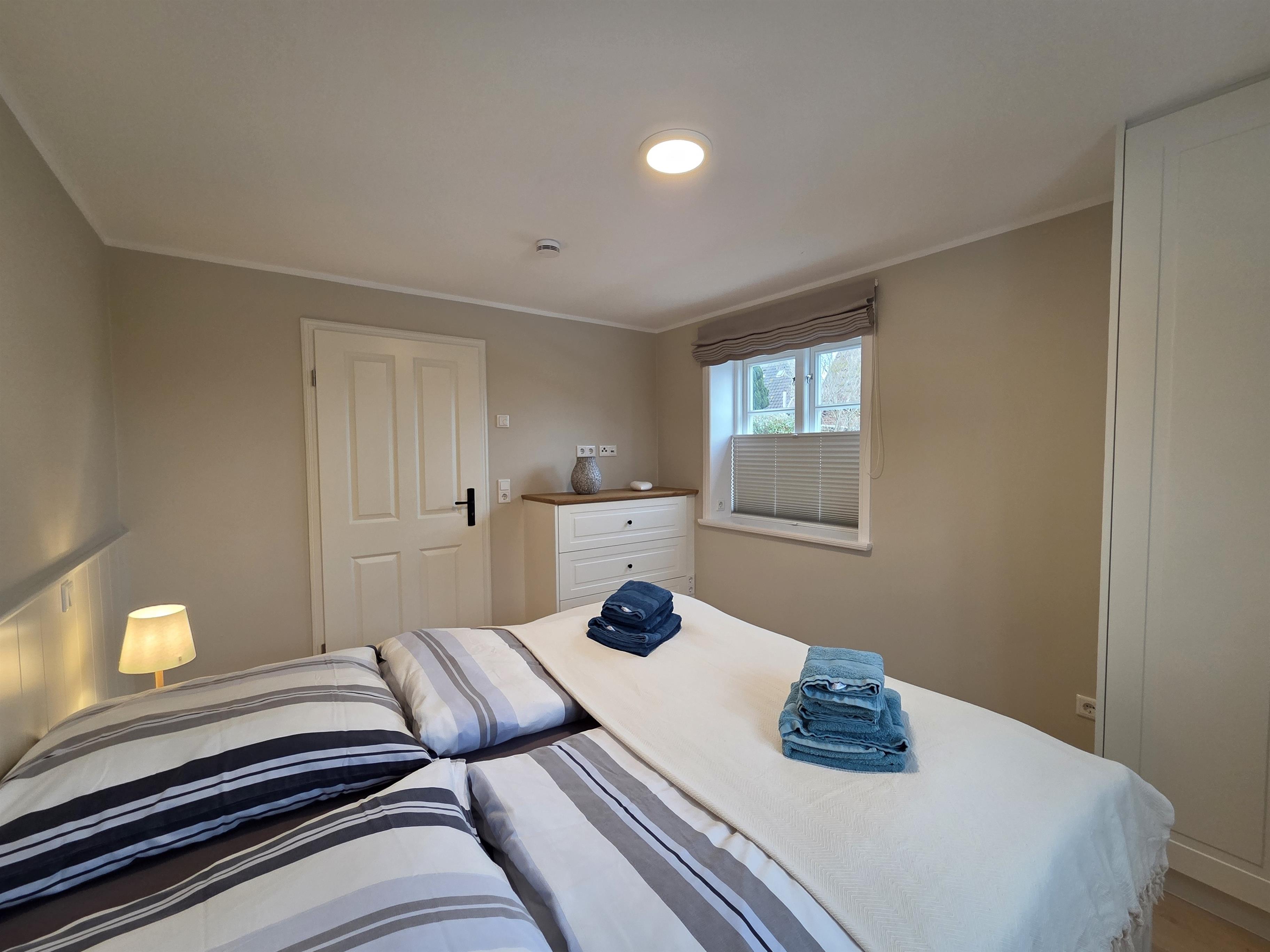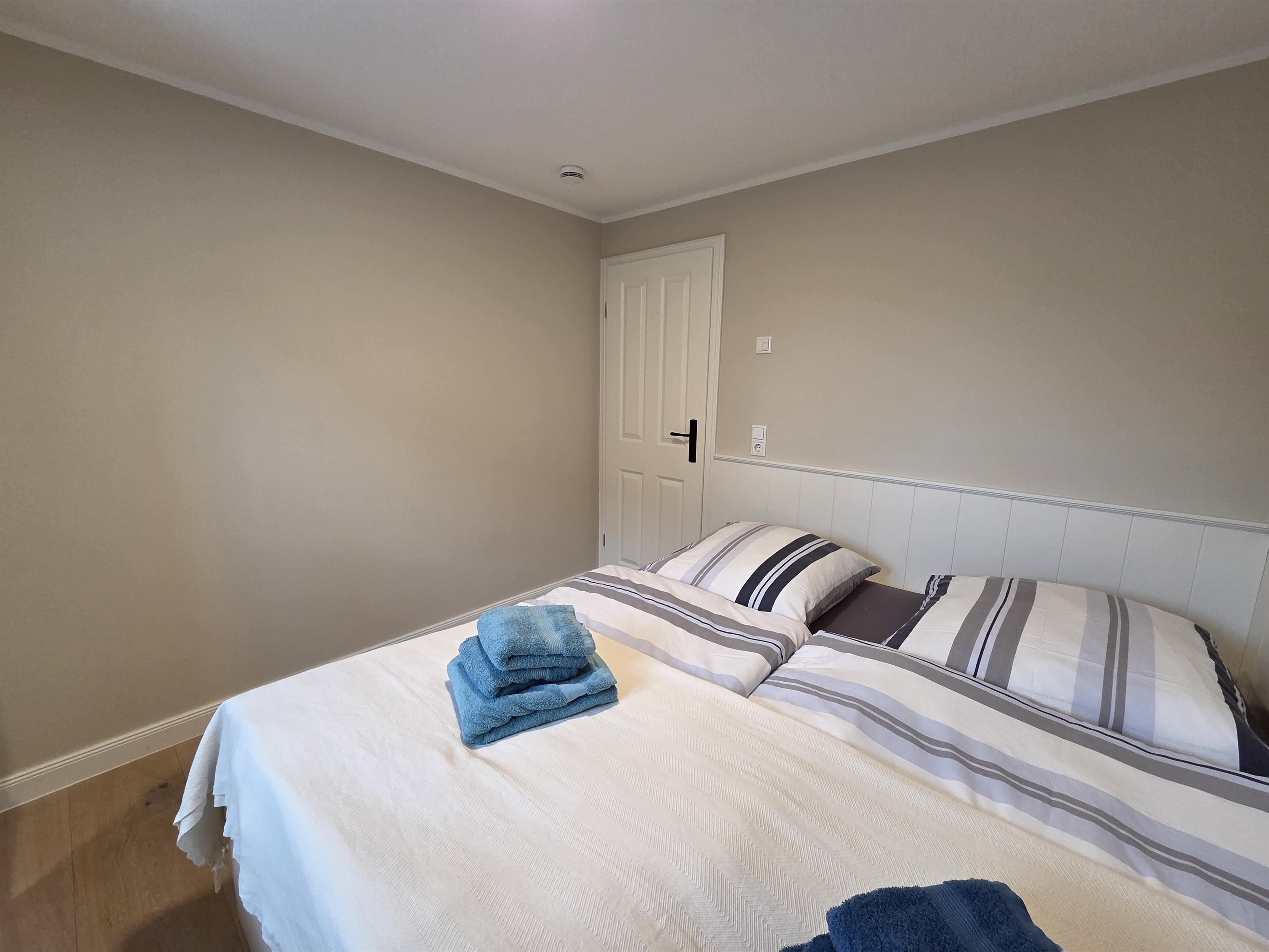 Die Ferienwohnung verfügt über zwei Schlafzimmer, jeweils mit komfortablem Doppelbett (180 × 200 cm) und Kleiderschrank, die für erholsamen Schlaf sorgen. Das moderne Bad mit Dusche/WC ist funktional ausgestattet, zusätzlich stehen Haartrockner sowie Waschmaschine und Trockner zur Verfügung.