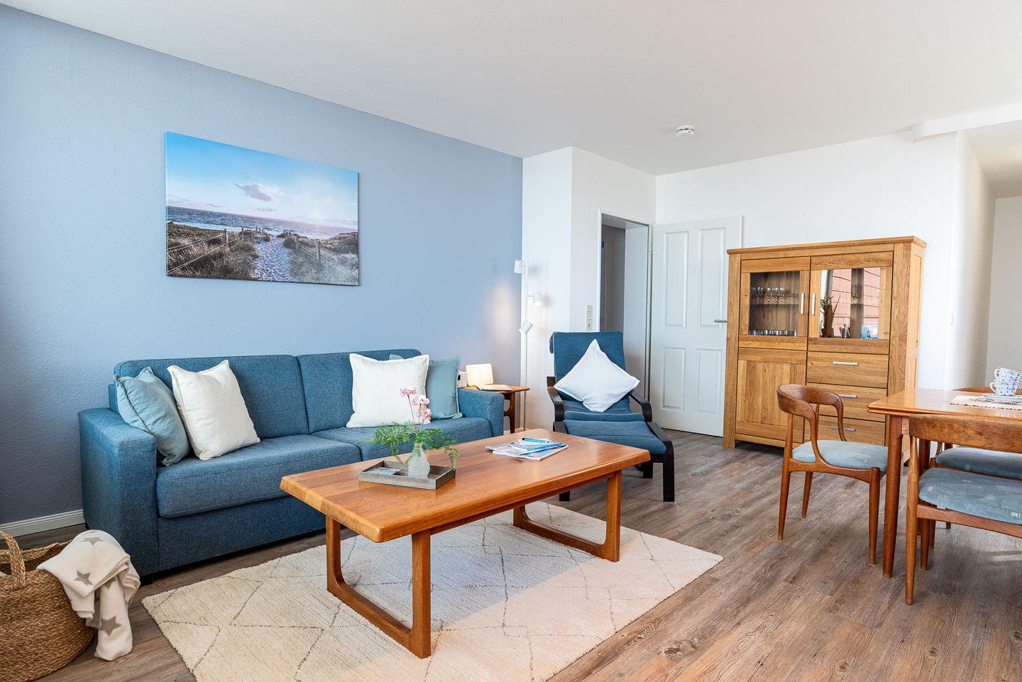 Die Wohnung 45 liegt im 6. OG, ist ca. 50 qm groß und für 2 bis 4 Personen eingerichtet. Sie besteht aus einem Wohnzimmer, einem Schlafzimmer, einer vom Wohnzimmer abgehenden Küchenzeile, einem Wannenbad mit WC sowie einem Flur. Der vom Wohnzimmer aus zugängliche, überdachte Balkon hat Südlage und bietet einen herrlichen Blick über die Nordsee, die Halligen und den Strand. Balkonmöbel sind vorhanden. Der gesamte Wohn- und Schlafbereich ist mit Parket ausgelegt und beinhaltet ein Schlafsofa als Schlafmöglichkeit für die dritte und vierte Person. Das Mobiliar ist überwiegend in Teakholz gehalten. Bei dieser Wohnung haben Sie Schwimmbadbenutzung im Hause.