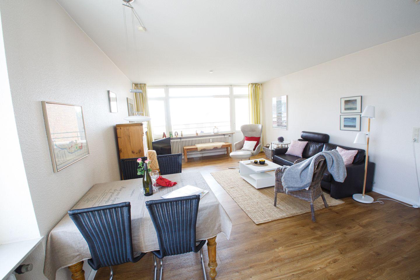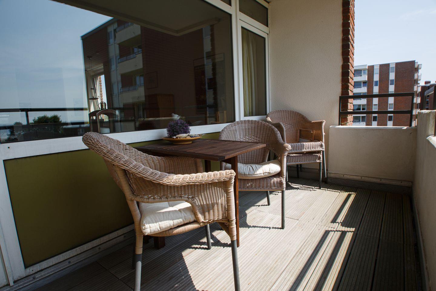 Der überdachte Südbalkon bietet außerdem einen wunderschönen Meerblick. Bei dieser Wohnung haben Sie die Möglichkeit, das Schwimmbad im Nachbarhaus Uthlande zu benutzen. Der WLAN-Zugang ist kostenlos.