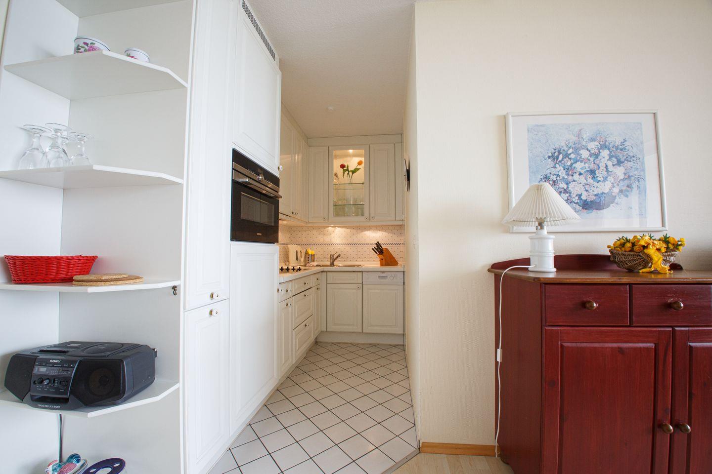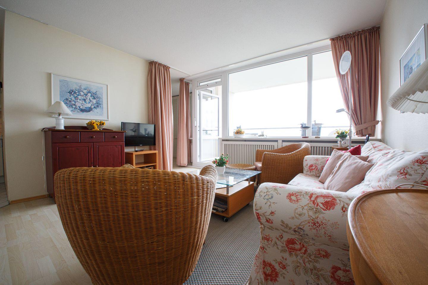 Ein traumhafter Blick erwartet Sie hier für einen traumhaften Urlaub. Die Wohnung befindet sich im 4.OG und ist hell und freundlich für bis zu vier Personen eingerichtet. Sie besteht aus einem gemütlichen Wohnzimmer mit Südbalkon. Es befinden sich zwei Schlafzimmern mit jeweils einem 160cm Doppelbett. Die Küchenzeile ist mit allen modernenen Geräten ausgestattet.Das neu renovieret Bad bietet eine Walkinn Dusche mit modernem Flair. Wohn- und Schlafbereiche sind mit Laminat ausgelegt, Küche und Bad sind gefliest. Die Wohnung ist sehr geschmackvoll und mit vielen kleinen Accessoires liebevoll eingerichtet.