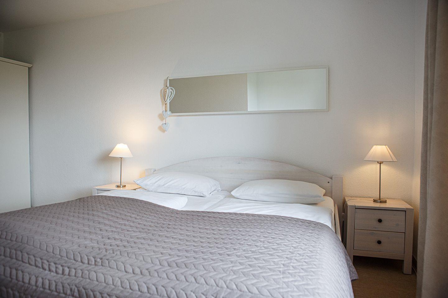 Die Wohnung ist großzügig geschnitten und bietet mit insgesamt drei Zimmern, darunter zwei separate Schlafzimmer, ausreichend Platz für bis zu vier Personen. Sie eignet sich daher besonders für Familien oder Paare, die Wert auf Komfort, Ruhe und eine ausgezeichnete Infrastruktur legen. Der lichtdurchflutete Wohnbereich ist mit einem gemütlichen Sofa, einem Sessel, einer Kommode sowie einer modernen Essgruppe ausgestattet und bietet direkten Zugang zu einem überdachten Balkon, der zusätzlich Schutz bei jedem Wetter garantiert. Hier lassen sich entspannte Stunden mit Aussicht auf die Umgebung verbringen.