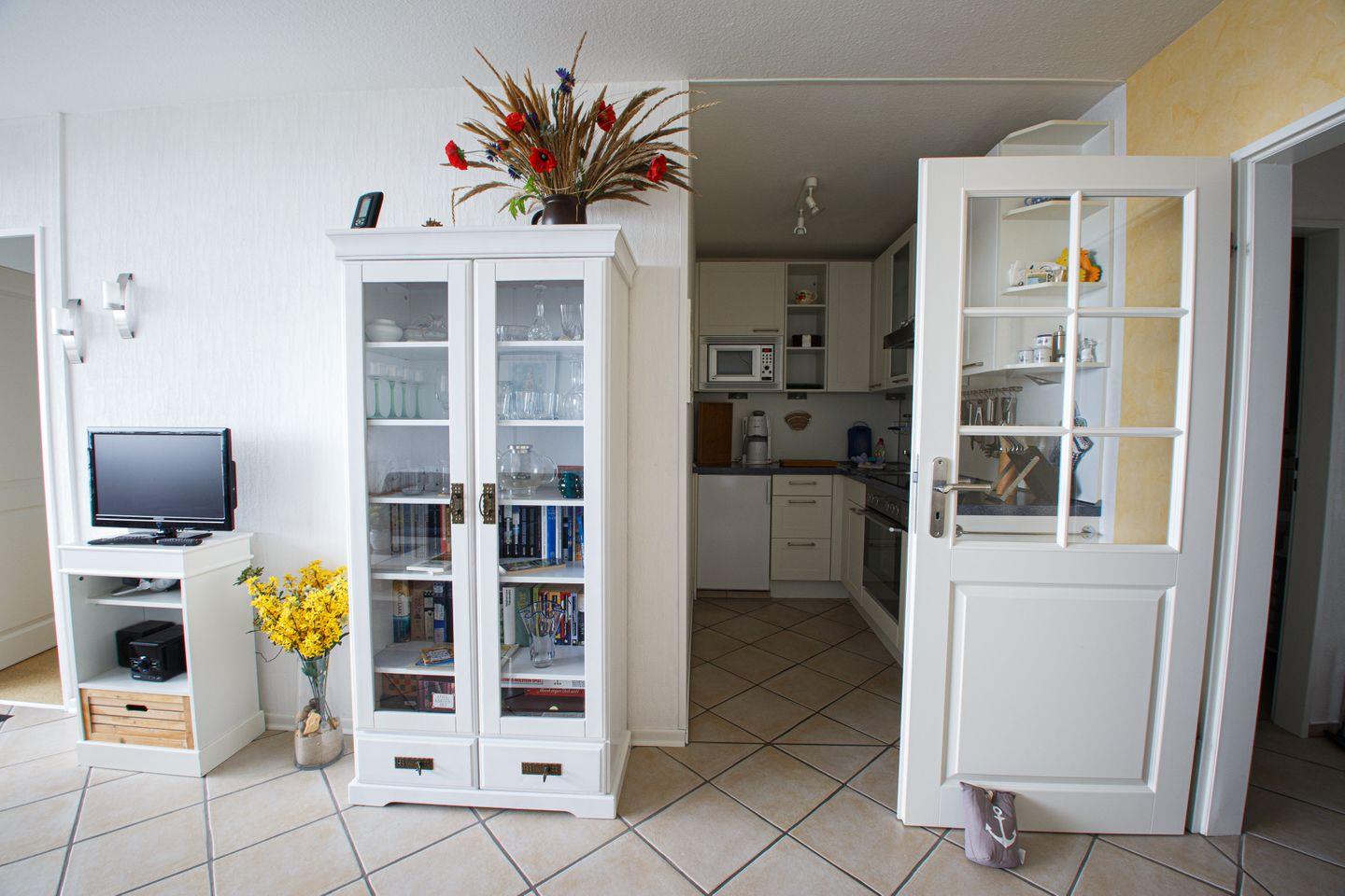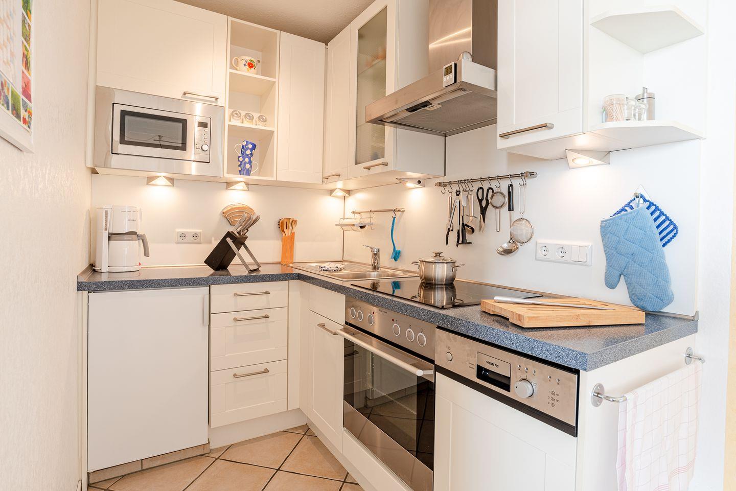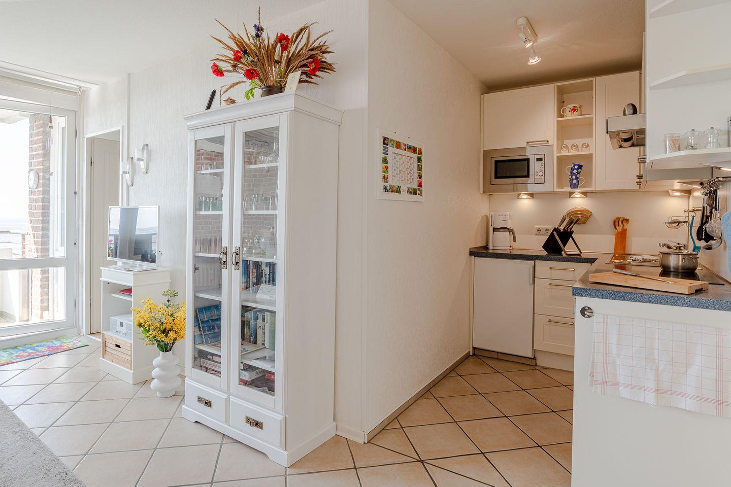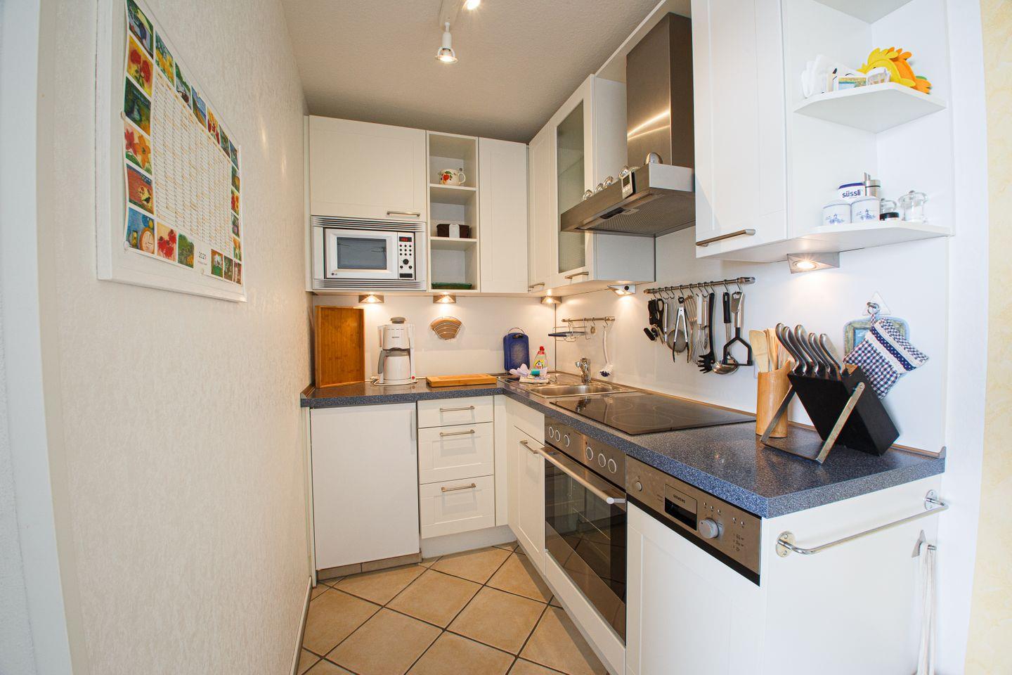 Das Wohnzimmer ist mit Fliesenboden, einer bequemen Sofaecke und einem Lesesessel ausgestattet. Von hier aus gelangen Sie direkt zum offen gestalteten Essbereich und zur voll ausgestatteten Küche. Die Küchenausstattung lässt mit Ceranfeld, Backofen, Mikrowelle, Kühlschrank mit Gefrierfach, Spülmaschine, Toaster, Kaffeemaschine, Wasserkocher sowie sämtlichem Geschirr und Küchenutensilien keinerlei Wünsche offen. Ein Esstisch und bequeme Stühle sorgen für gemeinsame Mahlzeiten in angenehmer Atmosphäre.