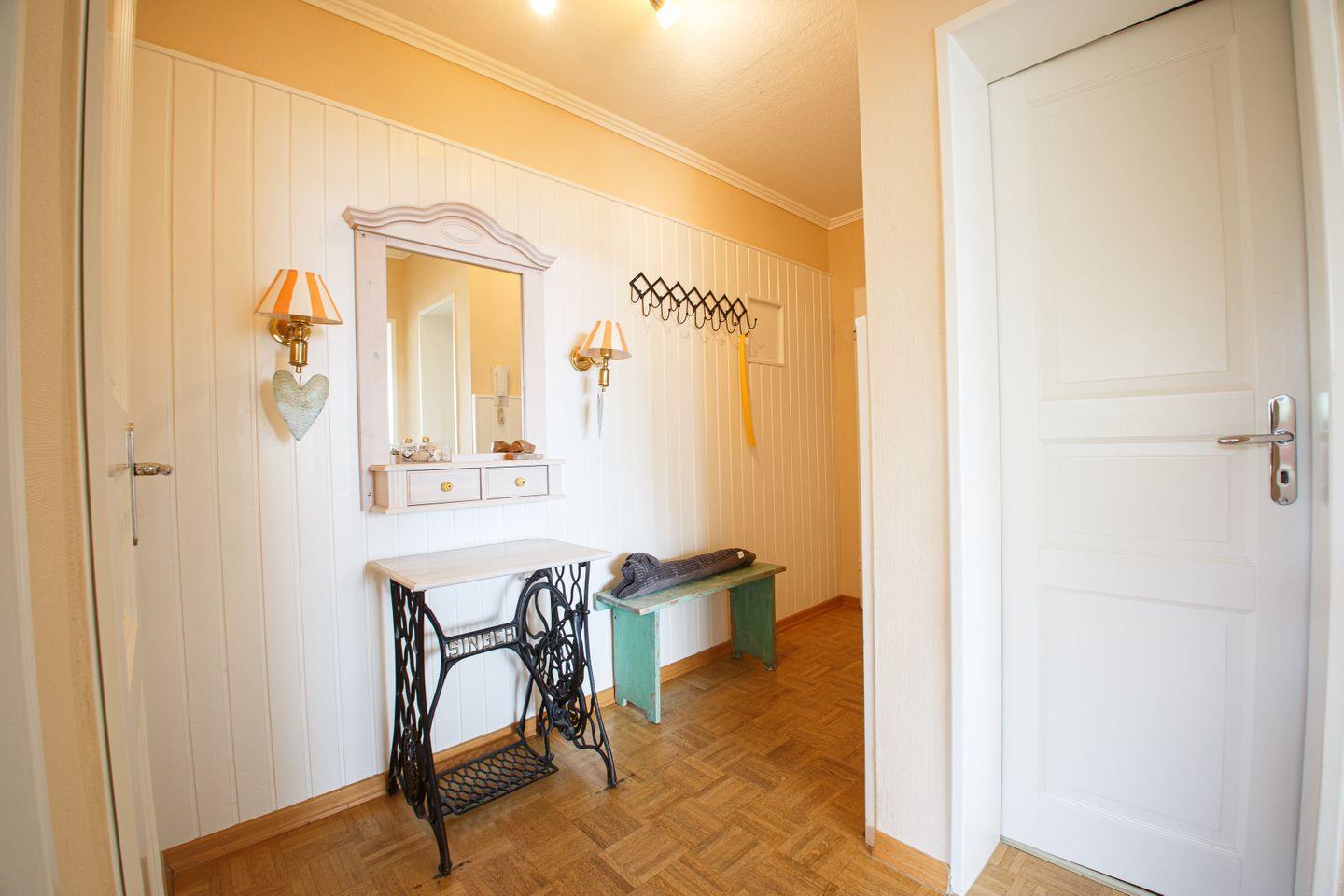 Die Wohnung Oland 11 liegt im 2. OG und verfügt über ca. 55qm, die ausreicehend Raum für 4 Personen bietet. Sie besteht aus einem Wohnraum, zwei Schlafräumen, einer Küche, einem Duschbad mit WC und einem Flur. Der Balkon in Südlage bietet einen schönen Blick auf die Nordsee. Die Wohn- und Schlafräume sind mit Laminat ausgelegt, die Küche und das Bad sind gefliest. Die Wohnung ist hell und freundlich eingerichtet. Geschmackvolle Bilder und Vorhänge geben eine gemütliche Atmosphäre. Bei dieser Wohnung haben Sie die Gelegenheit der Schwimmbadbenutzung im Nachbarhaus Uthlande.