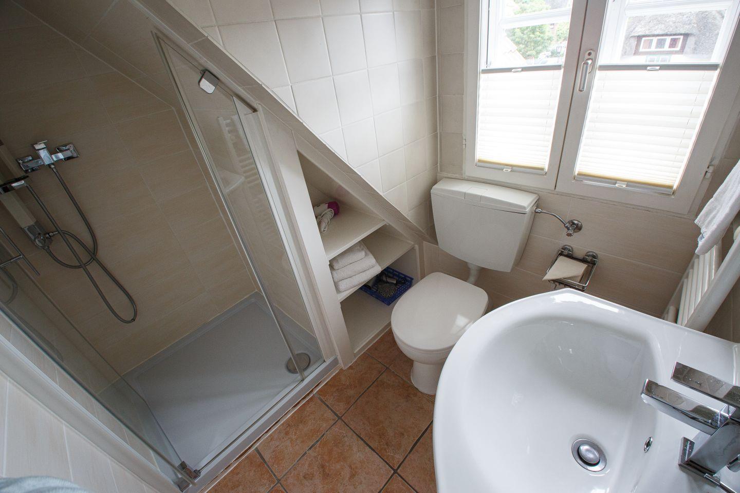 Das Schlafzimmer ist mit Teppichboden ausgestattet und bietet eine erholsame Schlafmöglichkeit für zwei Personen. Die großen Fenster sind mit Sichtschutz versehen und bieten einen ruhigen Ausblick in den Garten. Das Badezimmer verfügt über eine Dusche mit Wanneneinstieg, WC, Waschbecken, Spiegel sowie einen Haartrockner. Hand- und Badetücher, Bettwäsche und Reinigungsmittel werden zur Verfügung gestellt. Selbstverständlich stehen Ihnen auch ein Staubsauger, ein Wäscheständer und ein Wäscheservice zur Verfügung.
